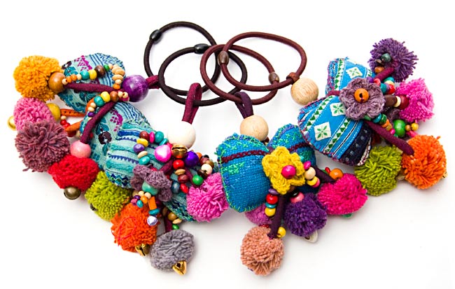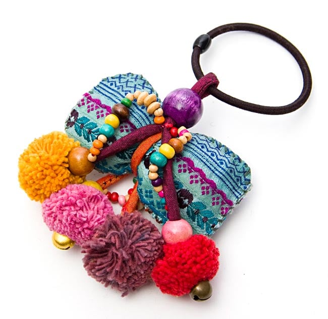 カラフルなモン族の布とじゃらじゃらついたポンポンがとっても可愛いヘアゴム。