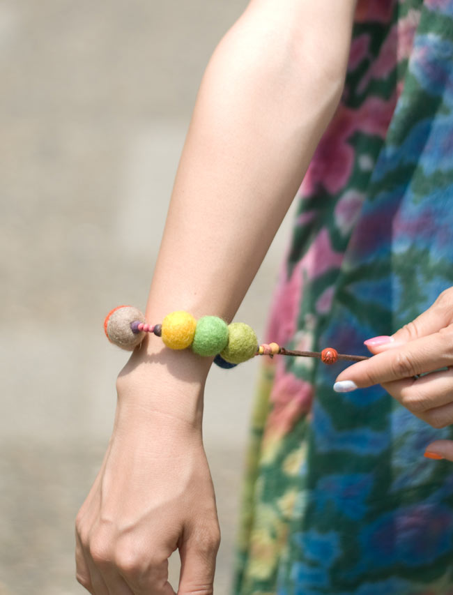 カラフルなフェルトがとてもキュートなブレスです。ひとつひとつ異なる色で、間にはウッドビーズが使用されており、温かい雰囲気たっぷりです。■しっかりした作りの秘密はワイヤーにあり