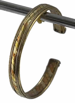 三色の銅(黄銅・青銅・白銅)を交互に編みこんでつくった幸運を呼ぶバングルです。