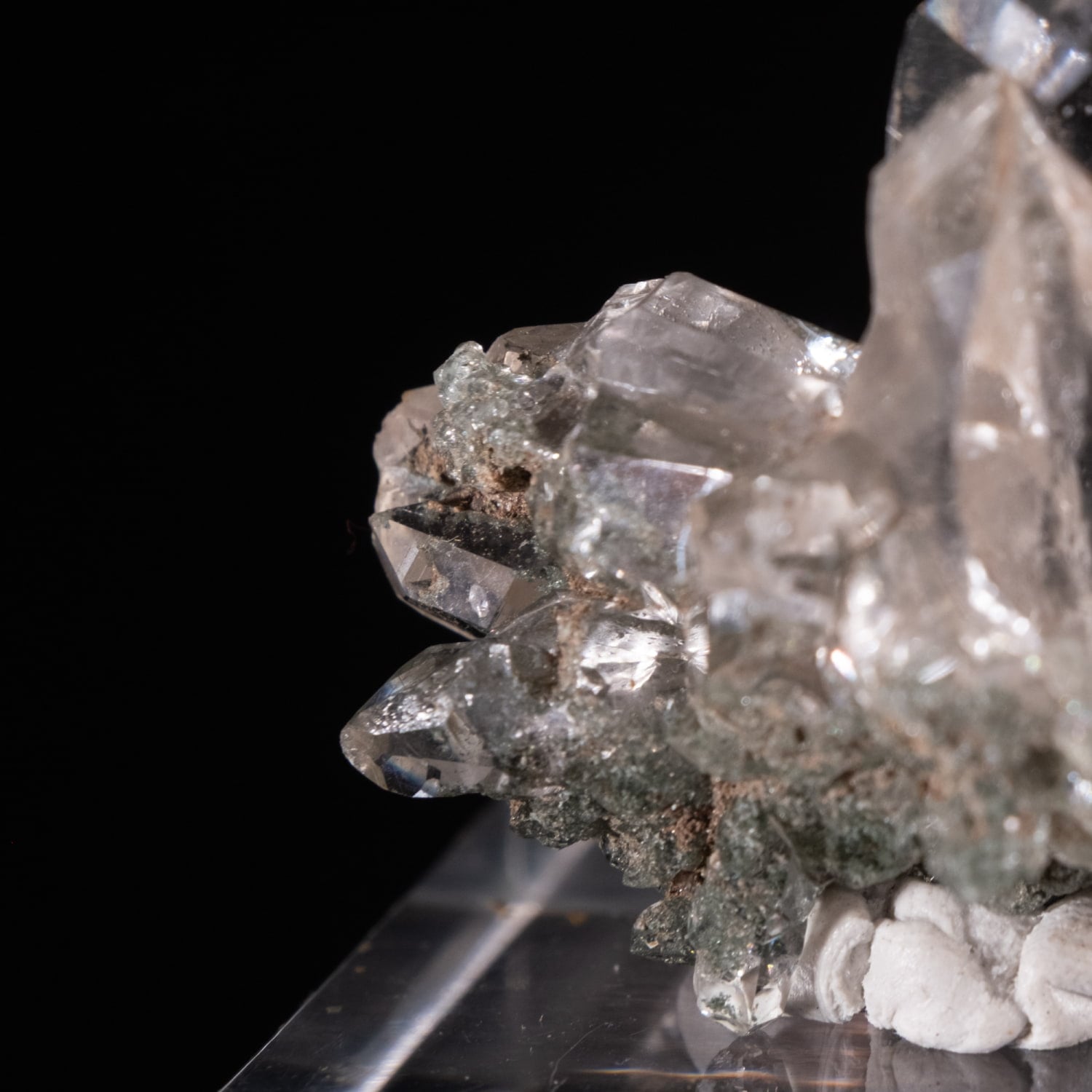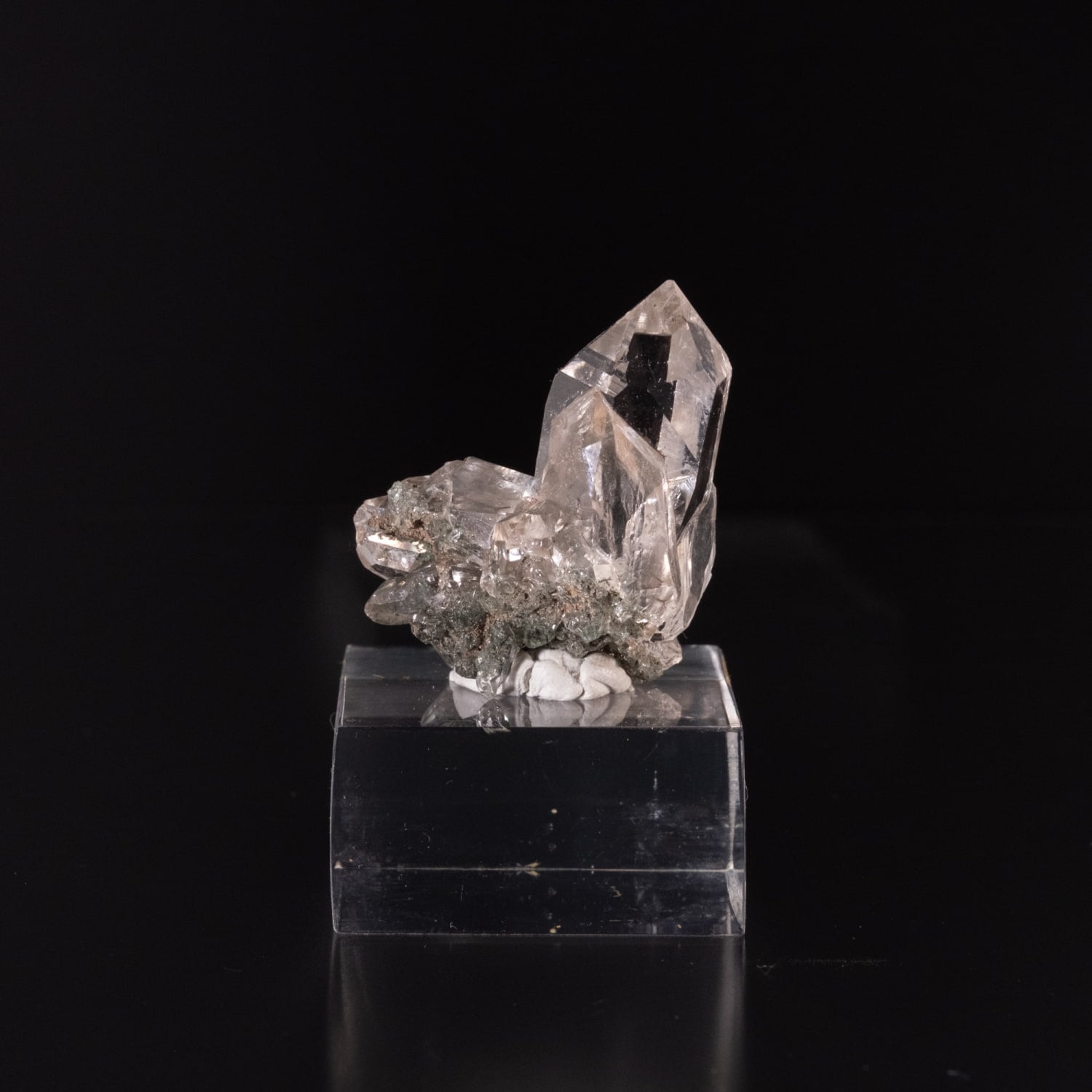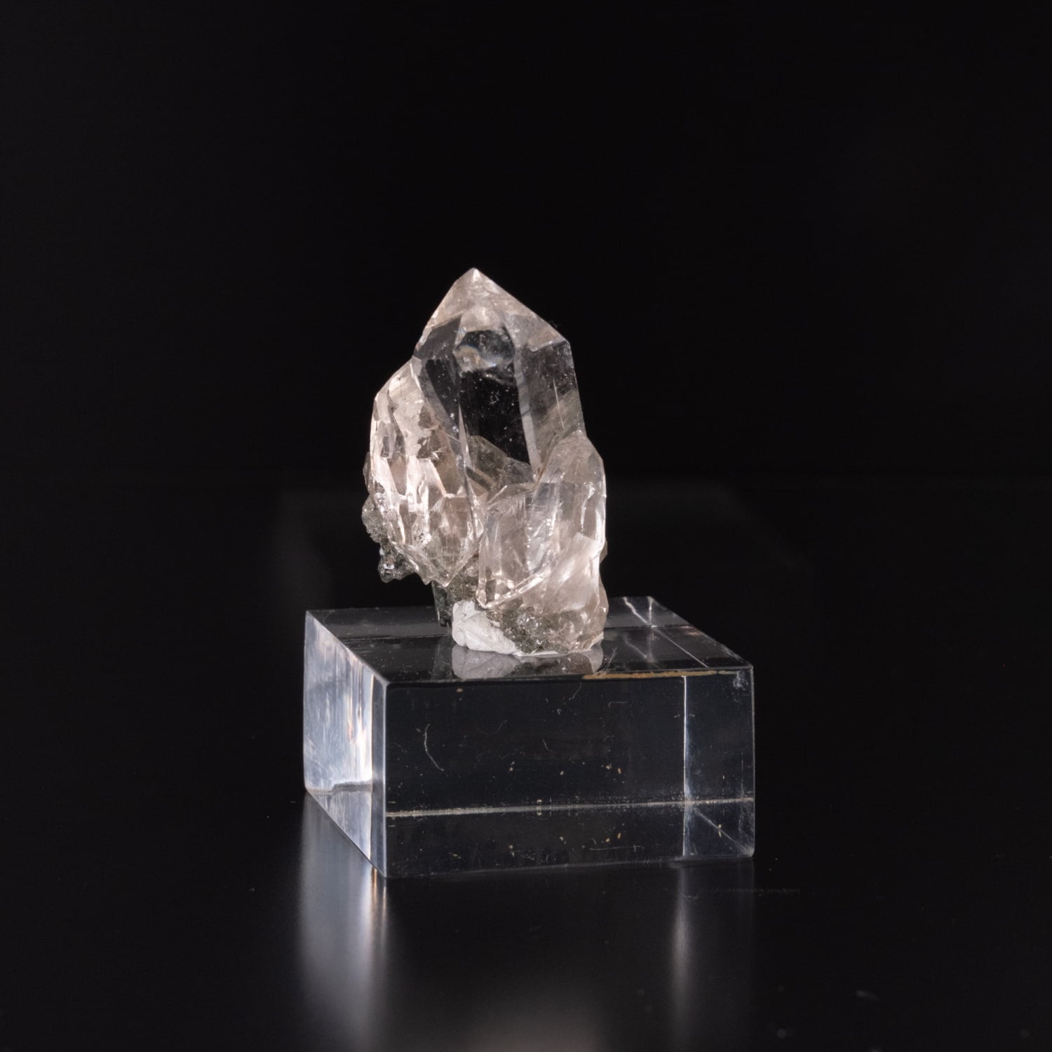 透明度が抜群のポイントで、母岩部分に微量のクローライトが付着しガーデンクォーツの様な部分もあります。先端部分にイシスと呼ばれる形状もありゲートウェイと言われる形状や角度によってはレインボーも確認出来、手ごろなサイズなのに見ごたえのあるクラスターです。