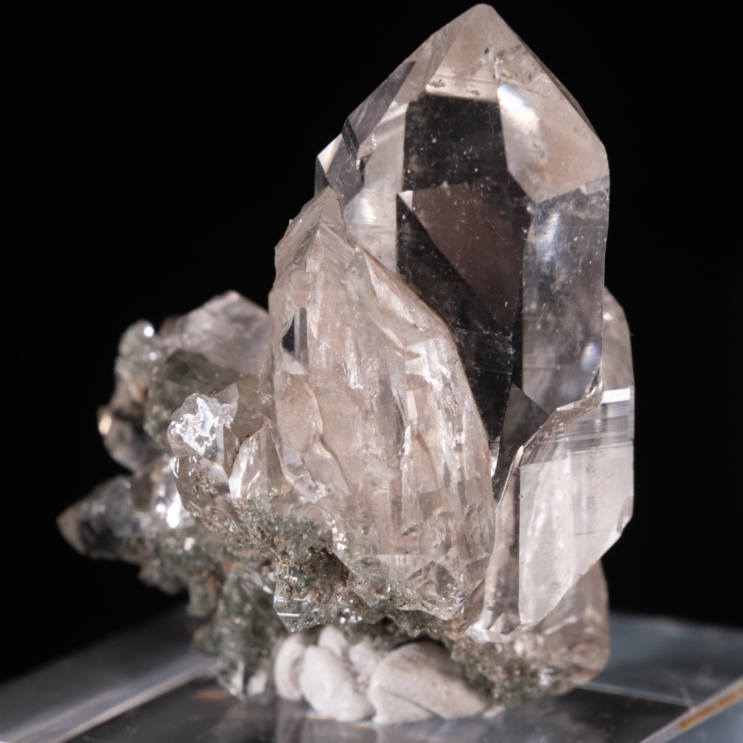 ・多様な表情: 緑色のクローライト(緑泥石)、黒色のアナテース(鋭錐石)、金色のルチル(金紅石)などが含まれる、個性豊かな結晶が見られます。
