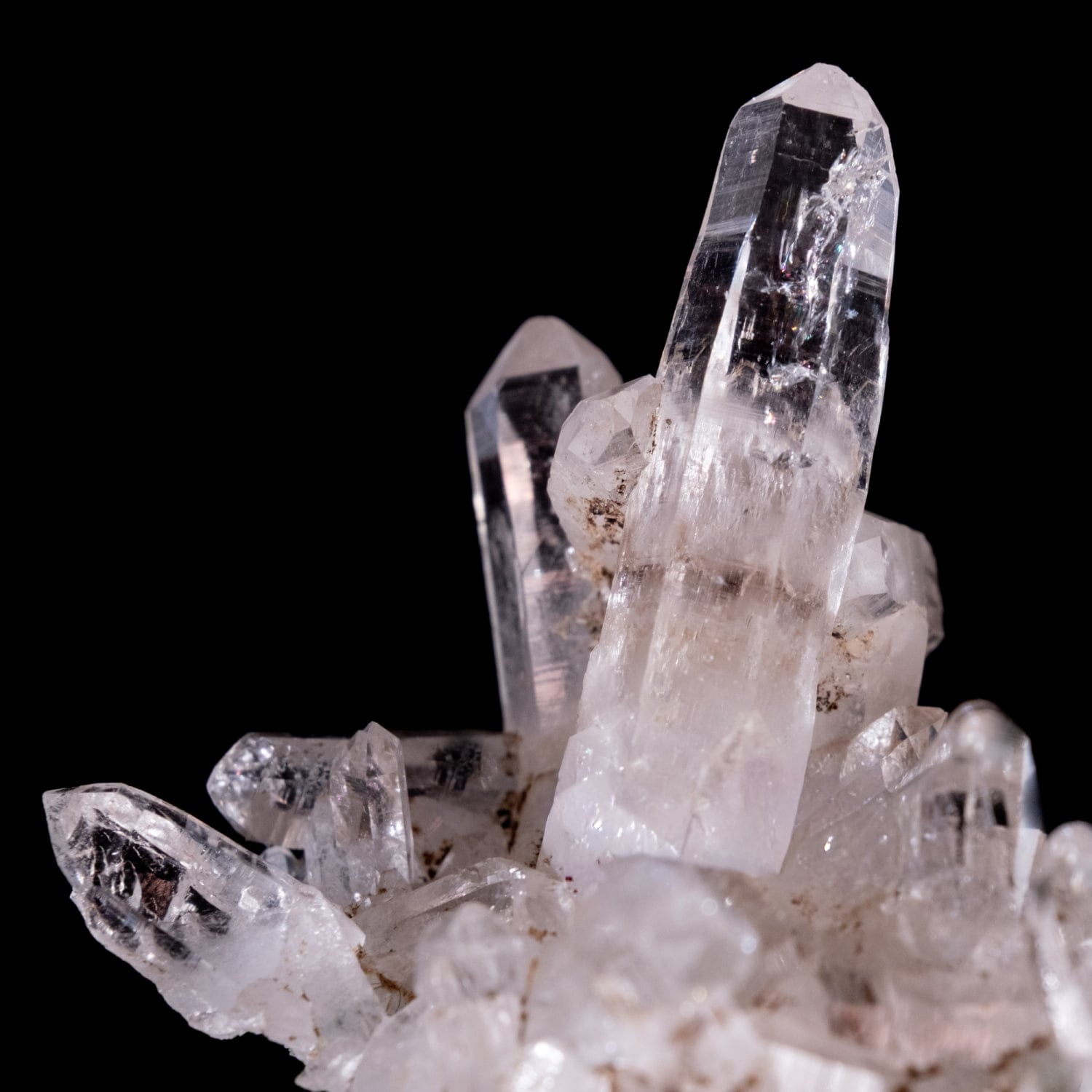 透明度が抜群の細長い結晶が特徴的なクラスターです。バーコード状の模様も見られ角度によってはレインボーも確認出来ます。