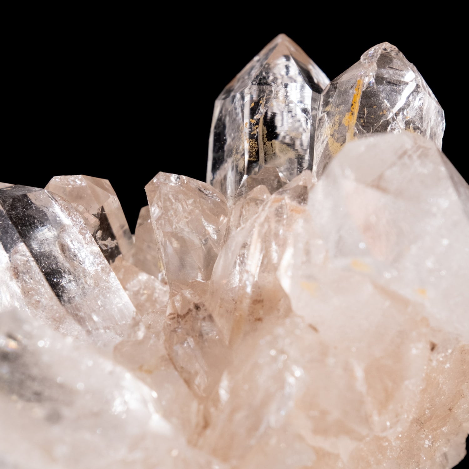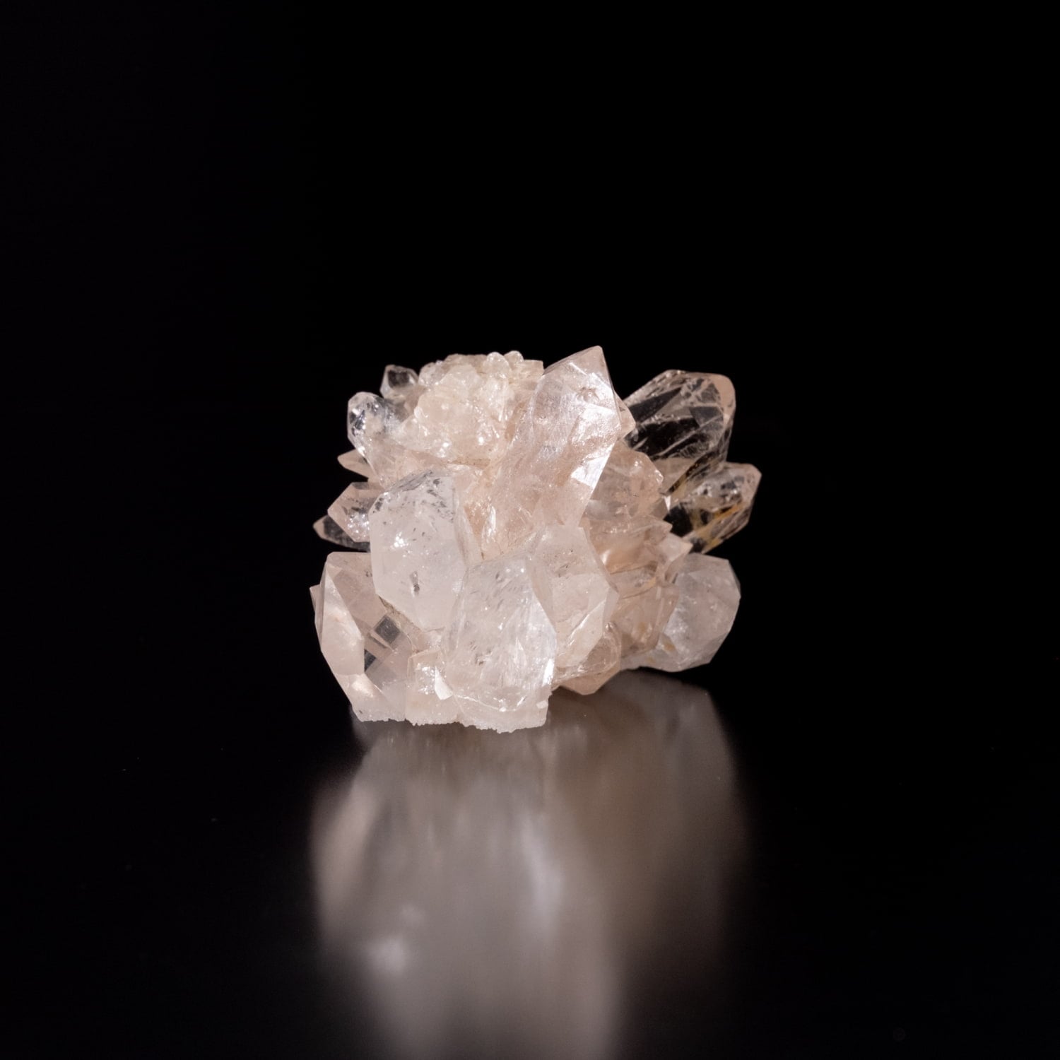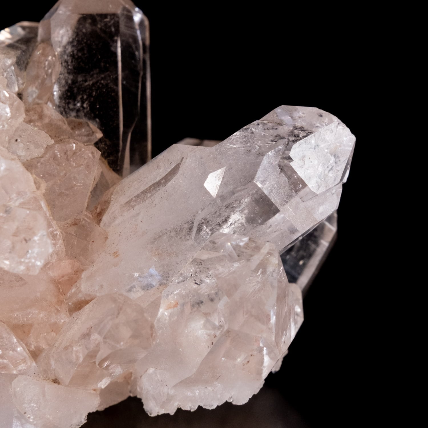 透明度が抜群で太目の結晶が特徴的なクラスターです。タビーと言われる形をした先端のポイントが数個あり、カテドラルのような形状のものやバーコード状の模様、角度によってはレインボーも確認出来ます。
