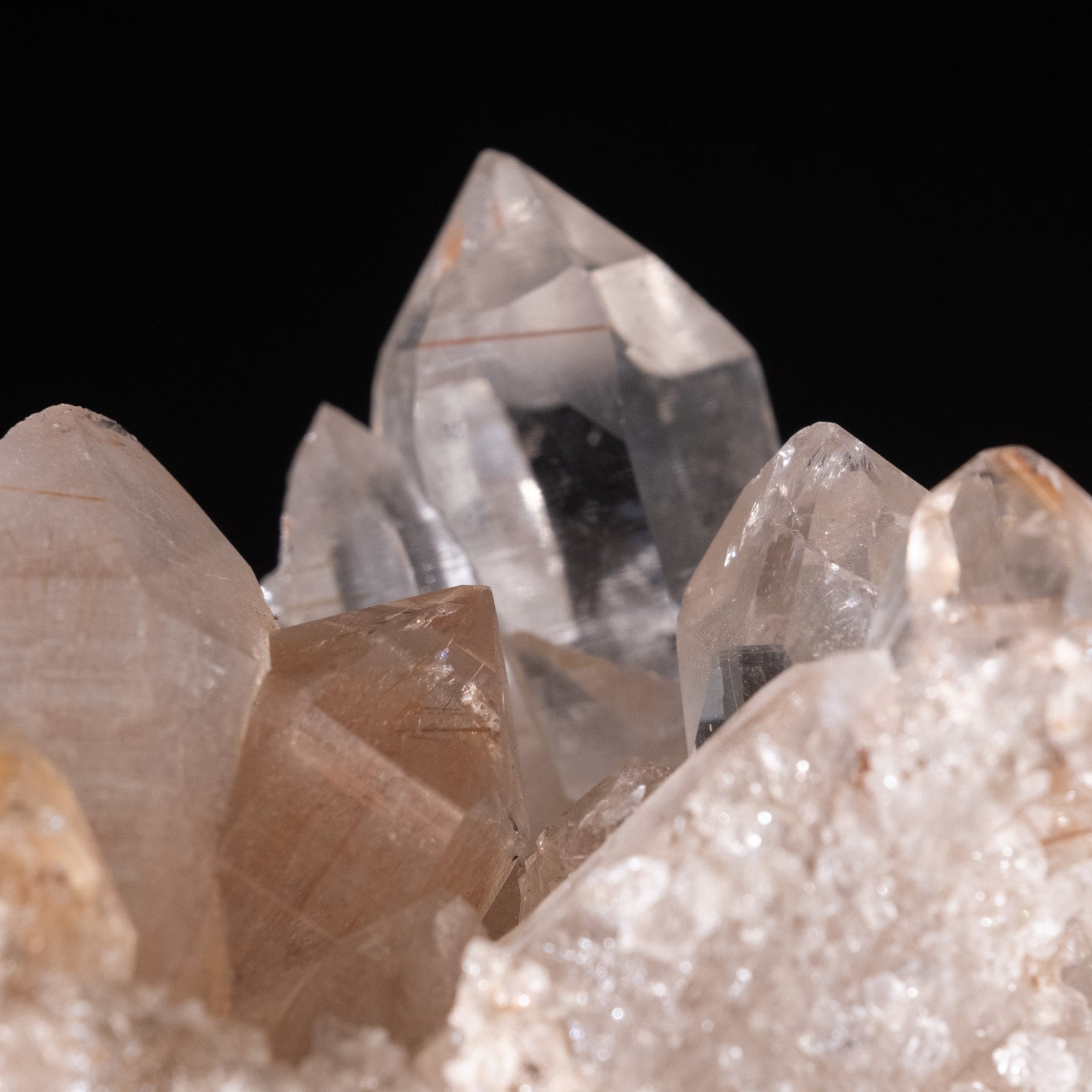 ・多様な表情: 緑色のクローライト(緑泥石)、黒色のアナテース(鋭錐石)、金色のルチル(金紅石)などが含まれる、個性豊かな結晶が見られます。