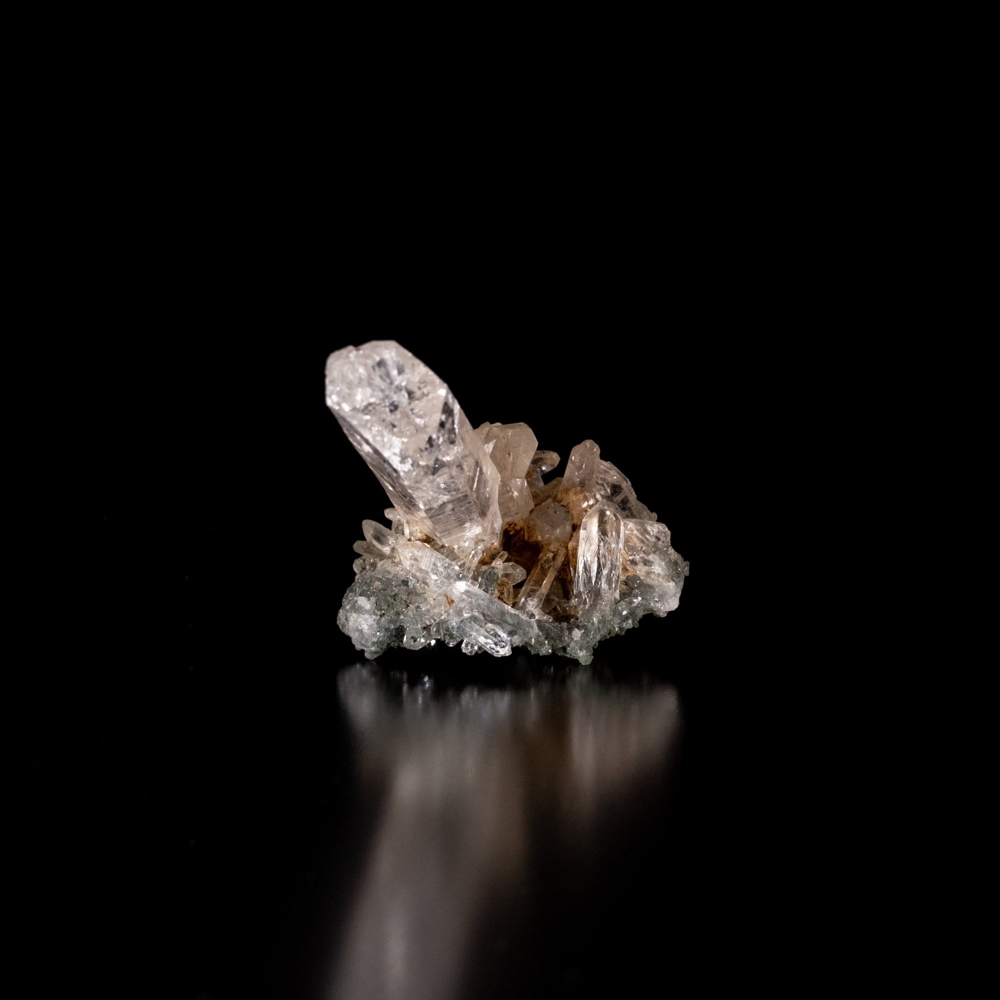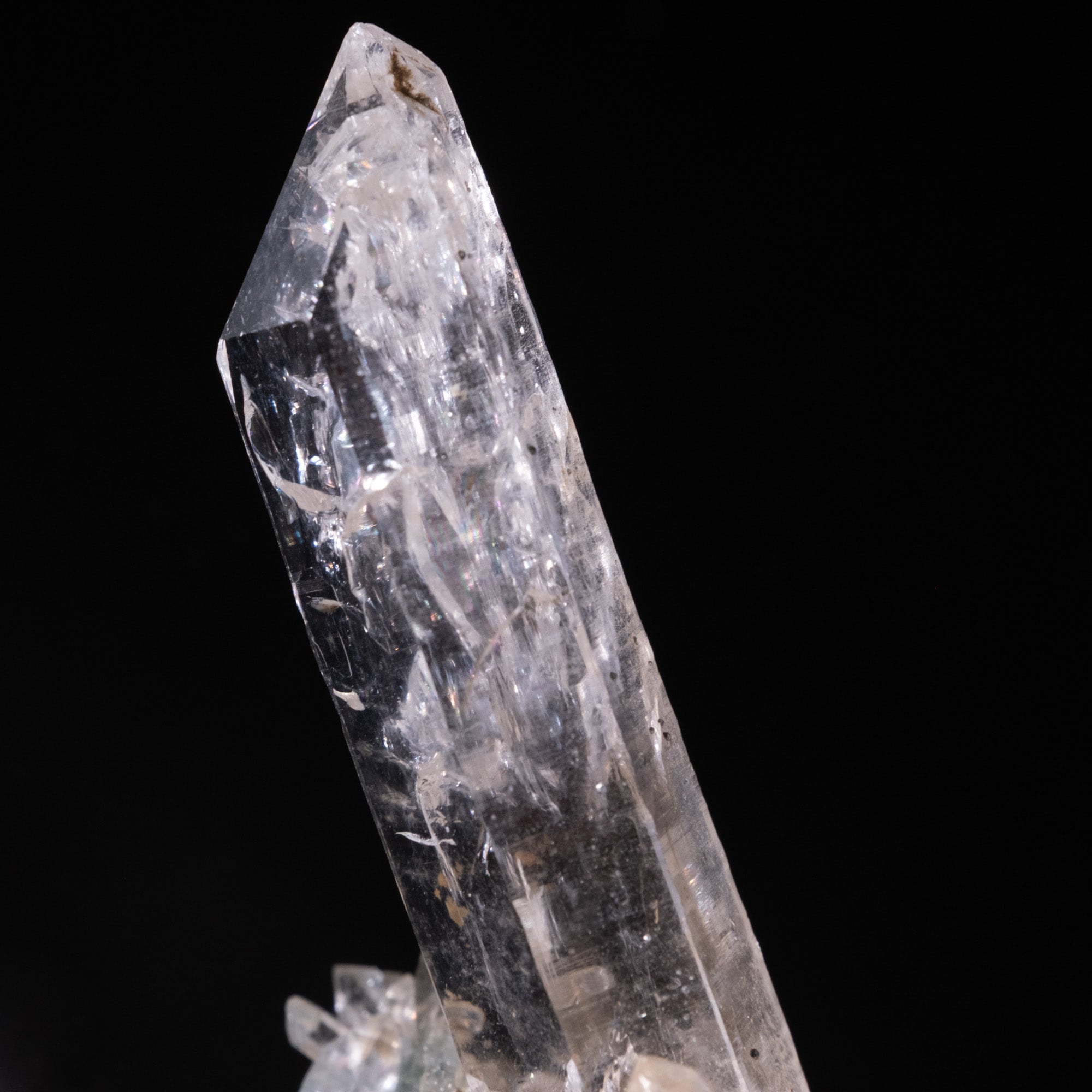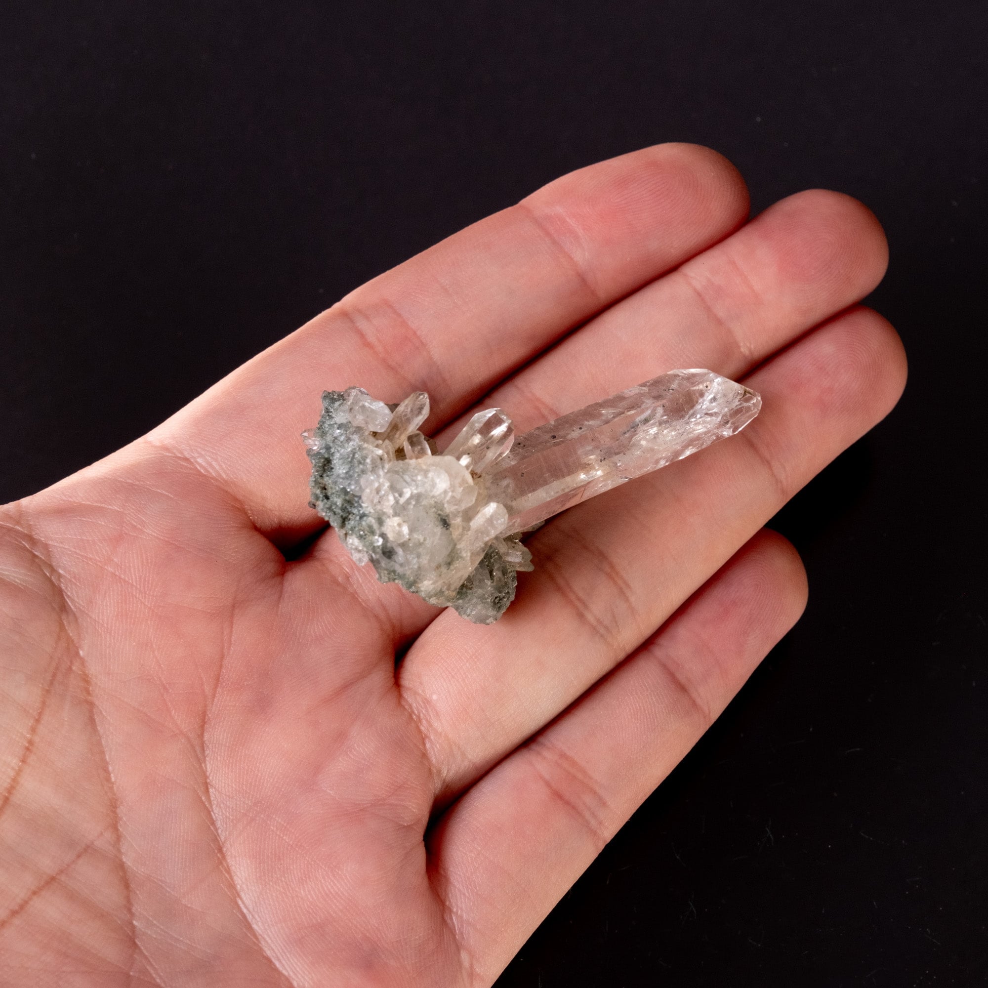 クローライトがびっしりと付着した母岩に透明度の高い結晶が一本ズドンと突き抜けているような形状で、レインボーが見られる箇所もありバーコード状の模様も見られます。裏面には小さな結晶が付着しキラキラと反射しているのが非常に魅力的です。