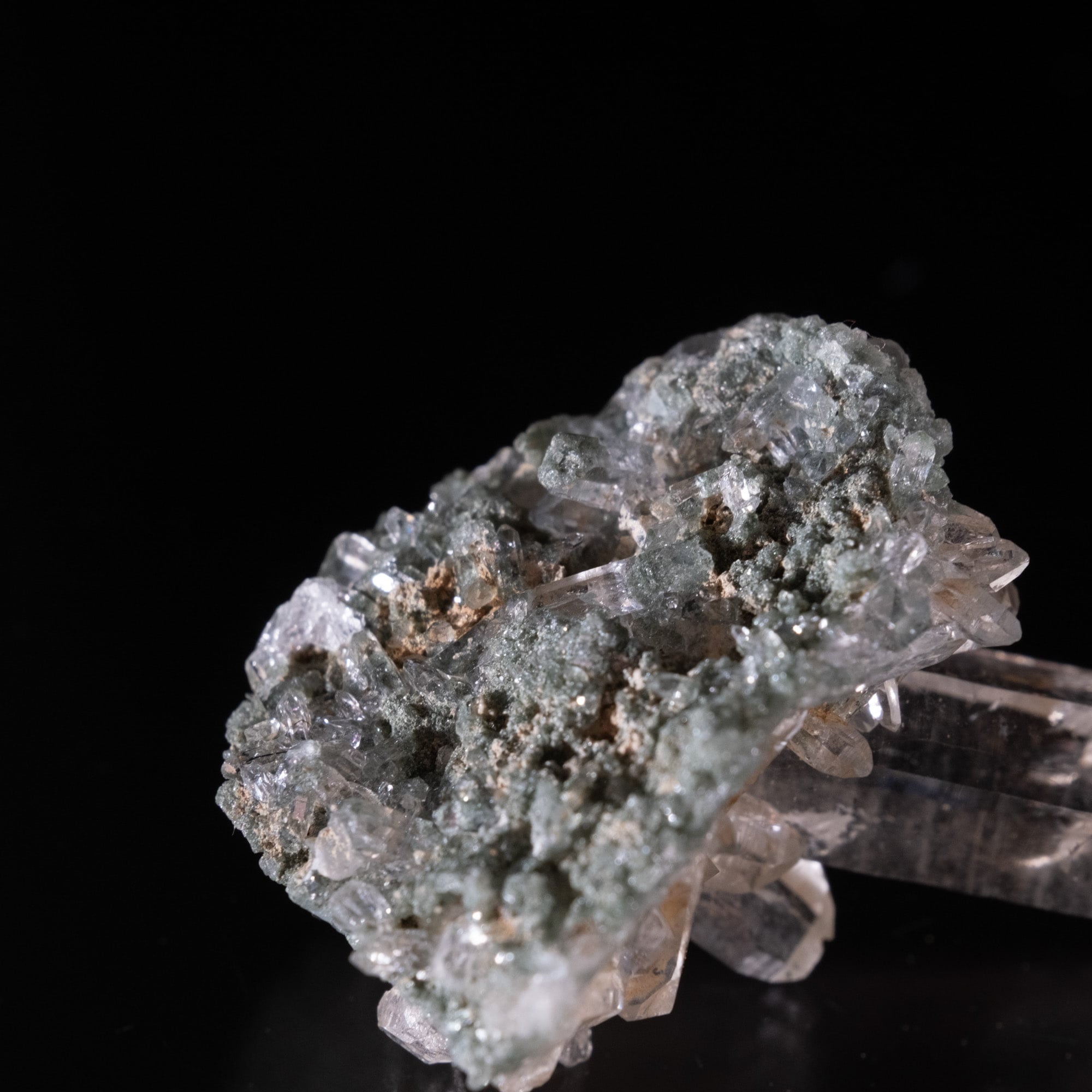 ・多様な表情: 緑色のクローライト(緑泥石)、黒色のアナテース(鋭錐石)、金色のルチル(金紅石)などが含まれる、個性豊かな結晶が見られます。