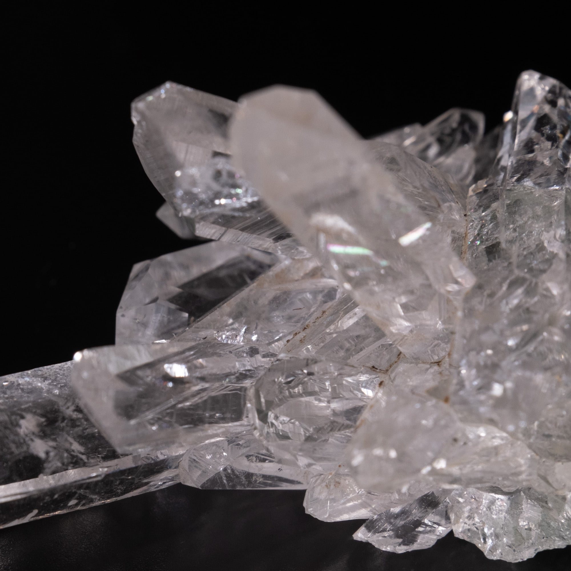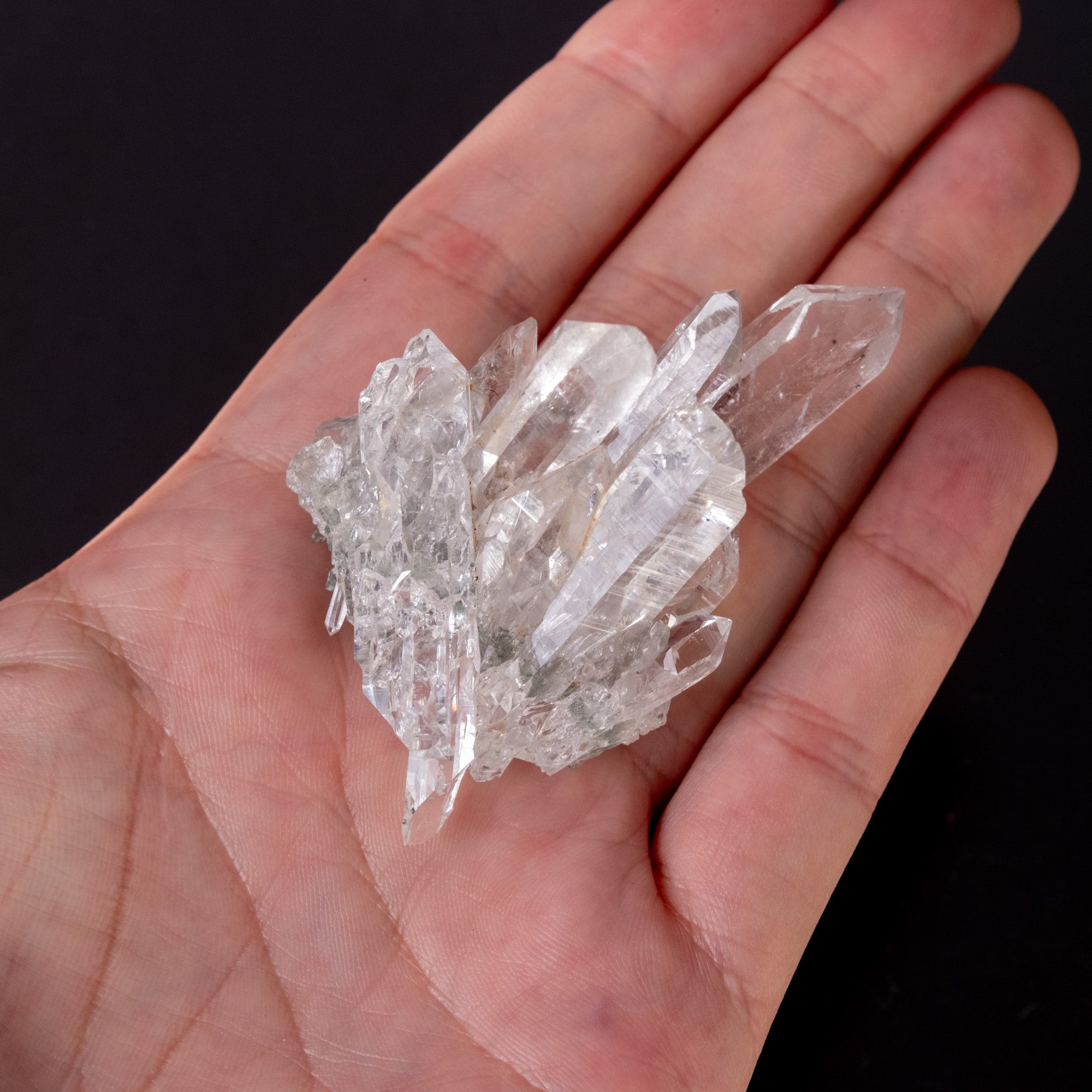 抜群の透明度で非常に薄い母岩から両面に結晶が伸びています。レインボーが見られる箇所もあり、ダブルポイントにタビーと言われる形をしたポイント、ゲートウェイやバーコード状の模様など、いろいろな魅力を時間を忘れて探してしまいます。