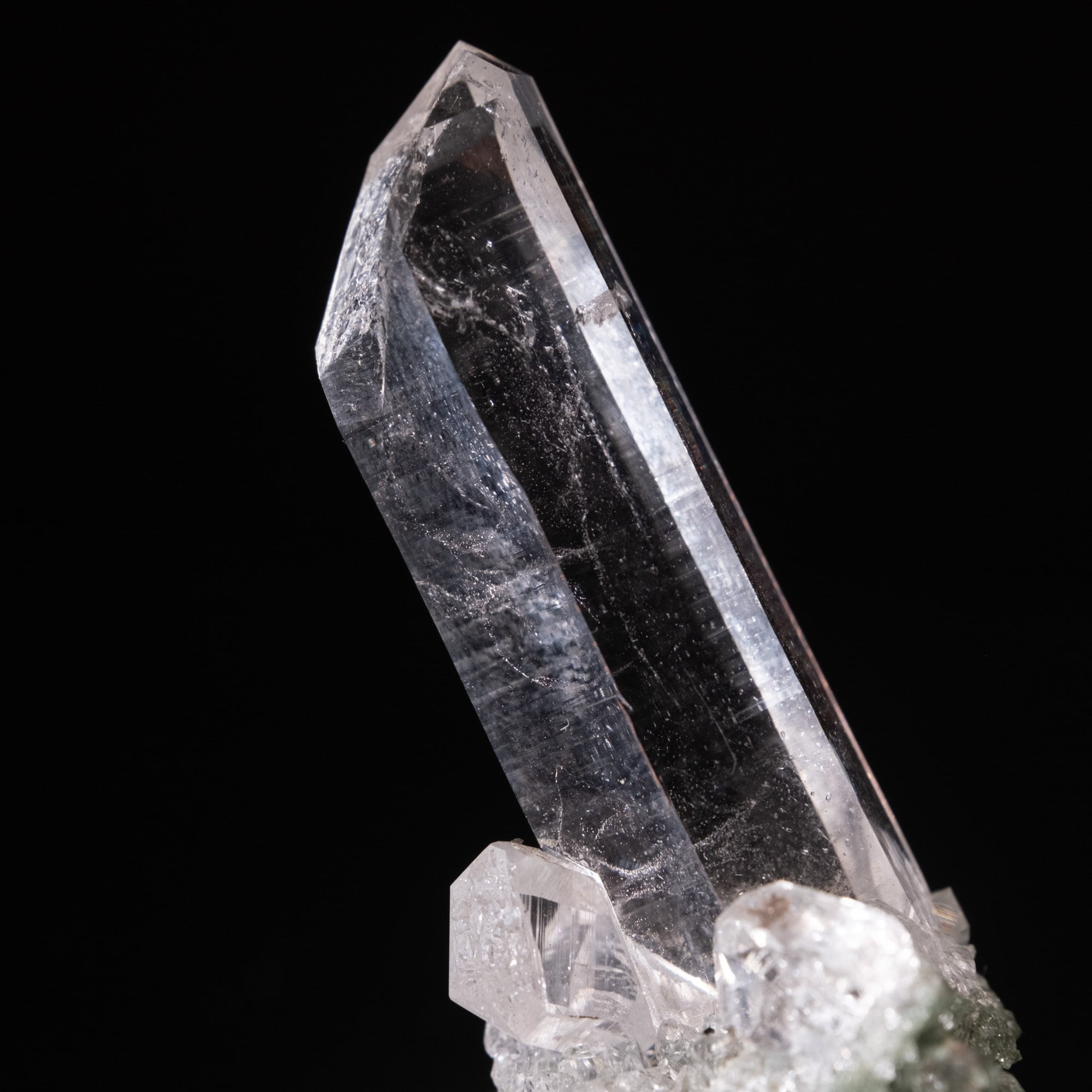 抜群の透明度のメインとなるポイントと非常に薄い母岩から裏面にも透明度の高い結晶が伸びています。セルフヒールドやバーコード状の模様に貫入箇所も見られます。