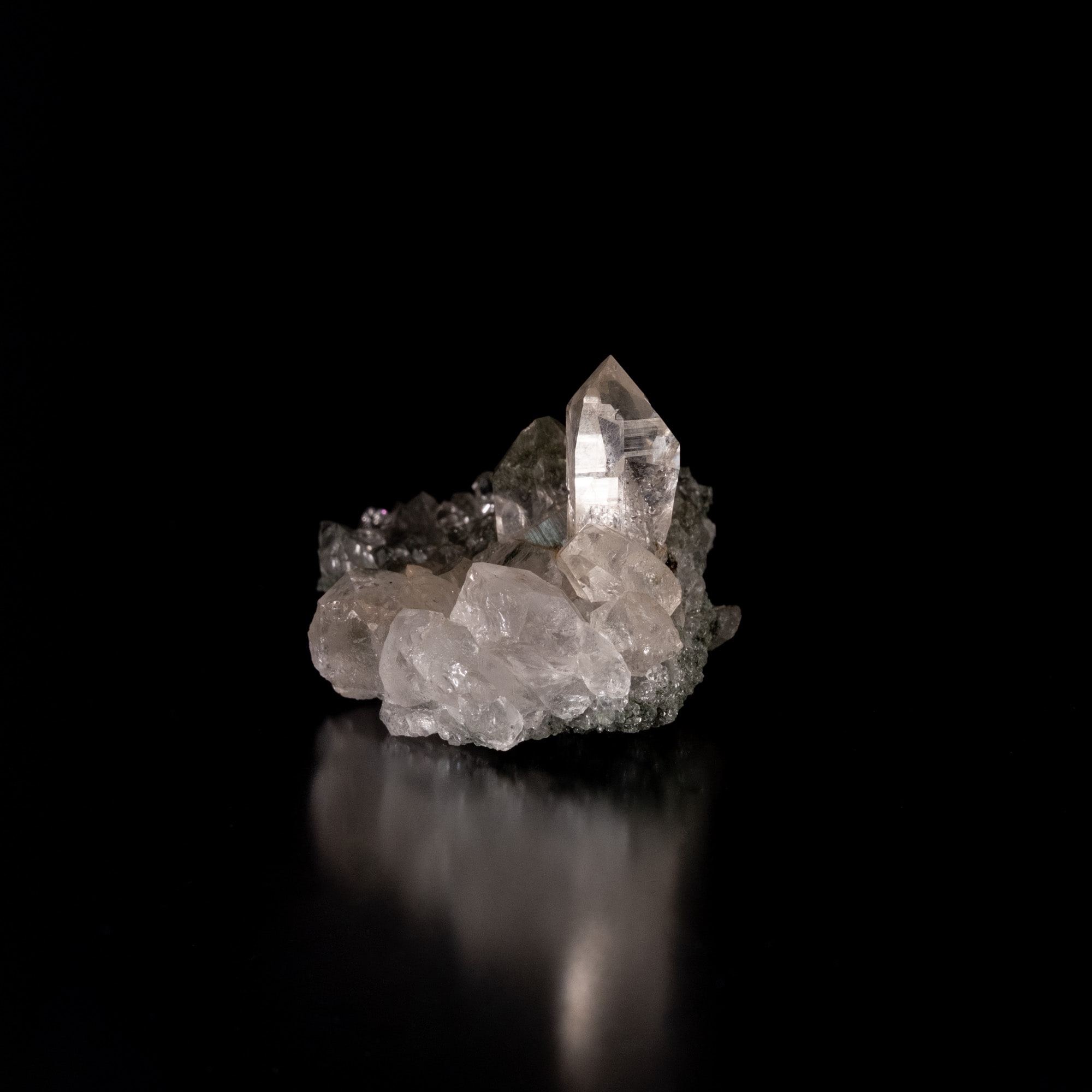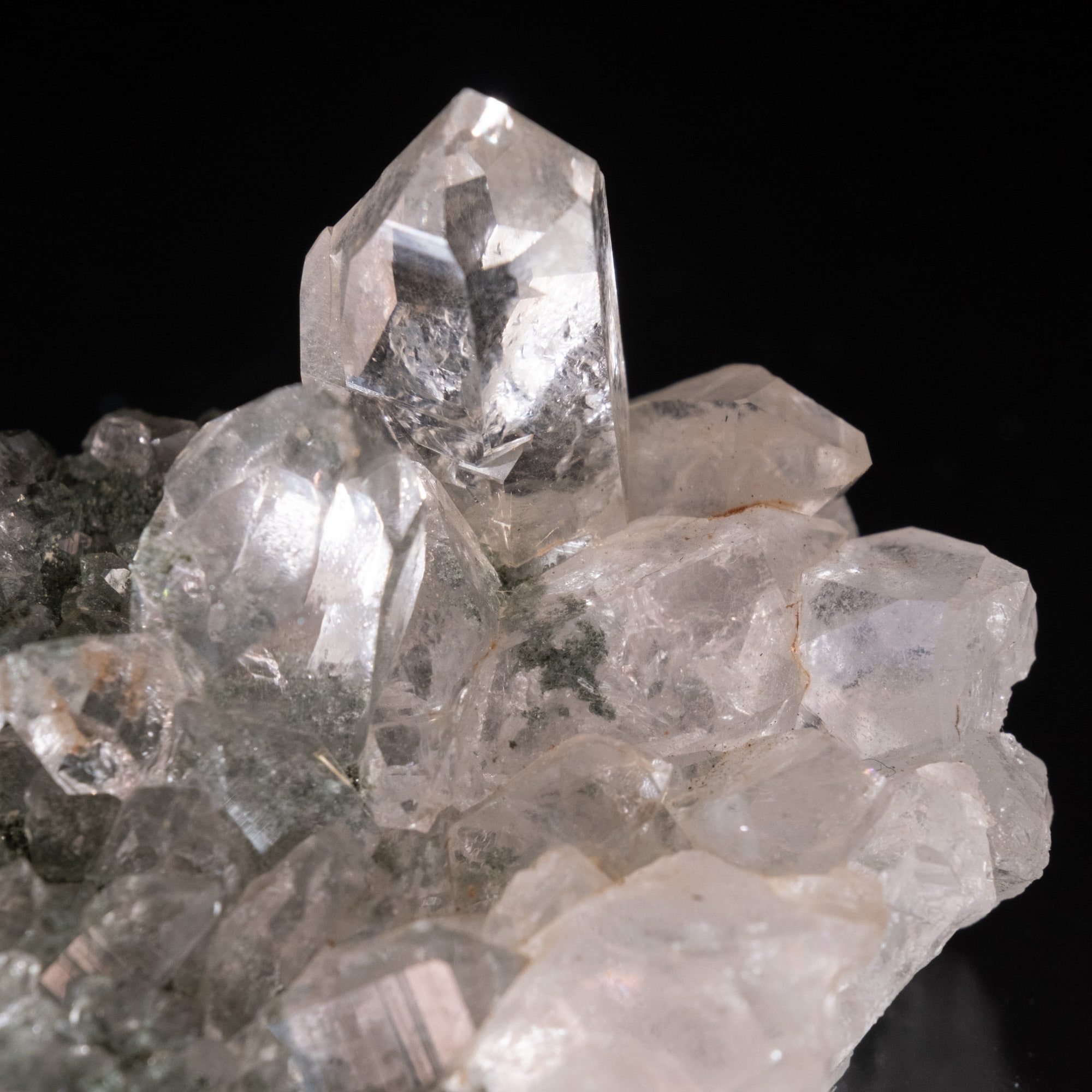 ・多様な表情: 緑色のクローライト(緑泥石)、黒色のアナテース(鋭錐石)、金色のルチル(金紅石)などが含まれる、個性豊かな結晶が見られます。