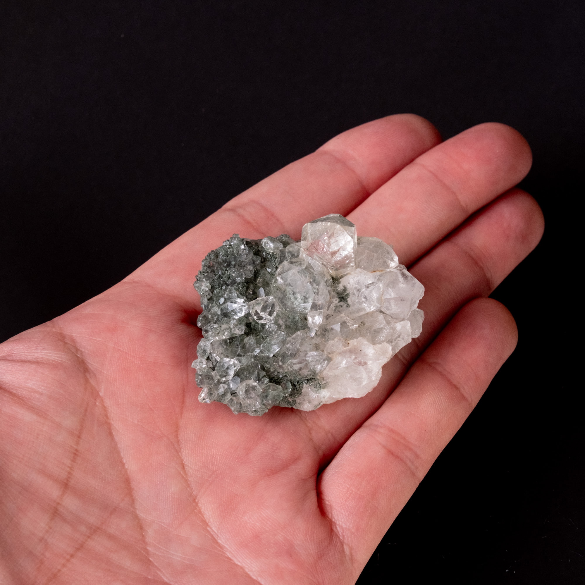 抜群の透明度で太目の結晶が並び、セルフヒールドともとれる模様やバーコード状の模様も見られます。ガーデンの部分も見られ、手ごろなサイズ感も非常に魅力的です。
