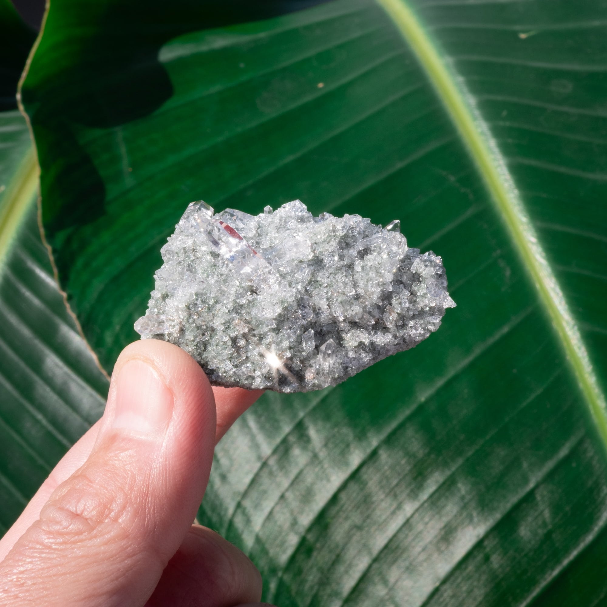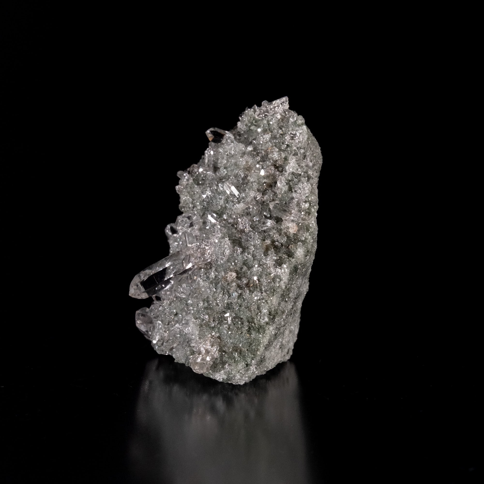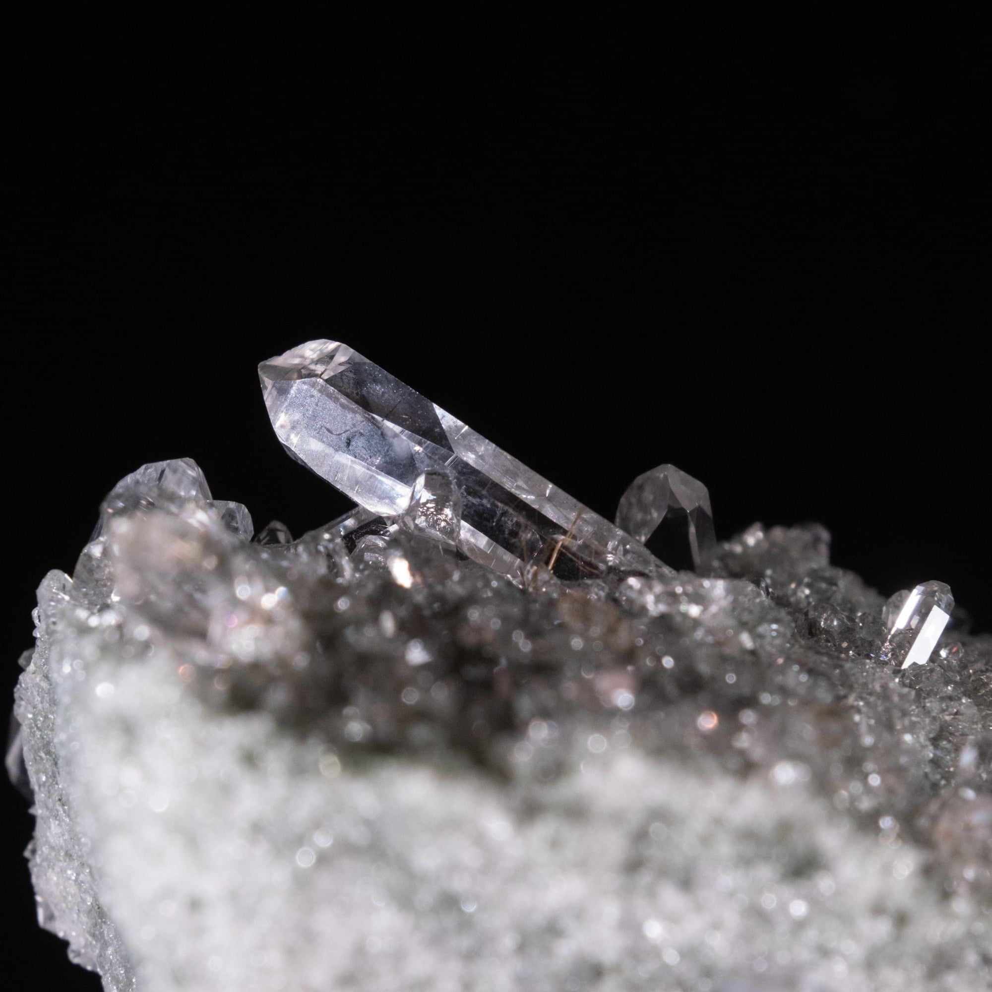 透明度の高い細かい結晶がびっしりとついたクラスターでキラキラと反射する光が非常に魅力的です。わずかですがルチルが内包されているのも確認でき、ダブルポイントや貫入の形状も確認できます。