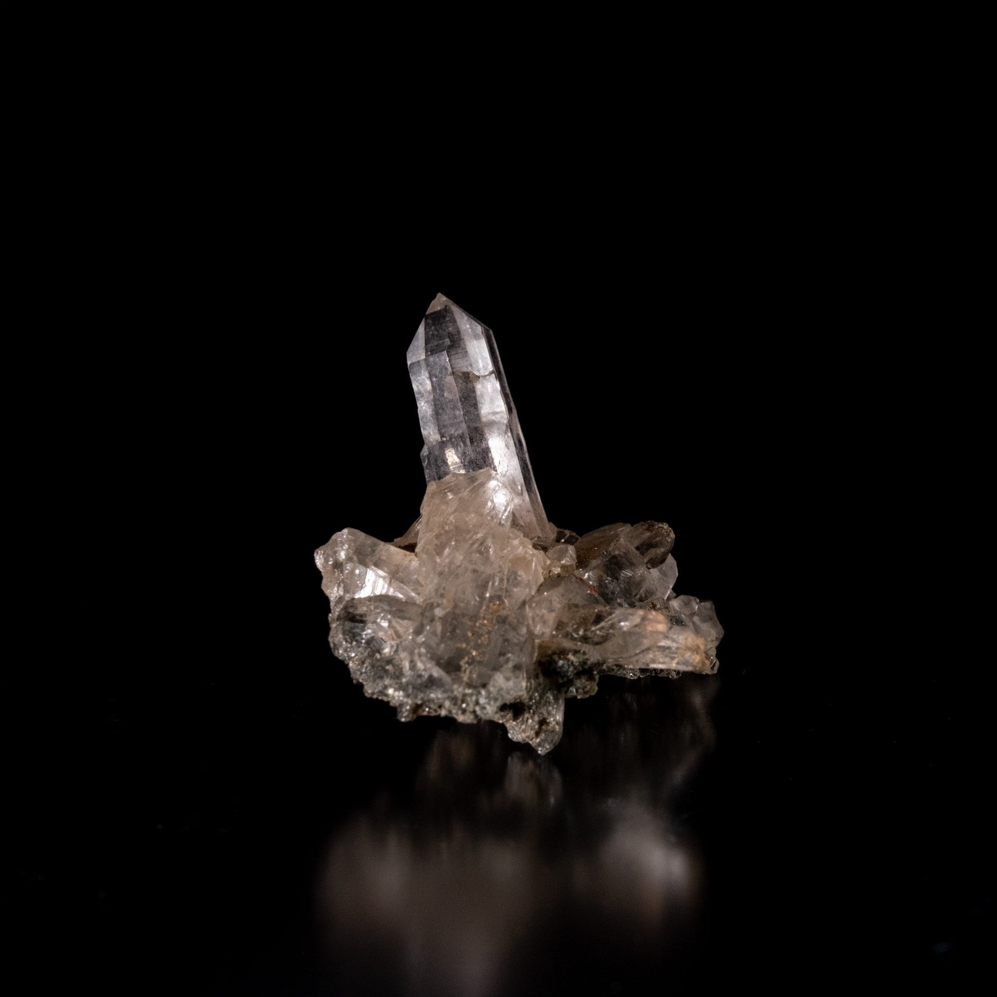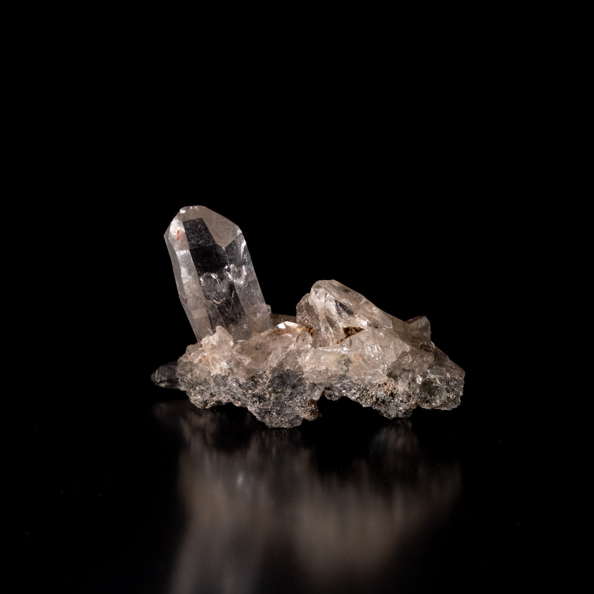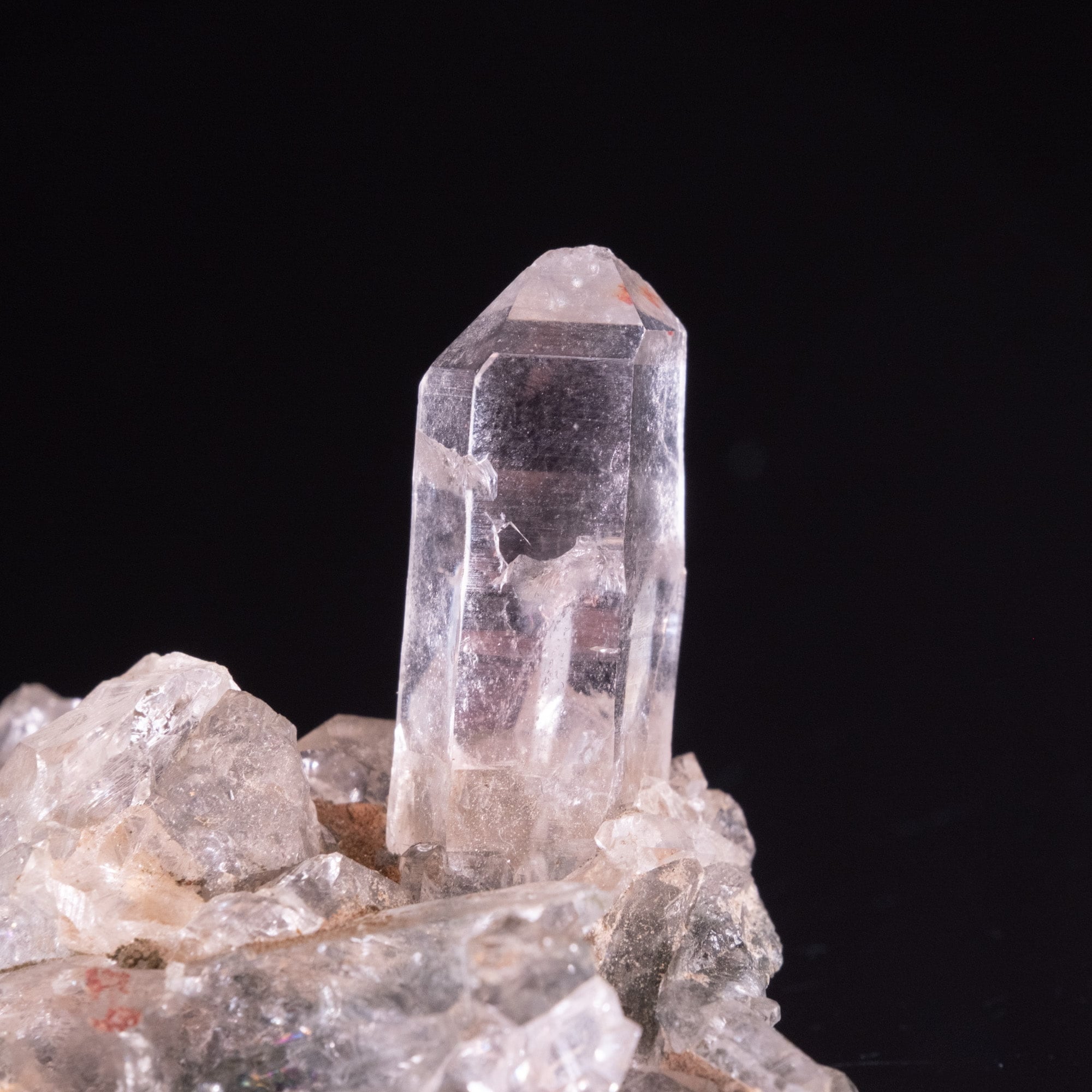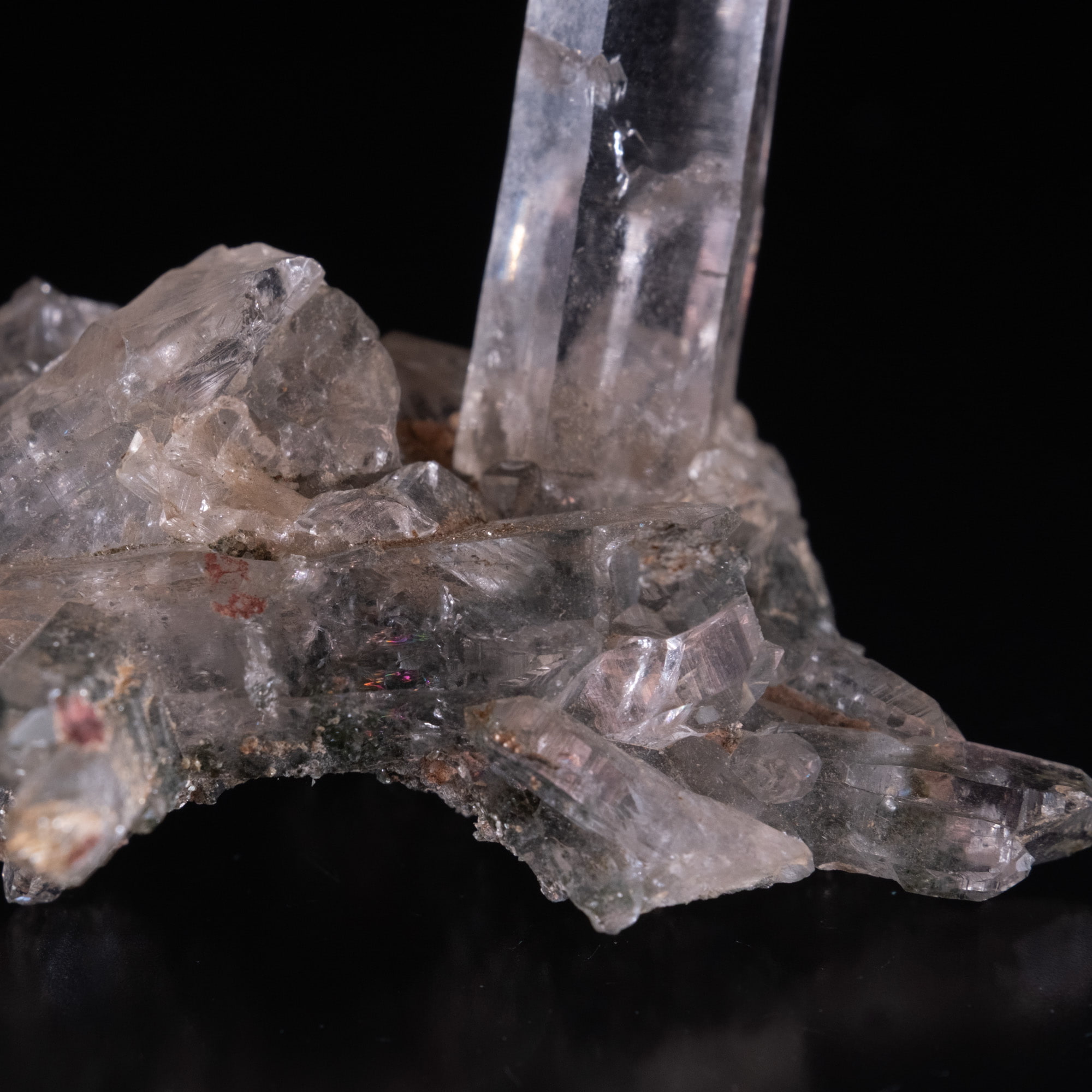 抜群の透明度に小ぶりな大きさが魅力的なクラスター。根本の方ではガーデンが内包されており、レインボーが見られる箇所も確認できます。
