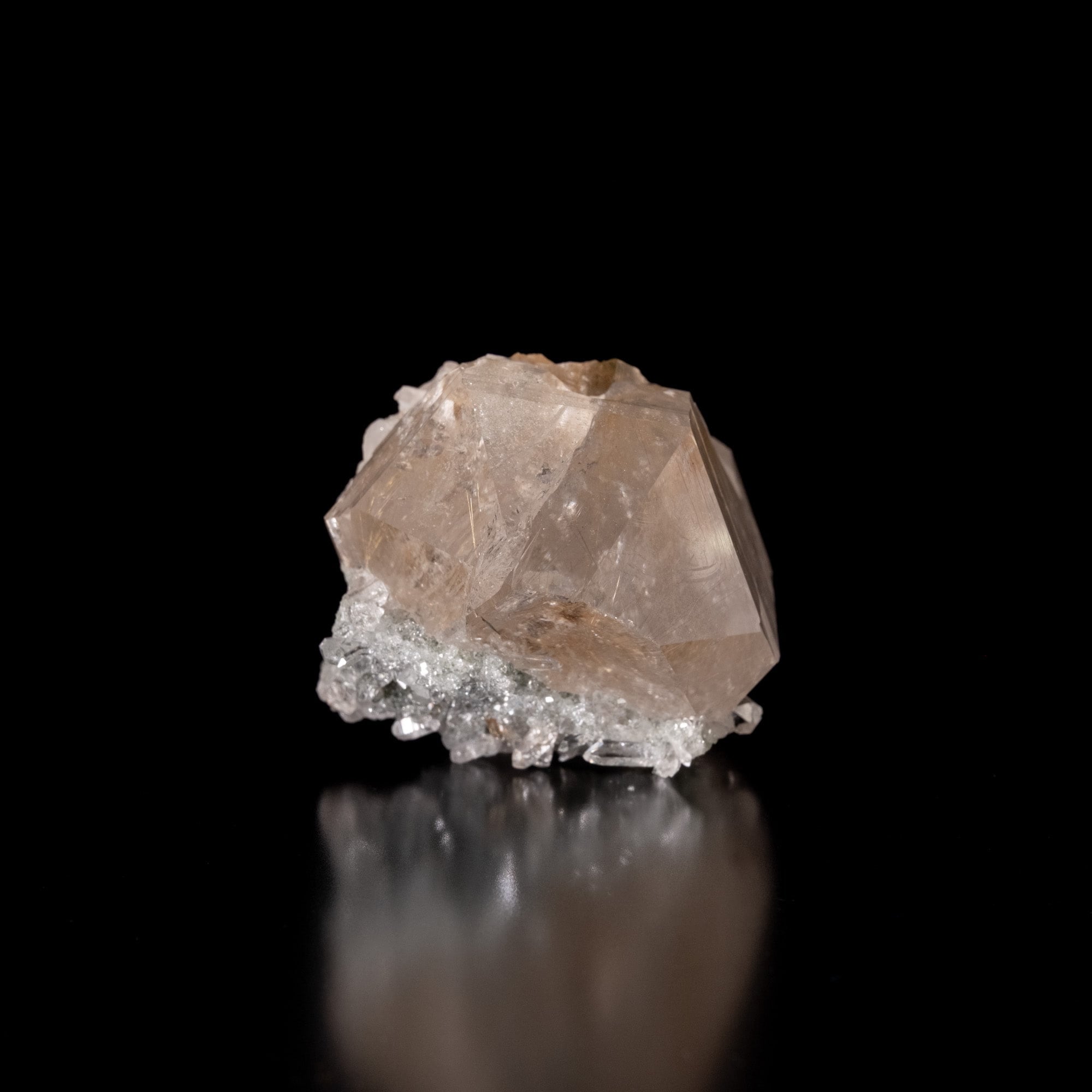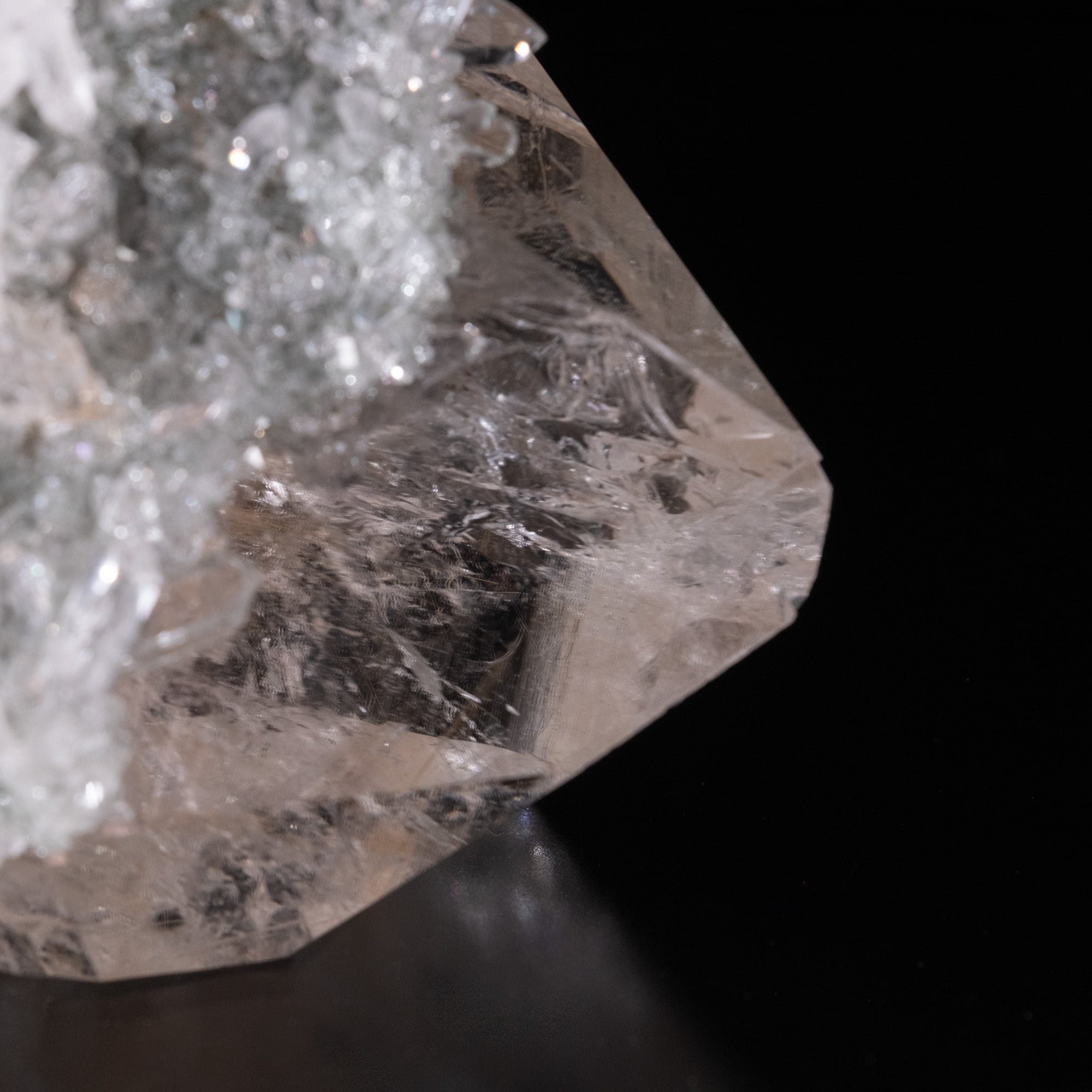抜群の透明度に重量感があるポイントに微細な結晶が付着した形状で、小さい結晶が貫入りしている箇所も見られます。ルチルが内包されているのも確認出来、レインボーが見られる箇所もあります。