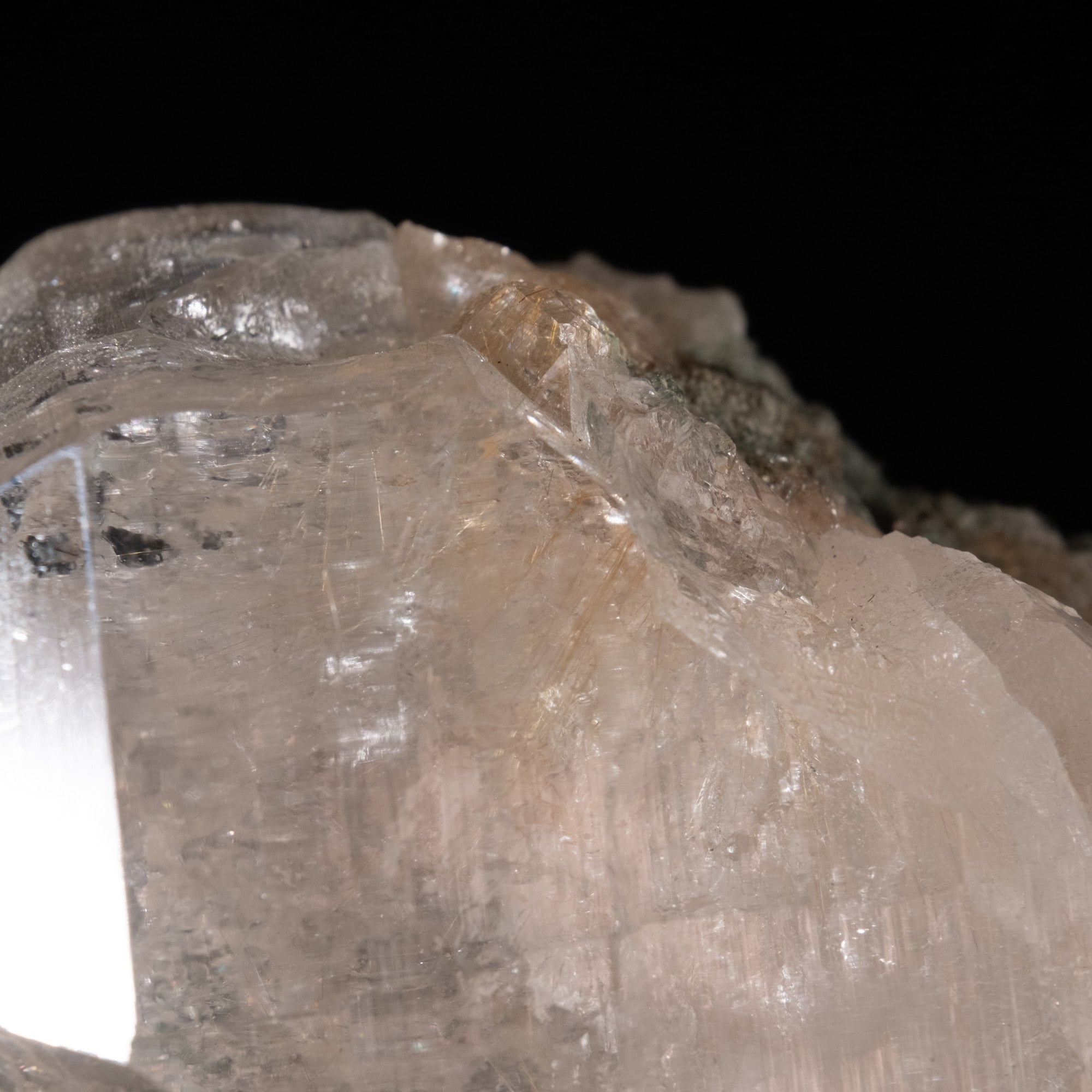 ・多様な表情: 緑色のクローライト(緑泥石)、黒色のアナテース(鋭錐石)、金色のルチル(金紅石)などが含まれる、個性豊かな結晶が見られます。