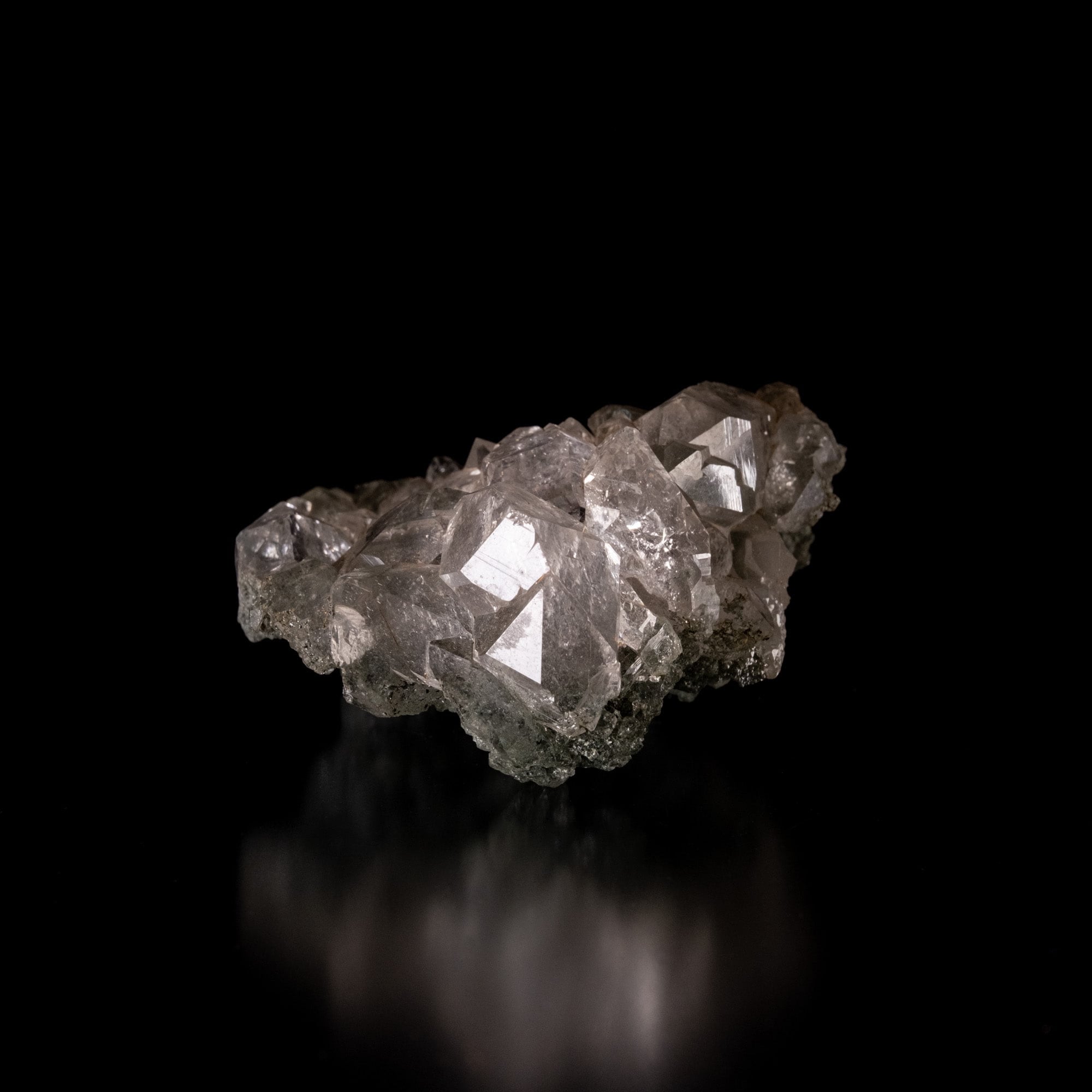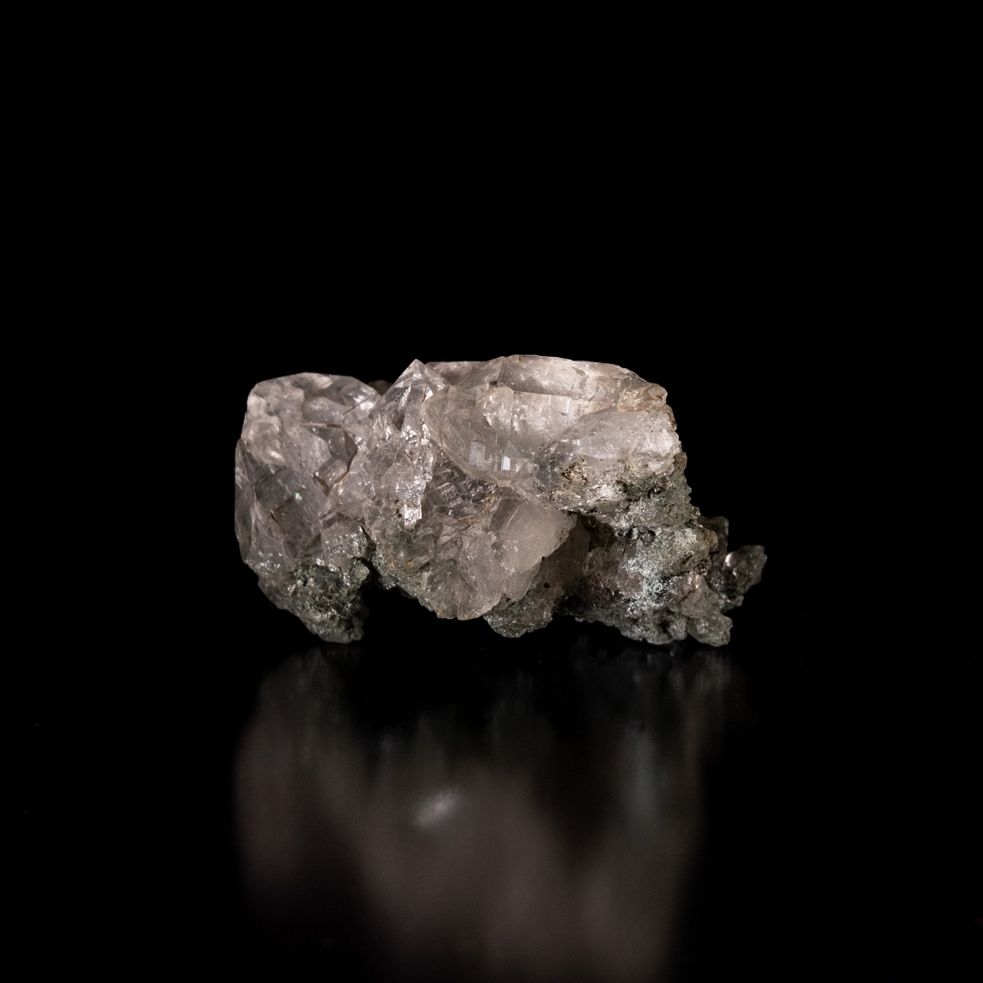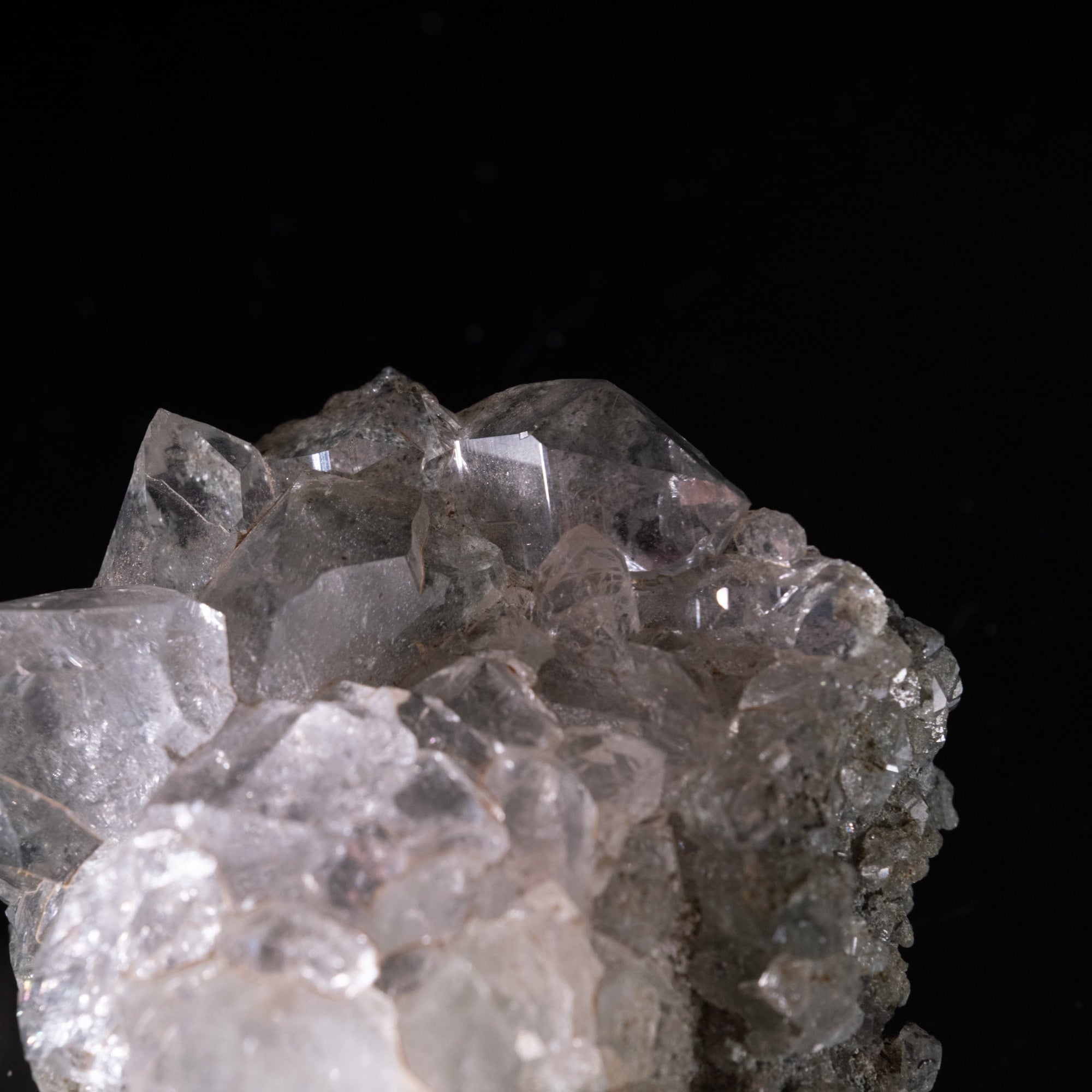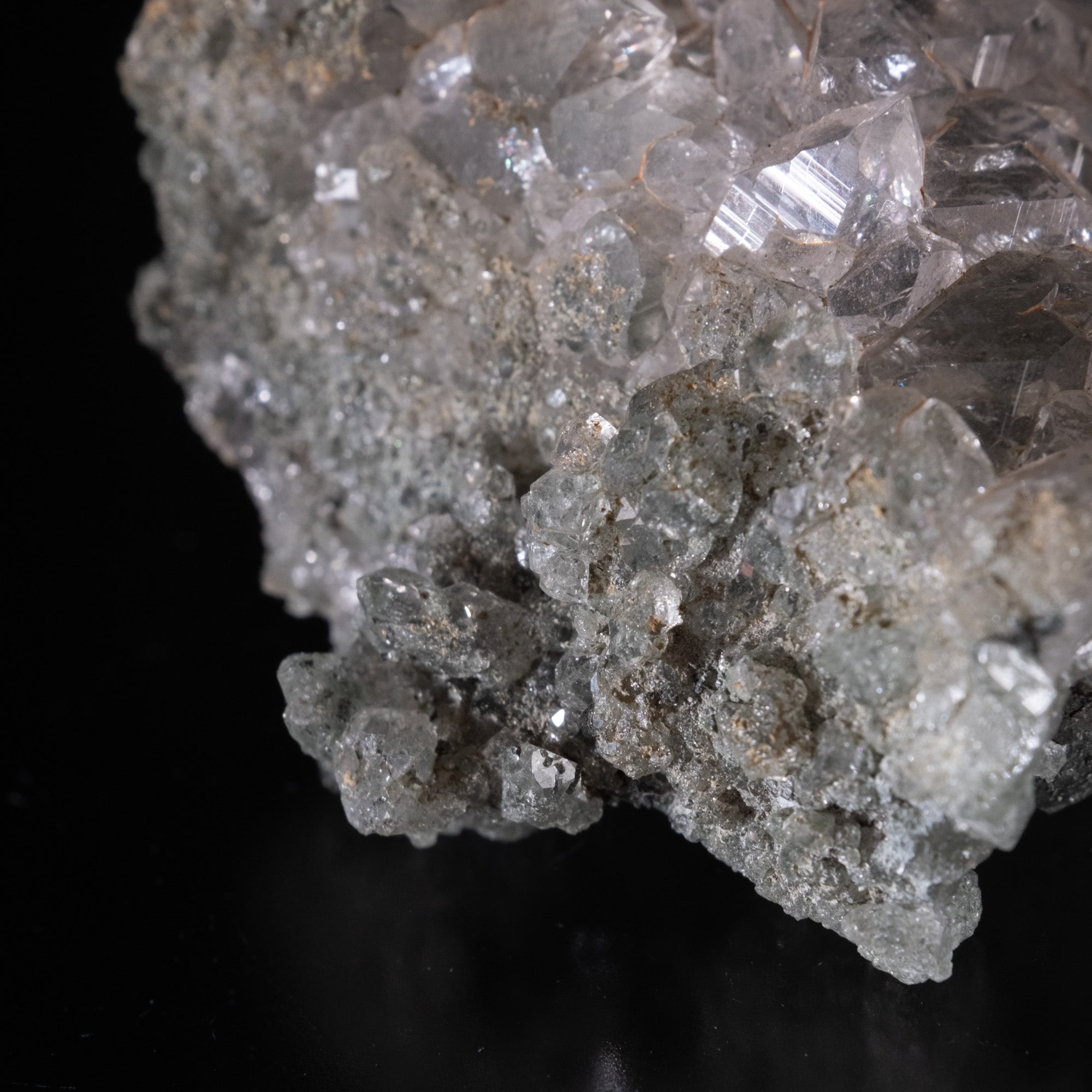 透明度の高い太目の短いポイントが並んだクラスターで、ガーデンやレインボーが見られる箇所も確認出来ます。裏面は透明度の高い細かい結晶にクローライトがびっしりと付着しているので、キラキラと反射する光が非常に魅力的です。