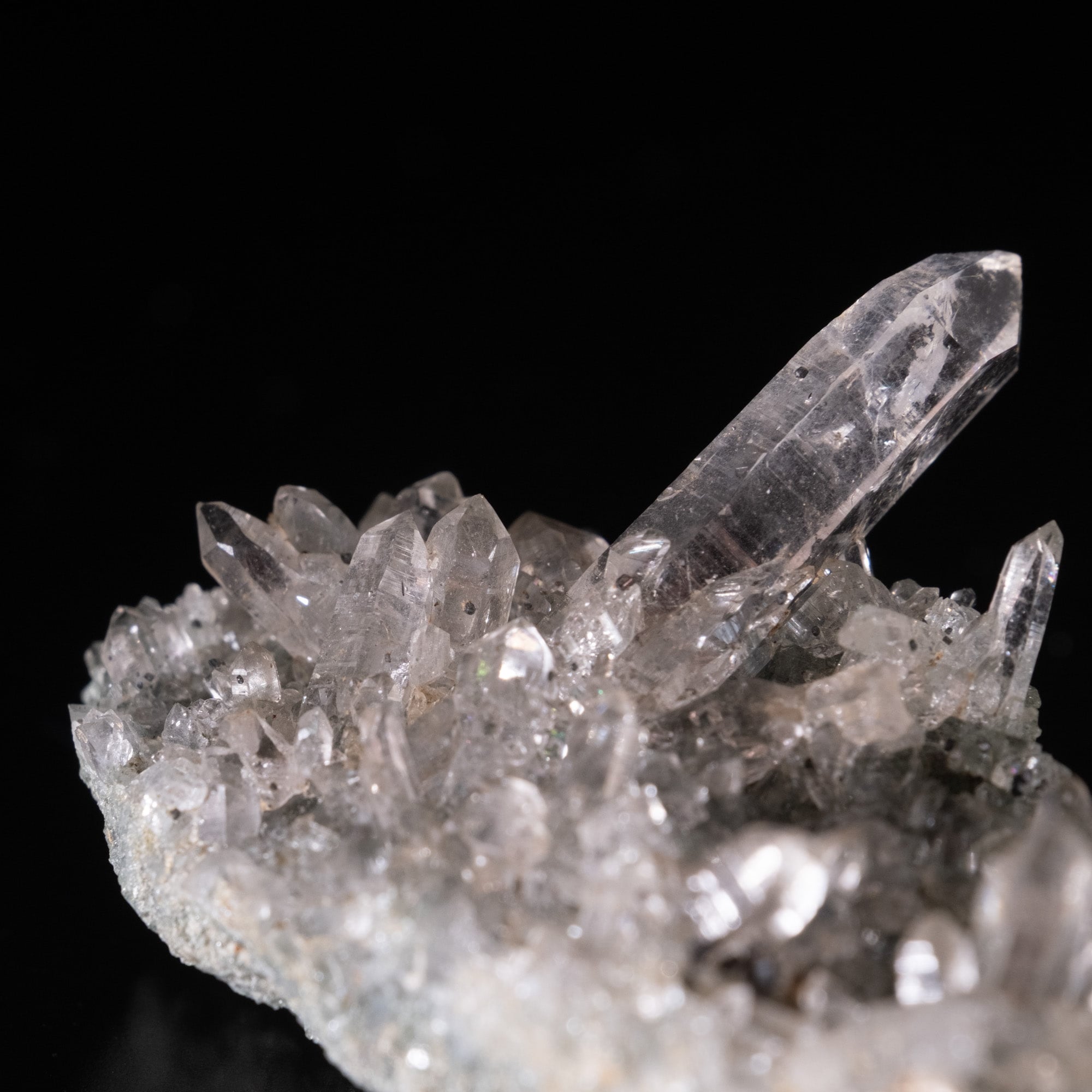 非常に透明度の高い小さい結晶がびっしりとついたクラスターで、キラキラと反射する光が非常に魅力的です。一つだけとびぬけたメインとなるポイントからはバーコード状の模様が確認出来ます。