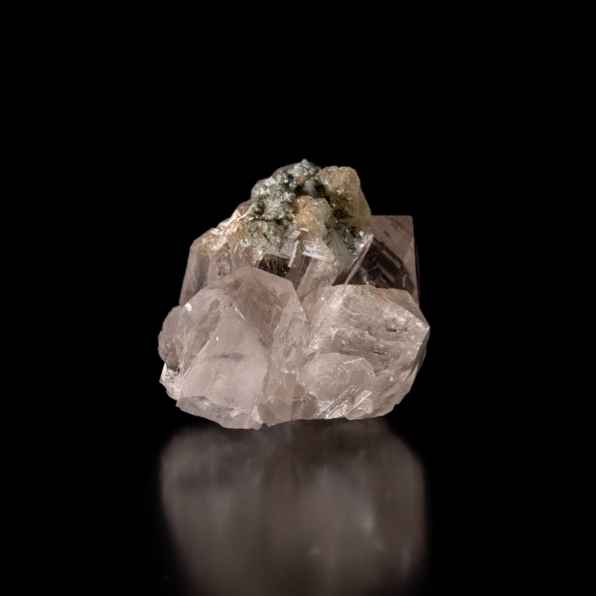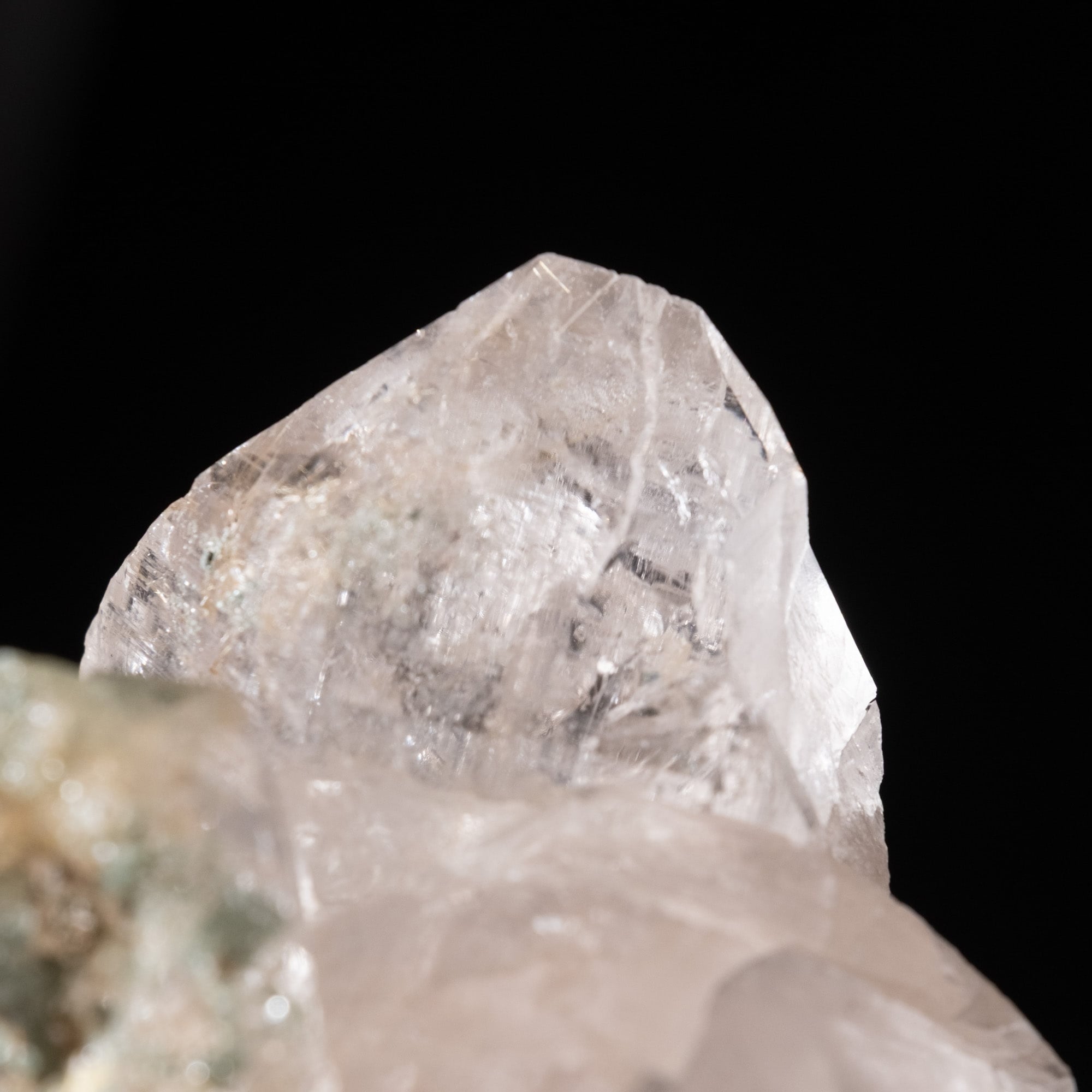 抜群の透明度でセルフヒールドともとれる形状の箇所にクローライトが付着し、そこからルチルが内包されています。タビーと言われる形をしたポイントにバーコード状の模様も見られ、角度によってはレインボーも確認出来ます。