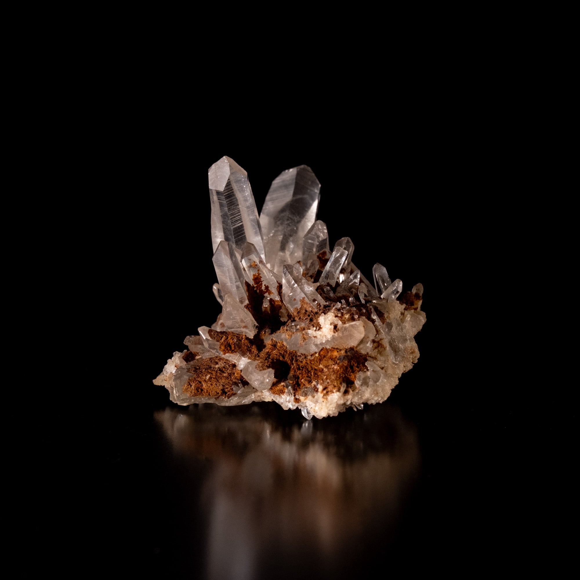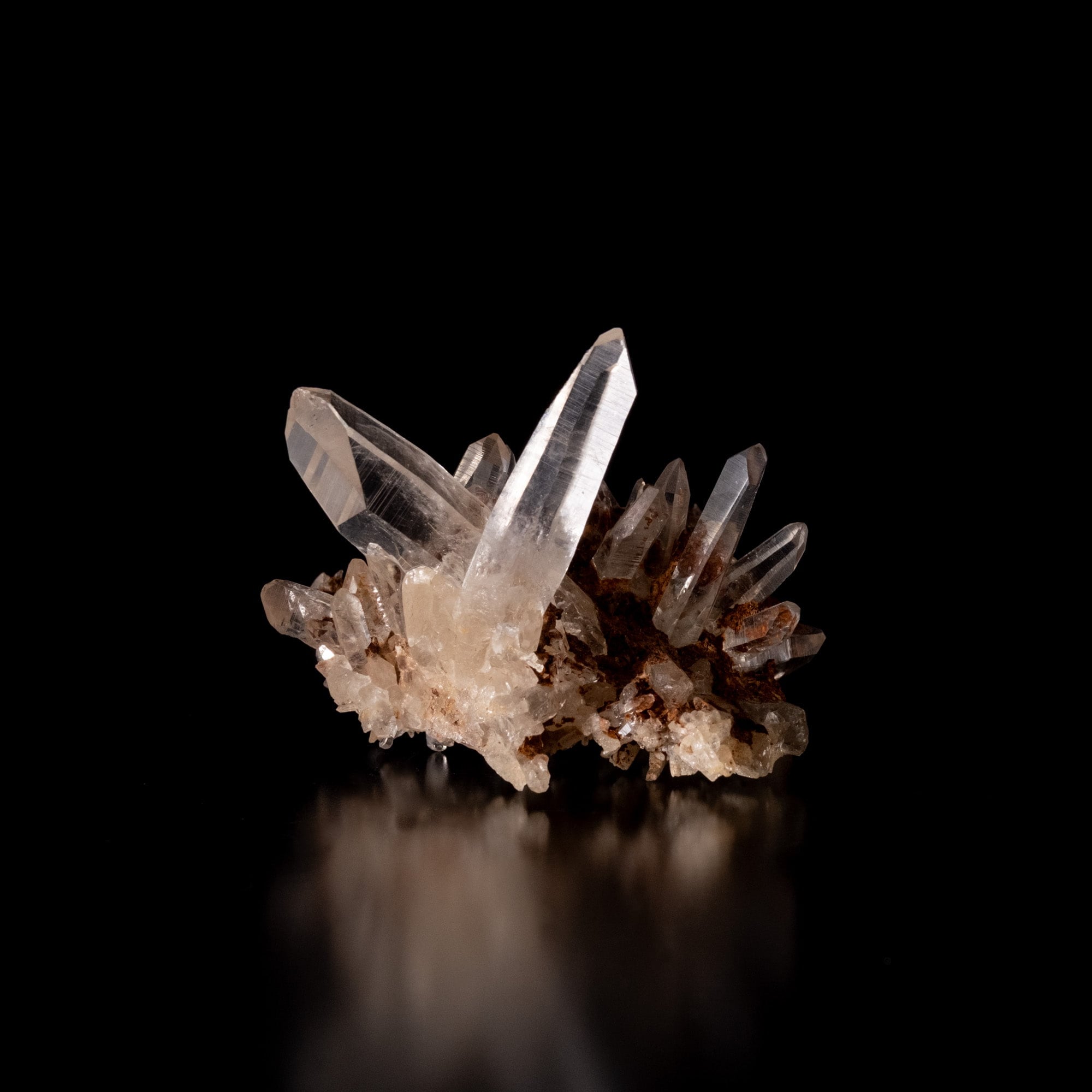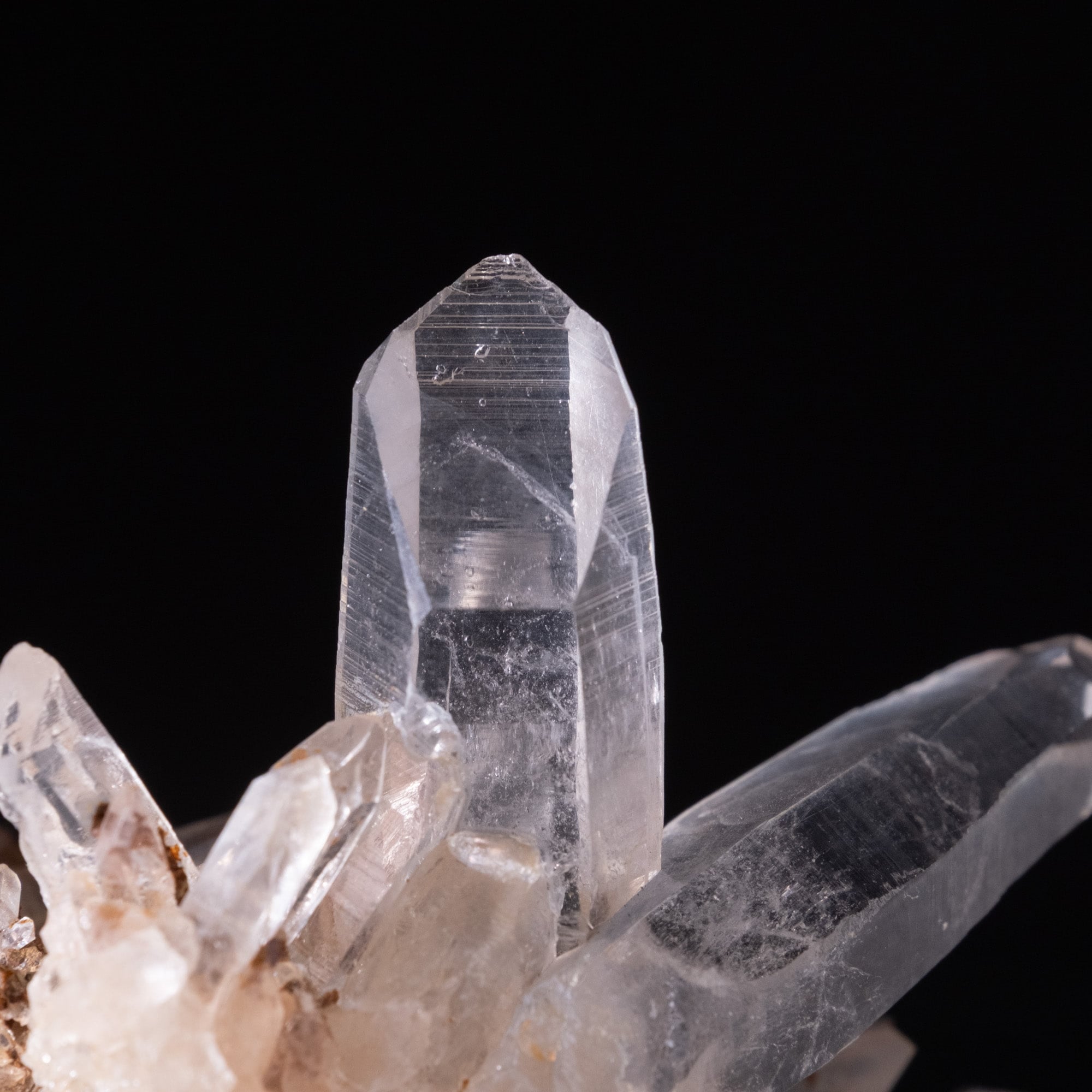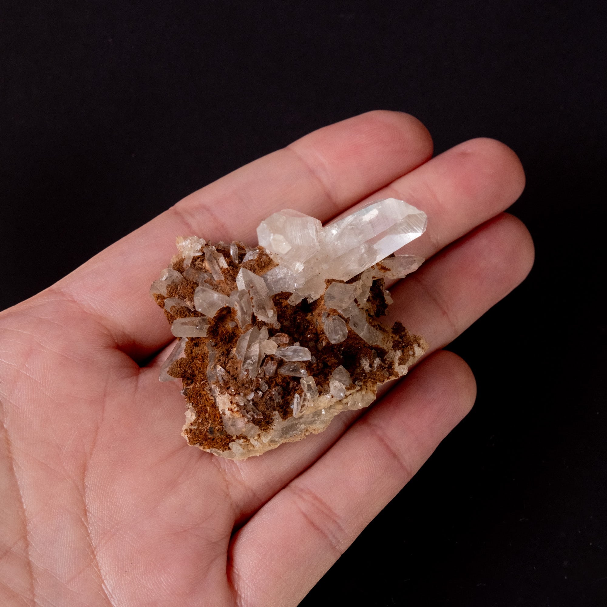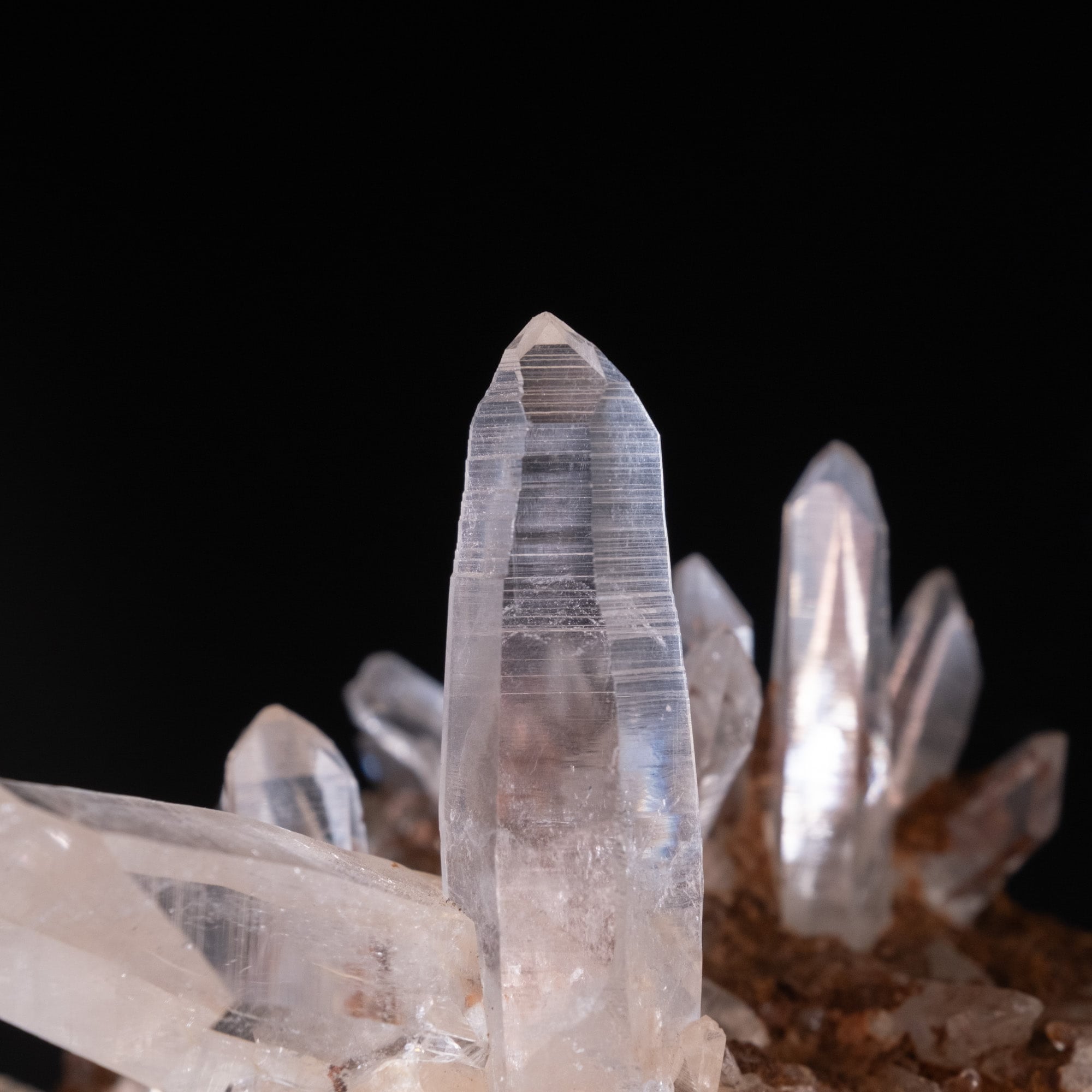細長い結晶が多いクラスターで、結晶の中にファントムも見られます。レシーバーと言われる七面の先端とバーコード状の模様も確認出来、手ごろなサイズ感も非常に魅力的です。