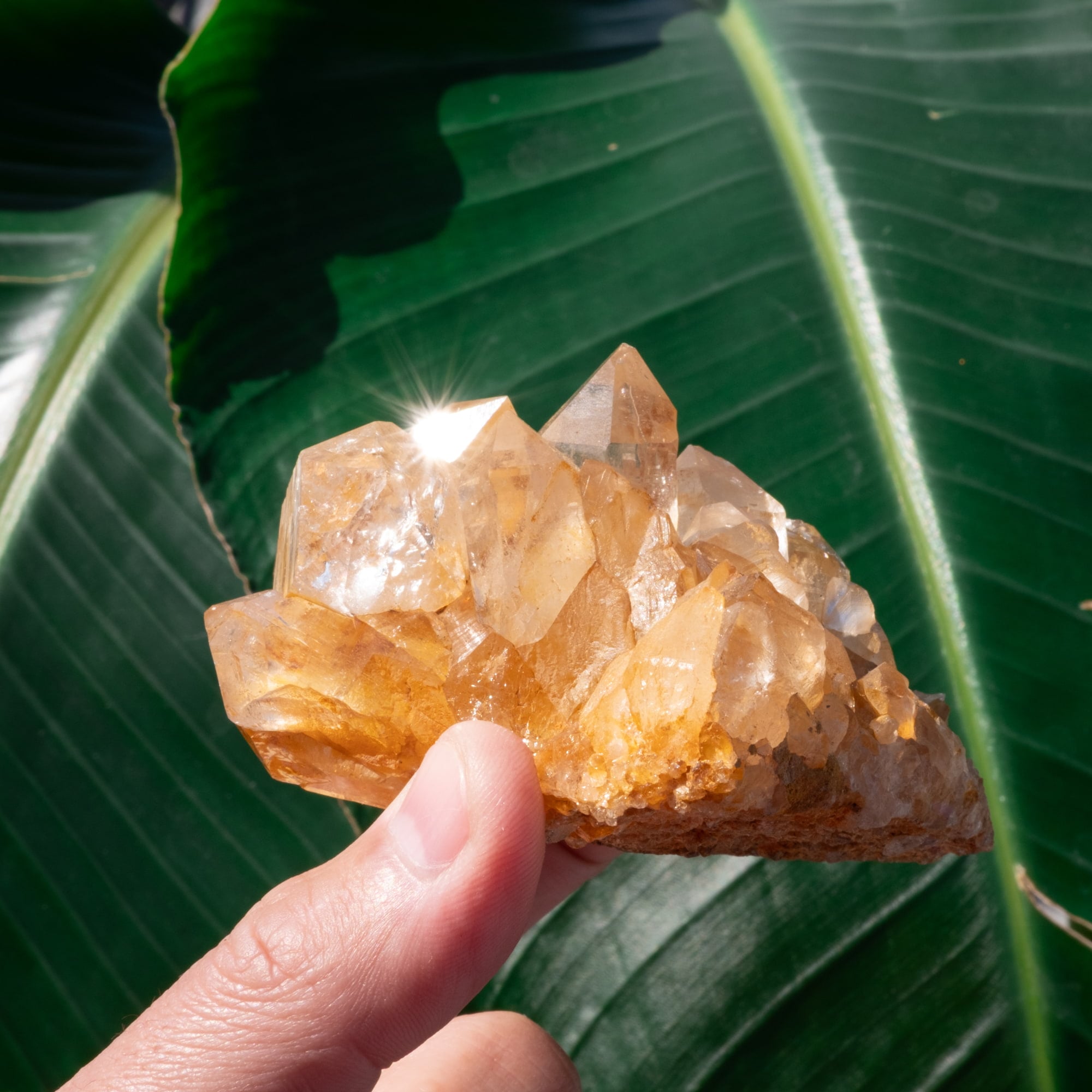 褐色したオレンジが非常に美しいクラスターで水晶の透明度も抜群です。バーコード状の模様も見られ、角度によってはレインボーも確認出来ます。