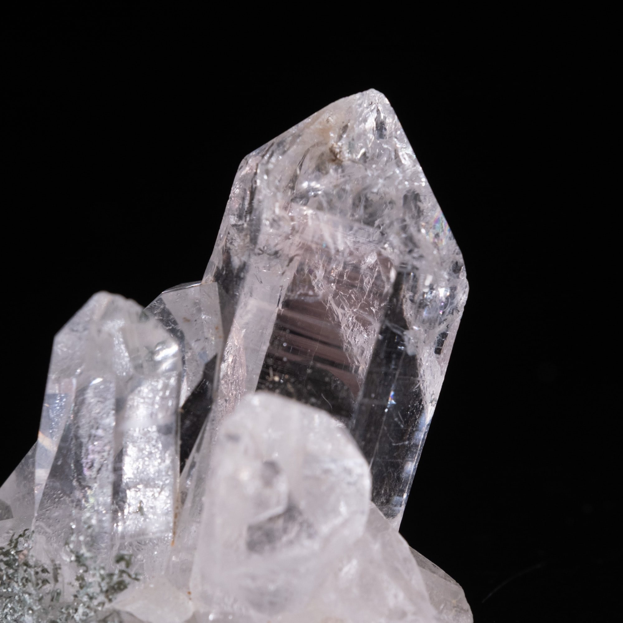 ・多様な表情: 緑色のクローライト(緑泥石)、黒色のアナテース(鋭錐石)、金色のルチル(金紅石)などが含まれる、個性豊かな結晶が見られます。