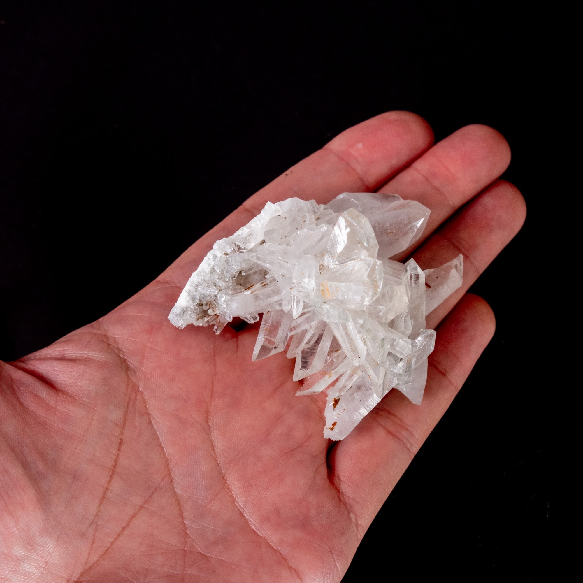 非常に透明度が高く細長い結晶のクラスターです。先端がレシーバーと言われる七角形のものが多く、バーコード状の模様も見られます。