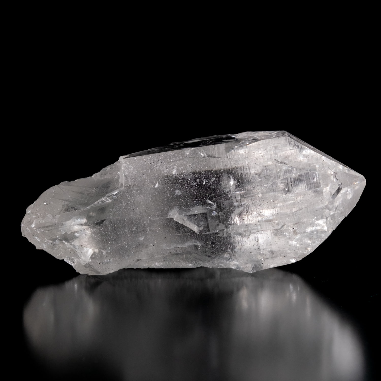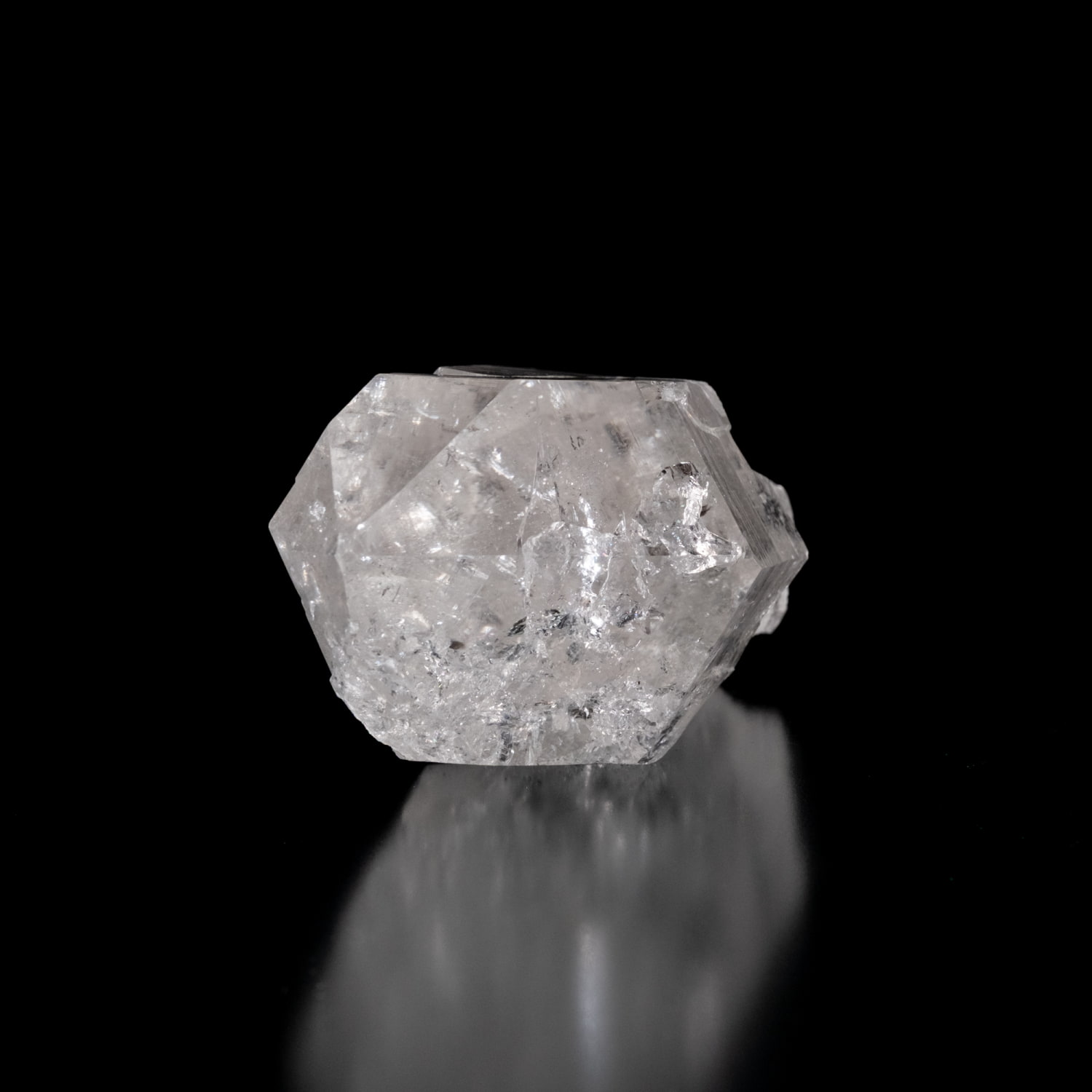 抜群の透明度で天然のクラックがまるで氷の様な質感です。ゲートウェイやセルフヒールドともとれる形状や表面にはバーコード状の模様も見られ、角度によってはレインボーも確認出来ます。