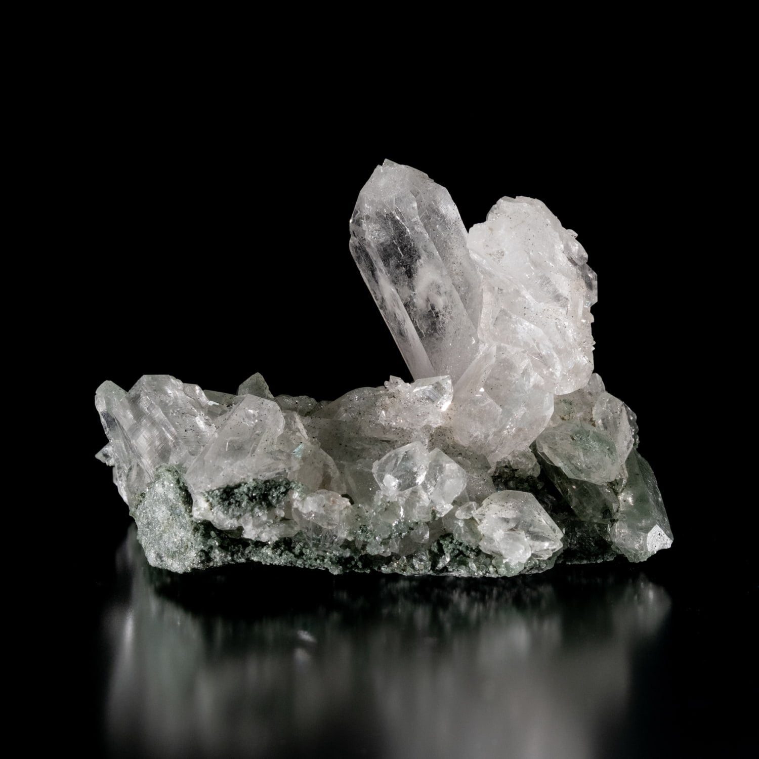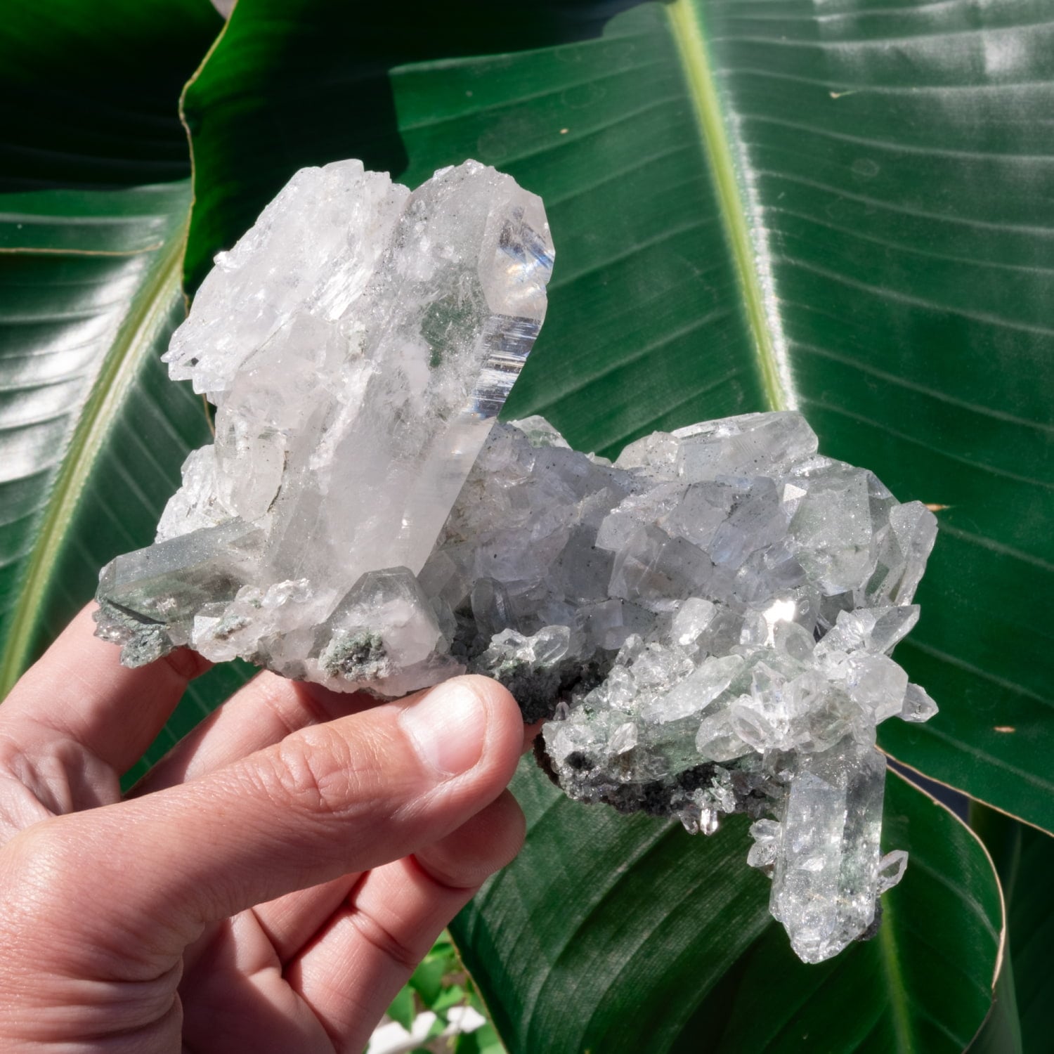 抜群の透明度で程よい大きさの結晶のクラスターです。母岩が薄くクローライトのグリーンがガーデン状に程よく内包され、ダブルポイントやセルフヒールドともとれる形状にバーコード状のも見られます。