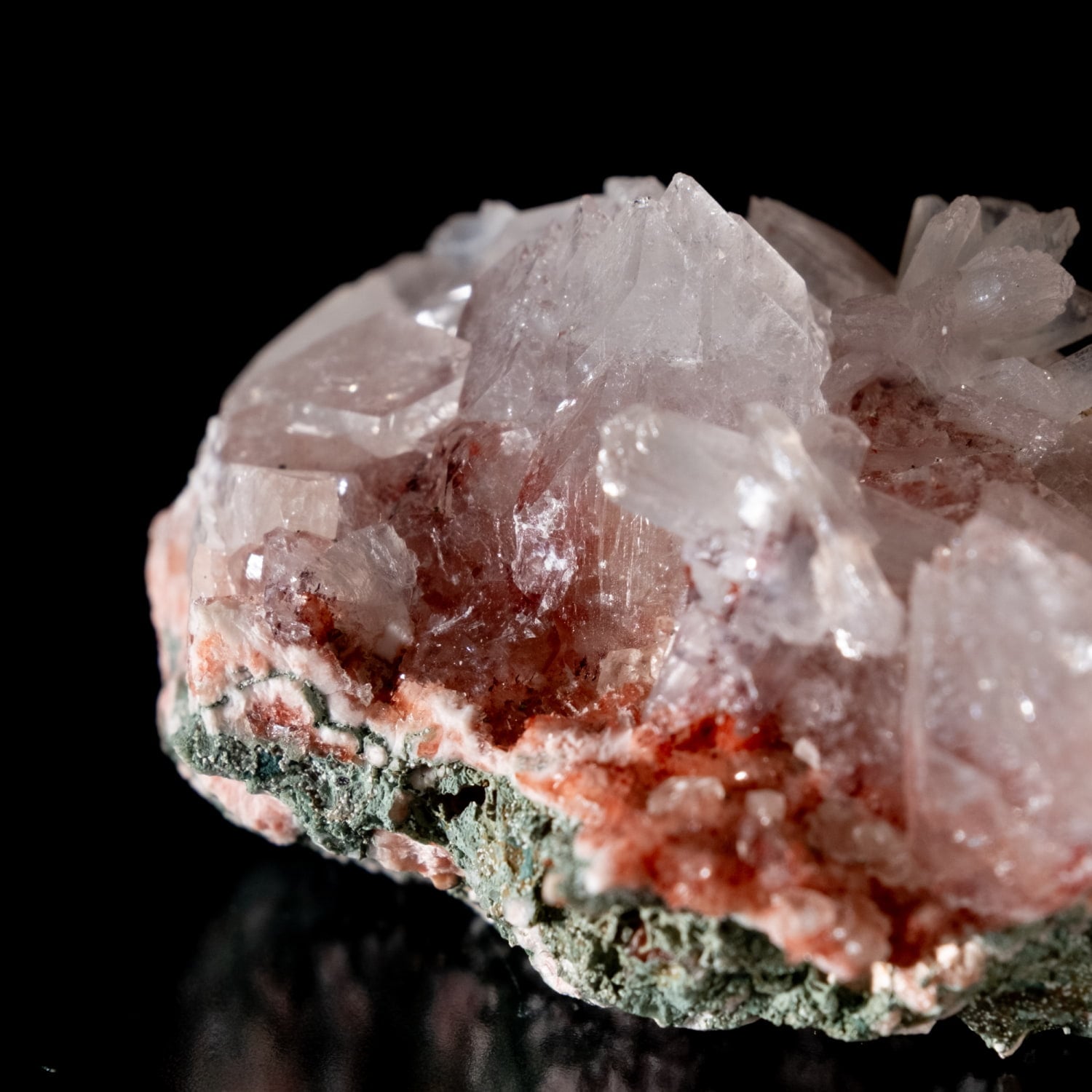 色合いの仕組み: 結晶の表面を覆った鉄分が、透明なアポフィライトを通して見えることで鮮やかな赤色を呈します。・主な産地: インド・マハラシュトラ州(アウランガーバード周辺など)が有名な産地です。