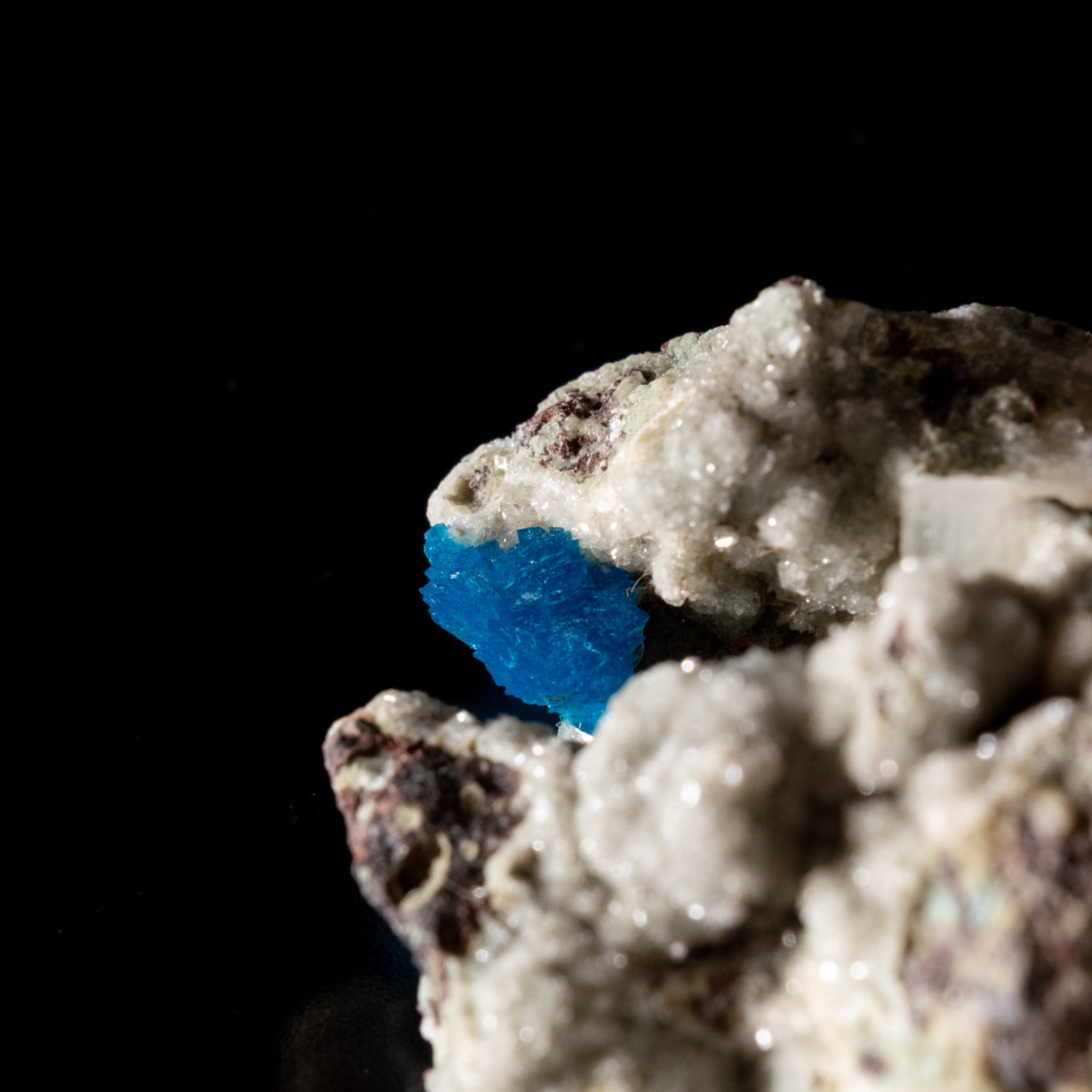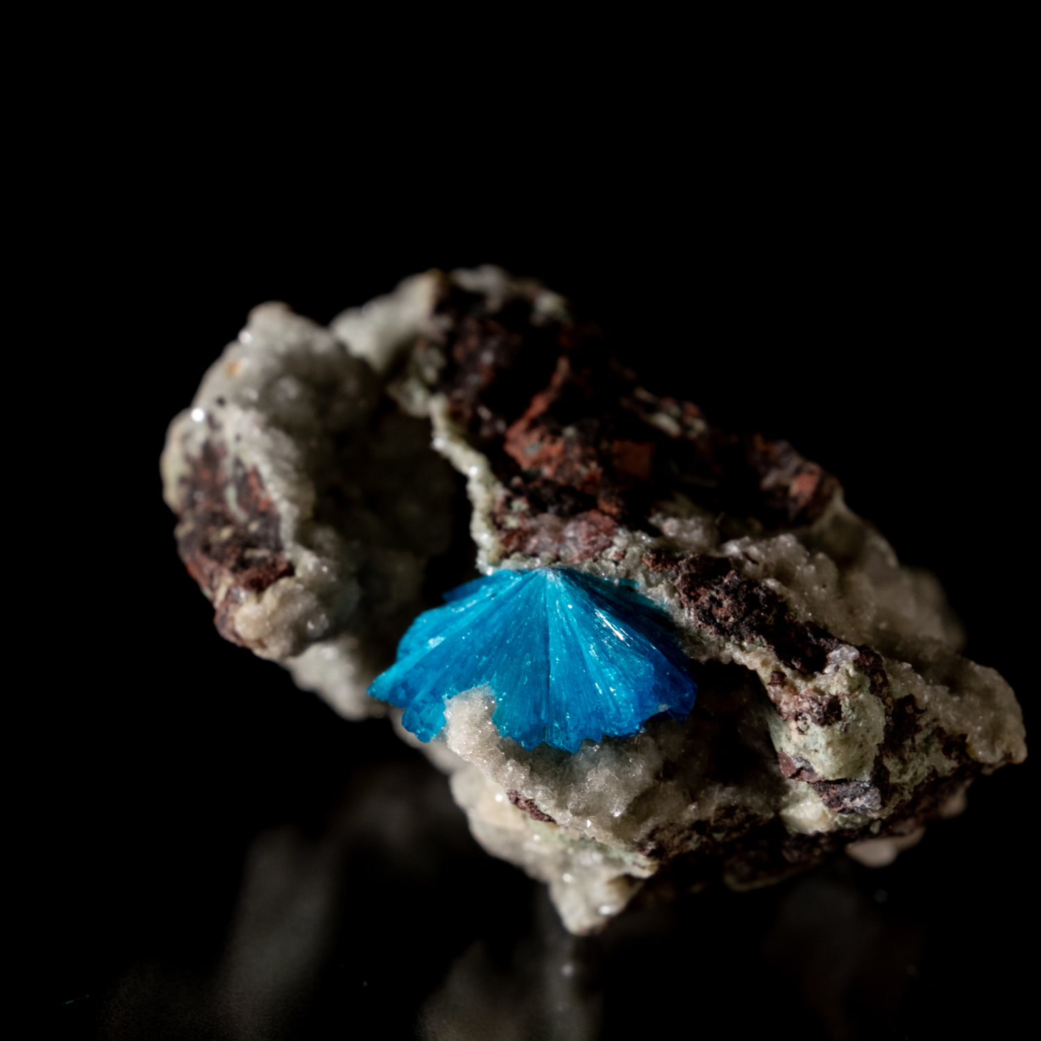 ・外観: 針状の結晶が放射状に成長し、母岩の上に「ポンポン」のような丸い球状クラスター(集合体)を作ります。白い沸石(スチルバイト等)を母岩として産出することが多く、青と白のコントラストが極めて美しいのが特徴です。
