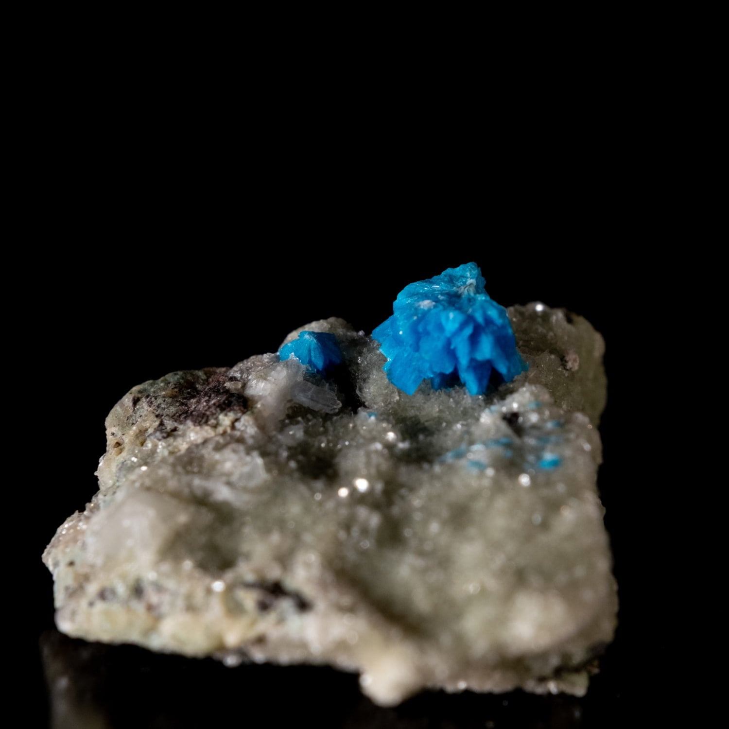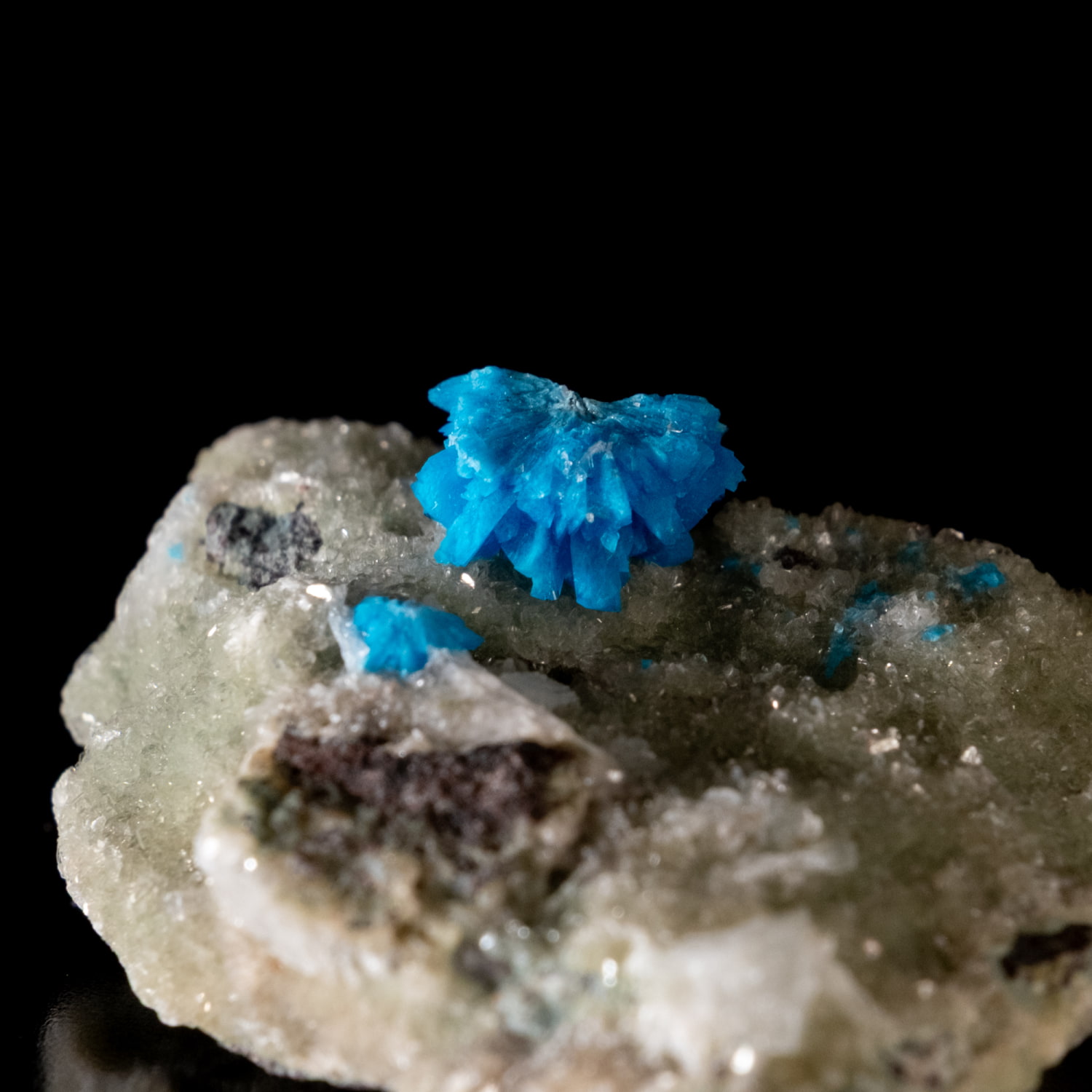 ・外観: 針状の結晶が放射状に成長し、母岩の上に「ポンポン」のような丸い球状クラスター(集合体)を作ります。白い沸石(スチルバイト等)を母岩として産出することが多く、青と白のコントラストが極めて美しいのが特徴です。