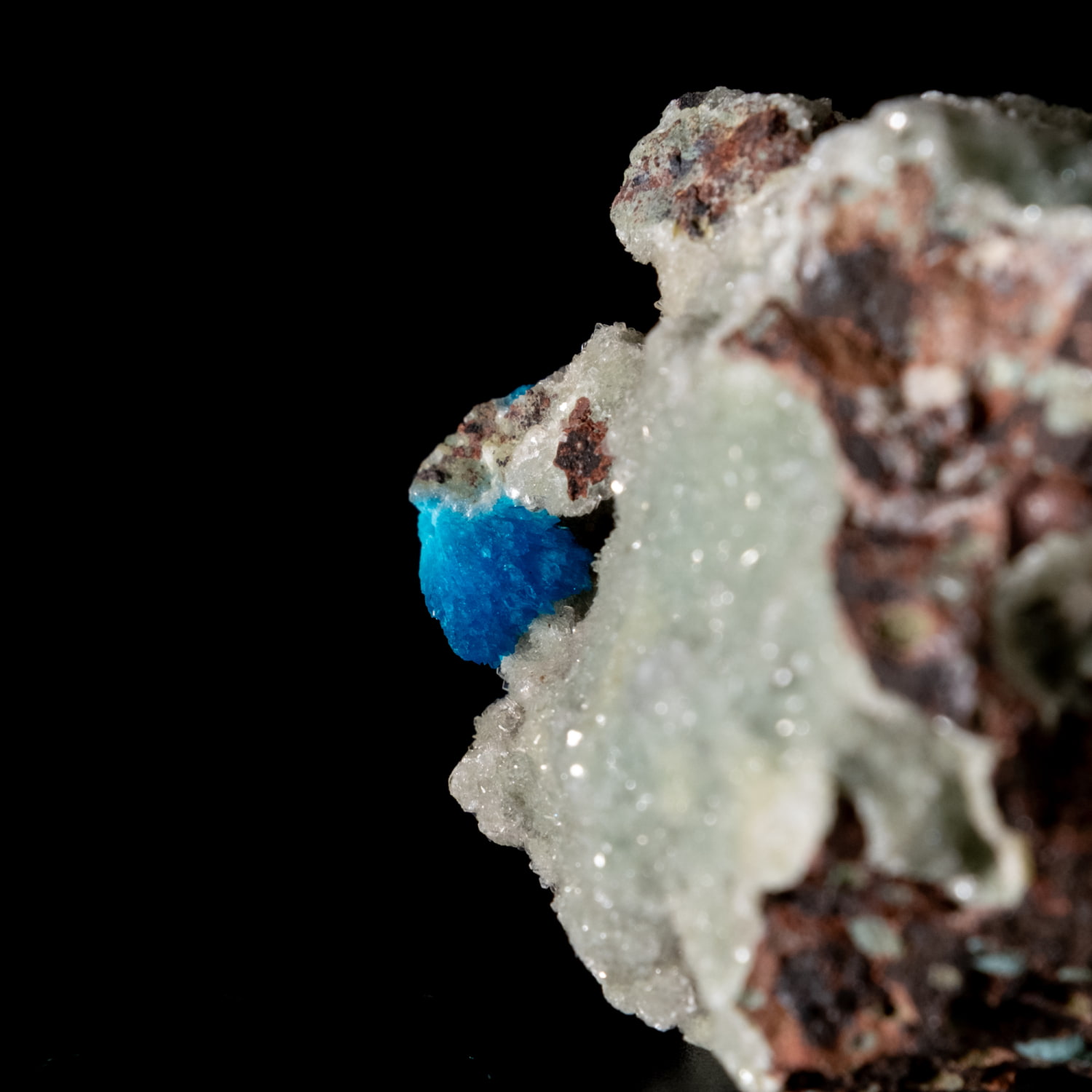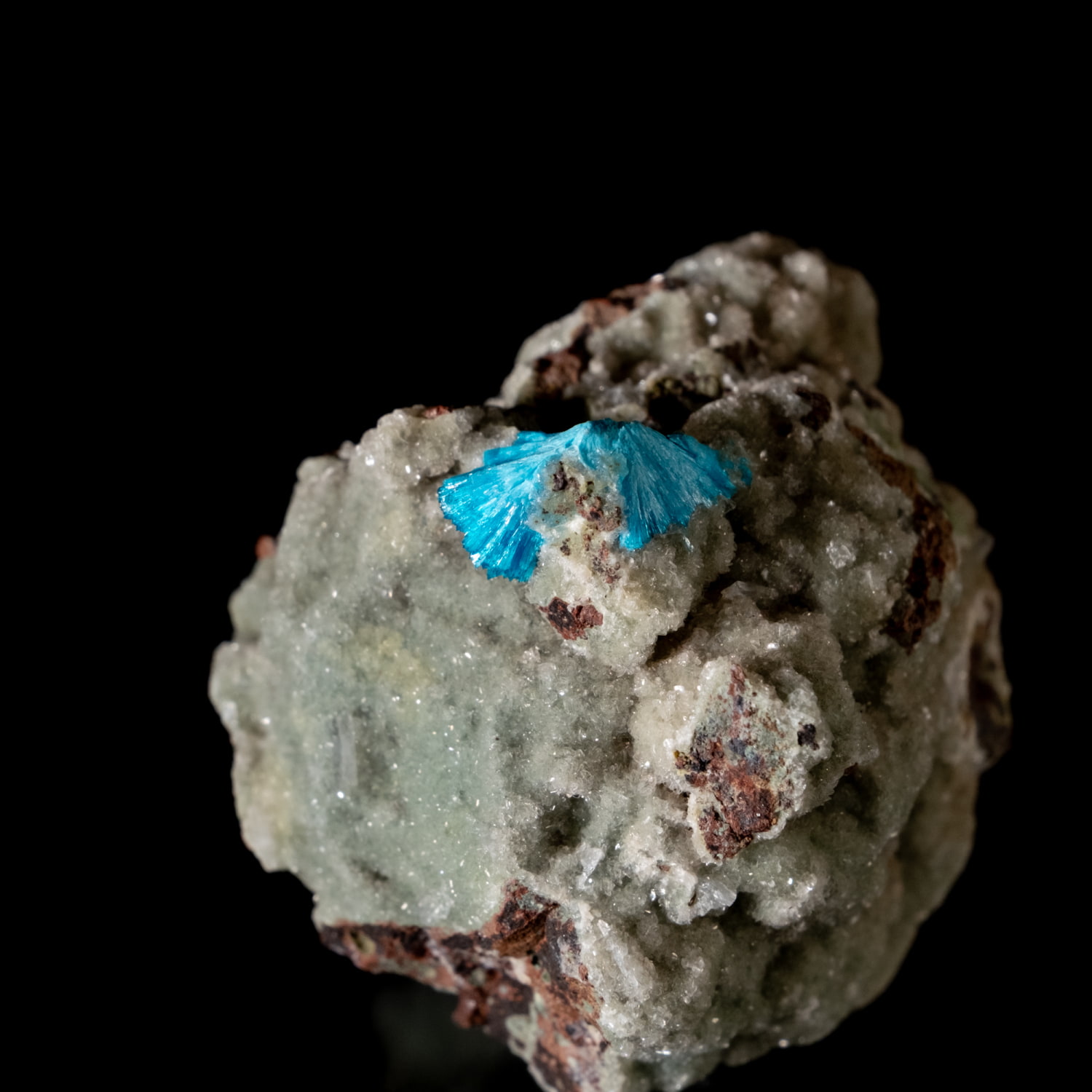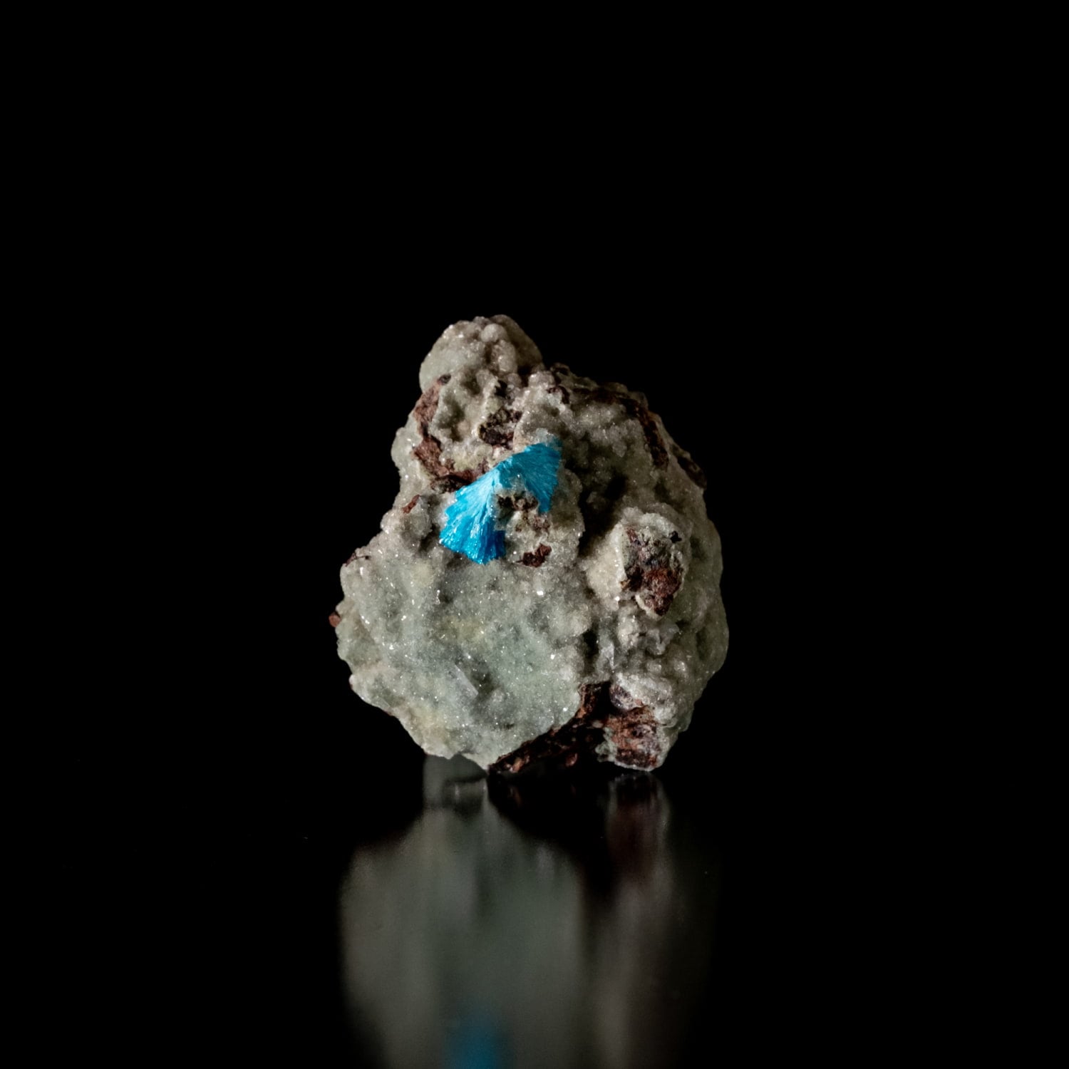 ・外観: 針状の結晶が放射状に成長し、母岩の上に「ポンポン」のような丸い球状クラスター(集合体)を作ります。白い沸石(スチルバイト等)を母岩として産出することが多く、青と白のコントラストが極めて美しいのが特徴です。