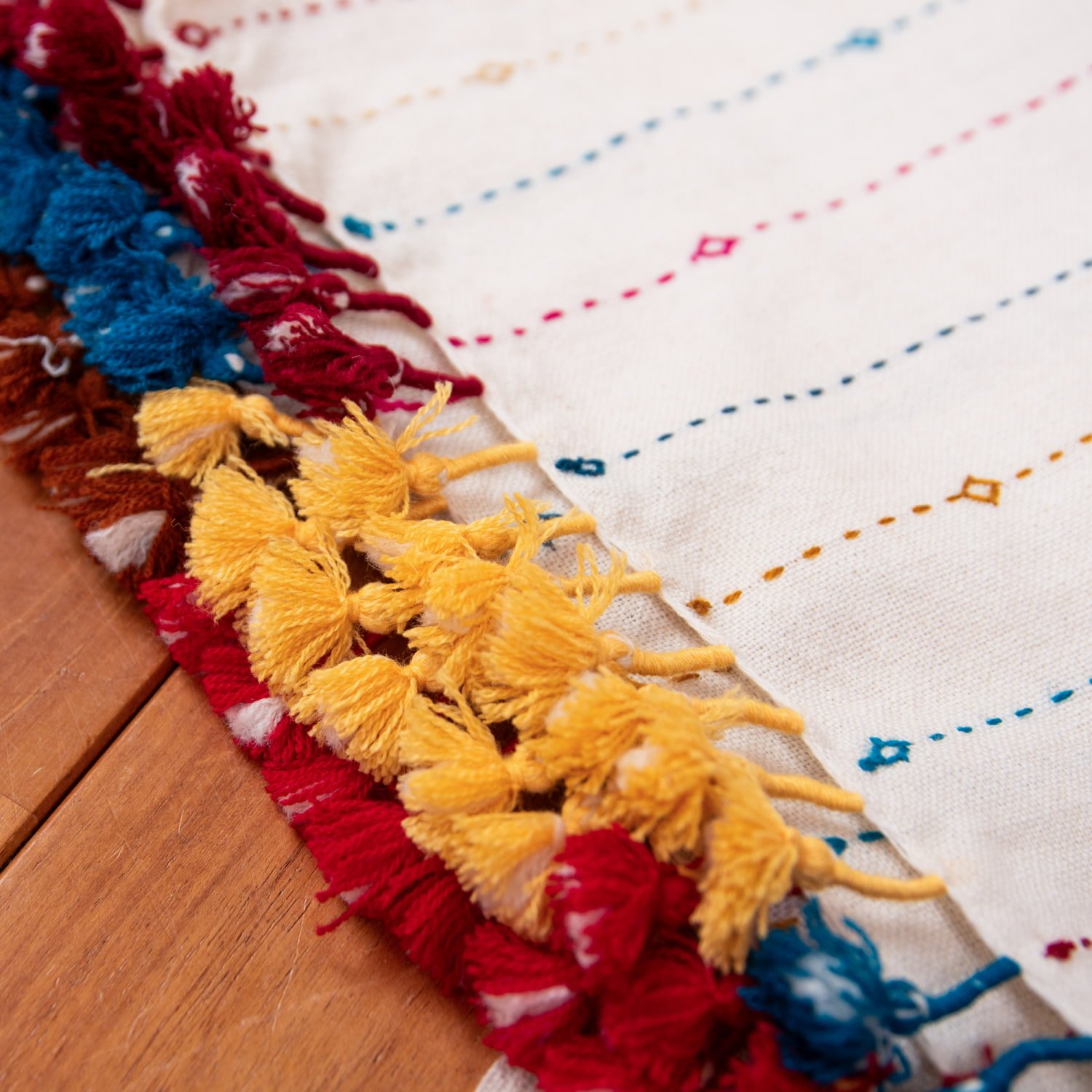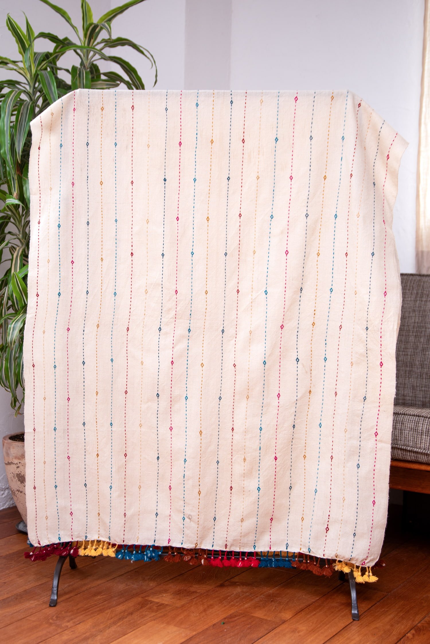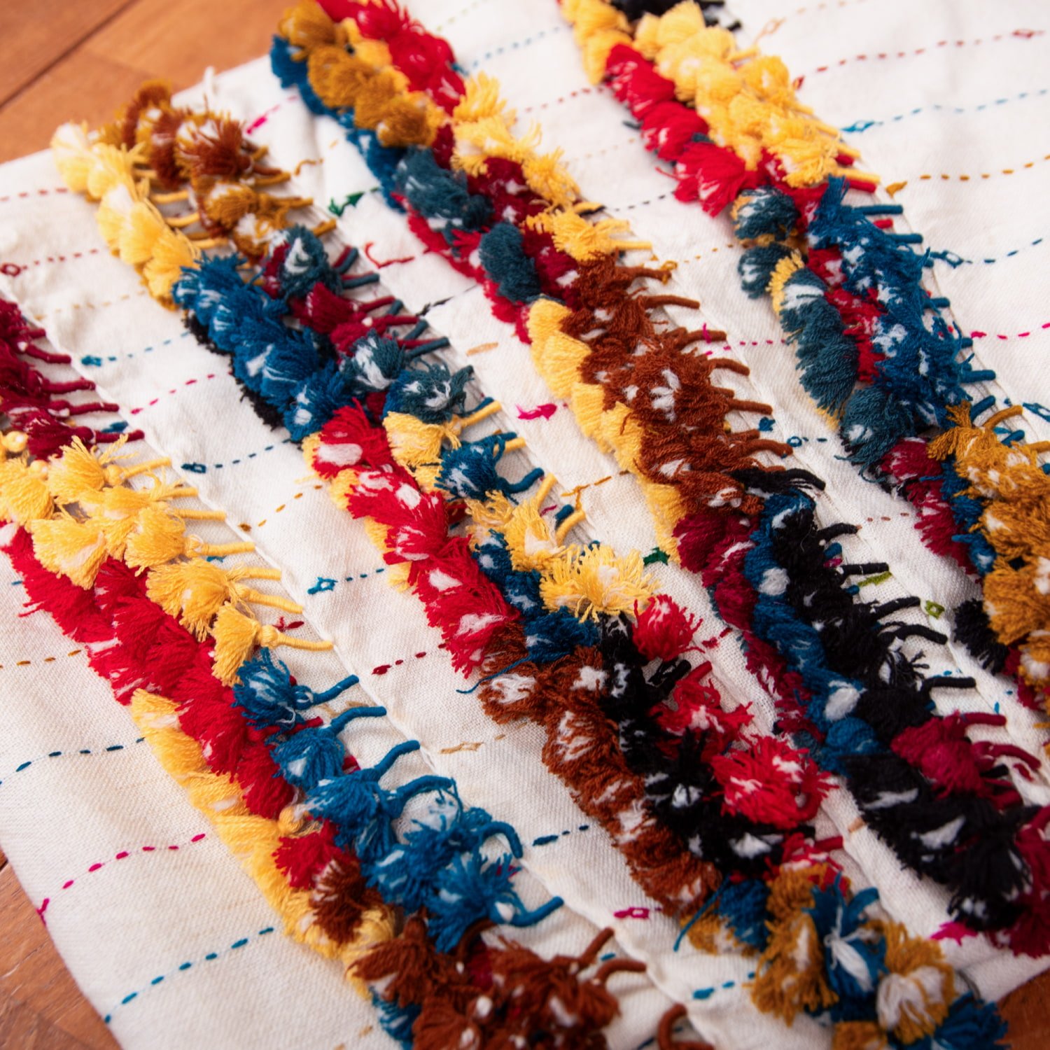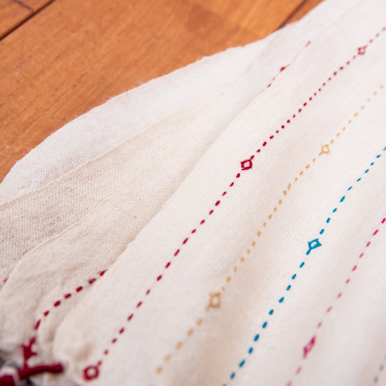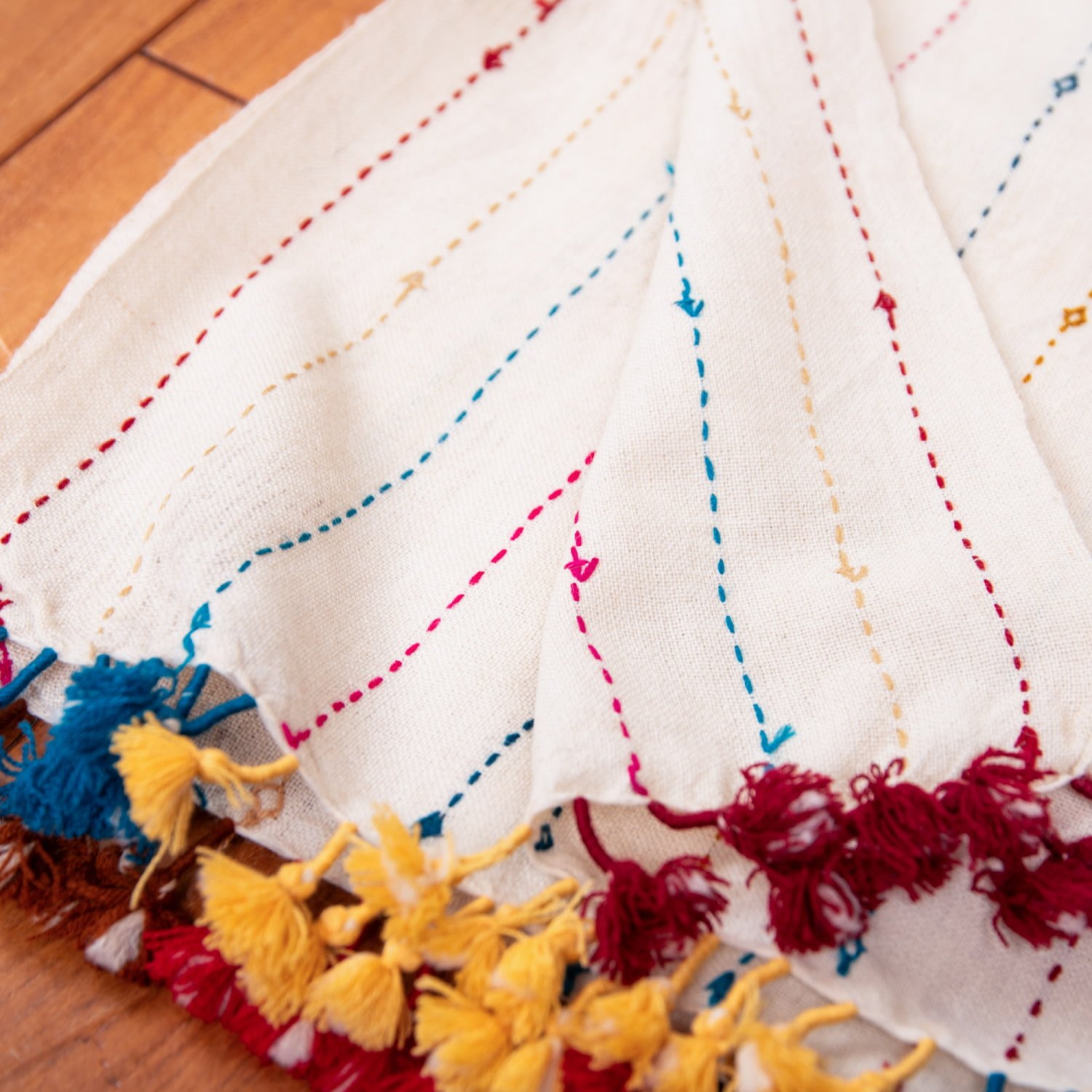 色合いや細かな刺繍が美しいショール。シンプルな服に合わせて羽織ったり、お部屋でひざ掛けとして使用しても◎。とても美しいデザインなので、お部屋に置いておくだけでもインテリアの1部としてお楽しみいただけると思います。