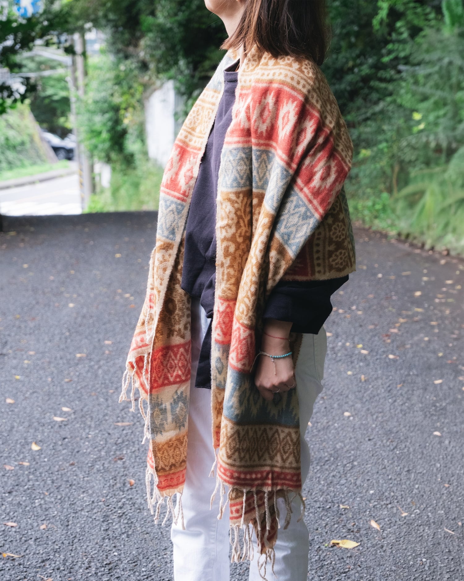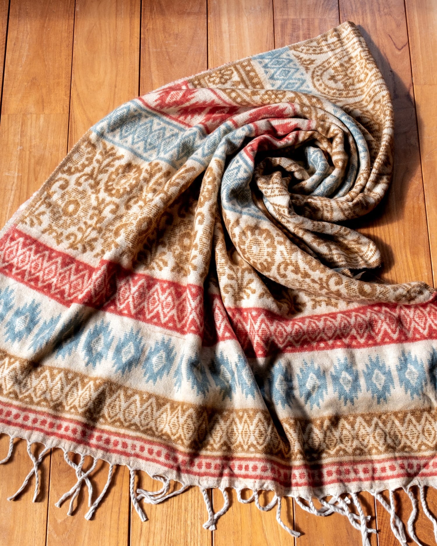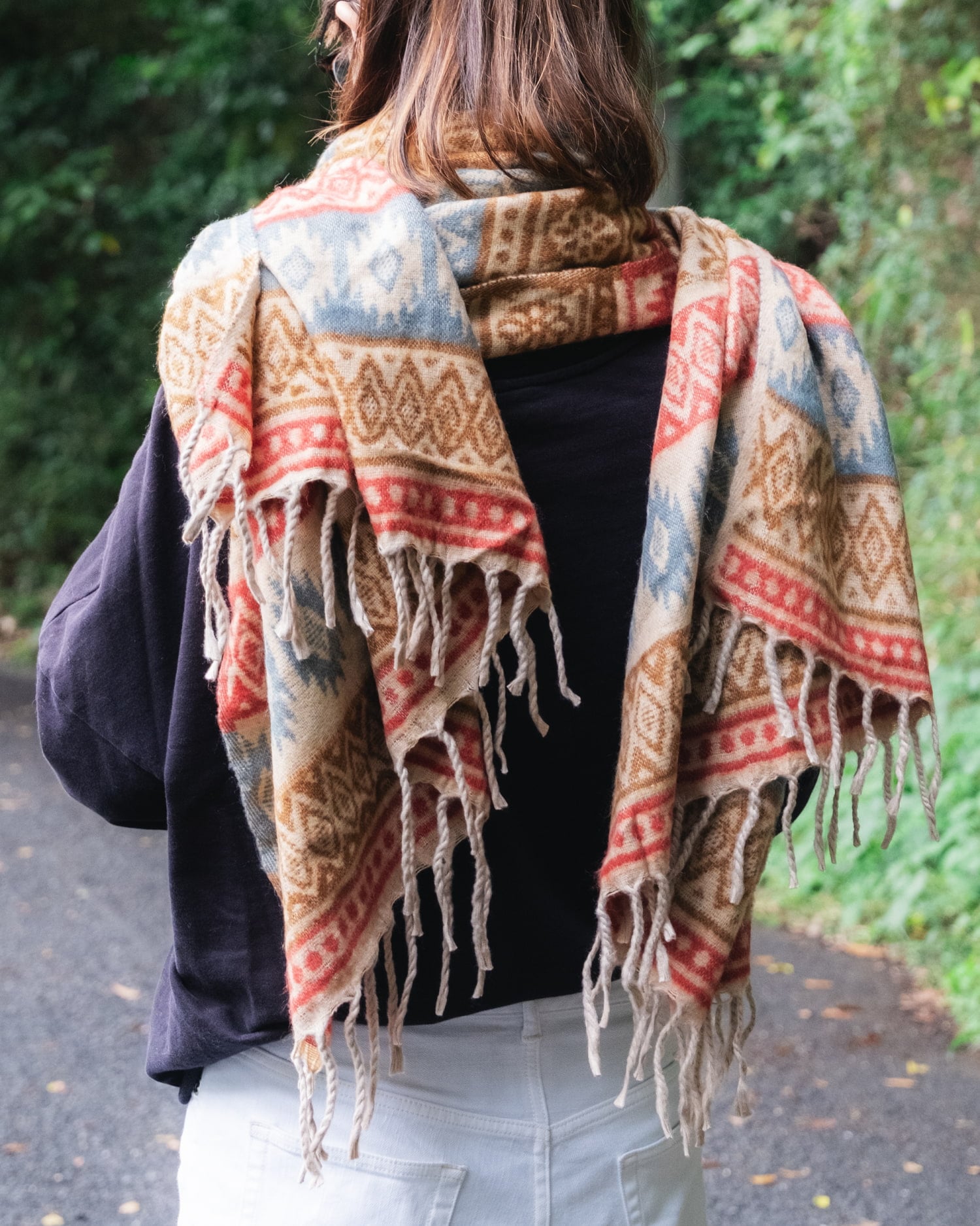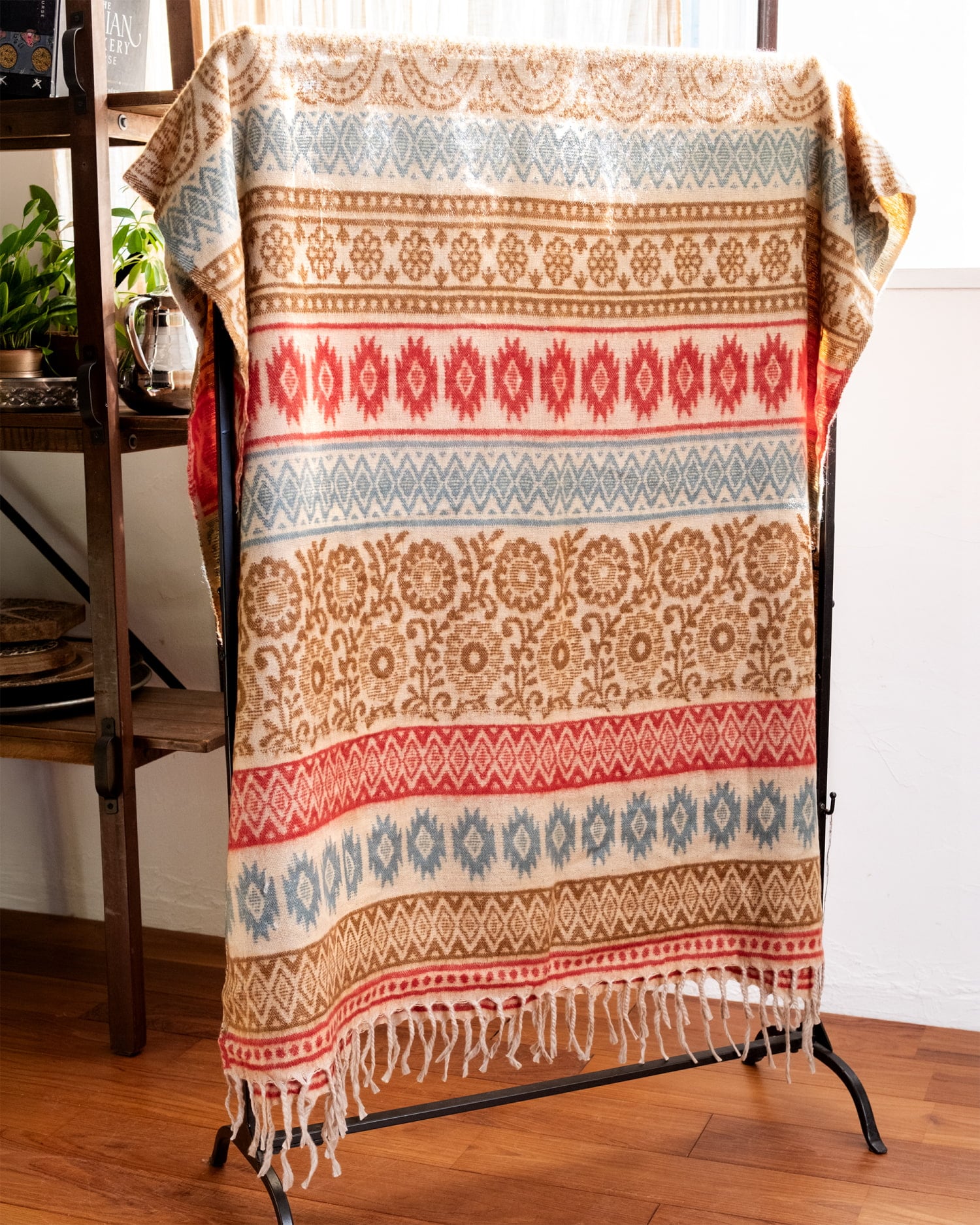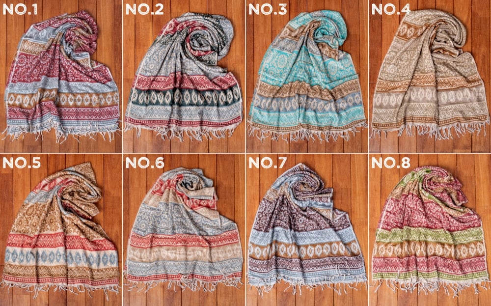 柔らかな起毛で温まる トライバル柄の機織りストール