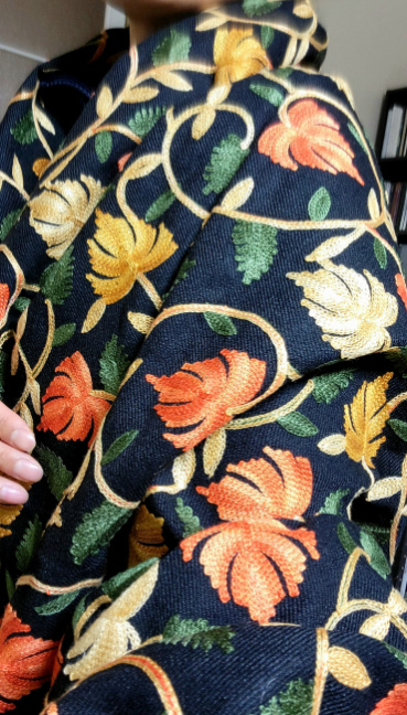 細かな刺繍がとっても豪華で素敵なストールです!広げて背中じゅうを覆うと柄の存在感抜群ですし、首元にくしゅっとまとめてぐるりと巻いても華やかな柄が効いてくれて、他が地味な格好でも一気におしゃれになります♪刺繍の糸ほつれもなく色もとても綺麗で、とても気に入りました!(No.3を購入しました)