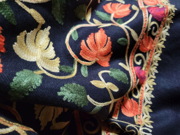 北インドのカシミール地方で脈々と受け継がれている「カシミール刺繍」。絵画のように繊細なデザインと美しい色使いで評価されているカシミール地方の伝統品です。