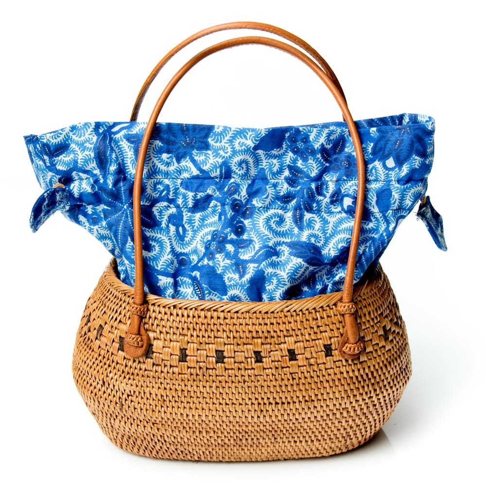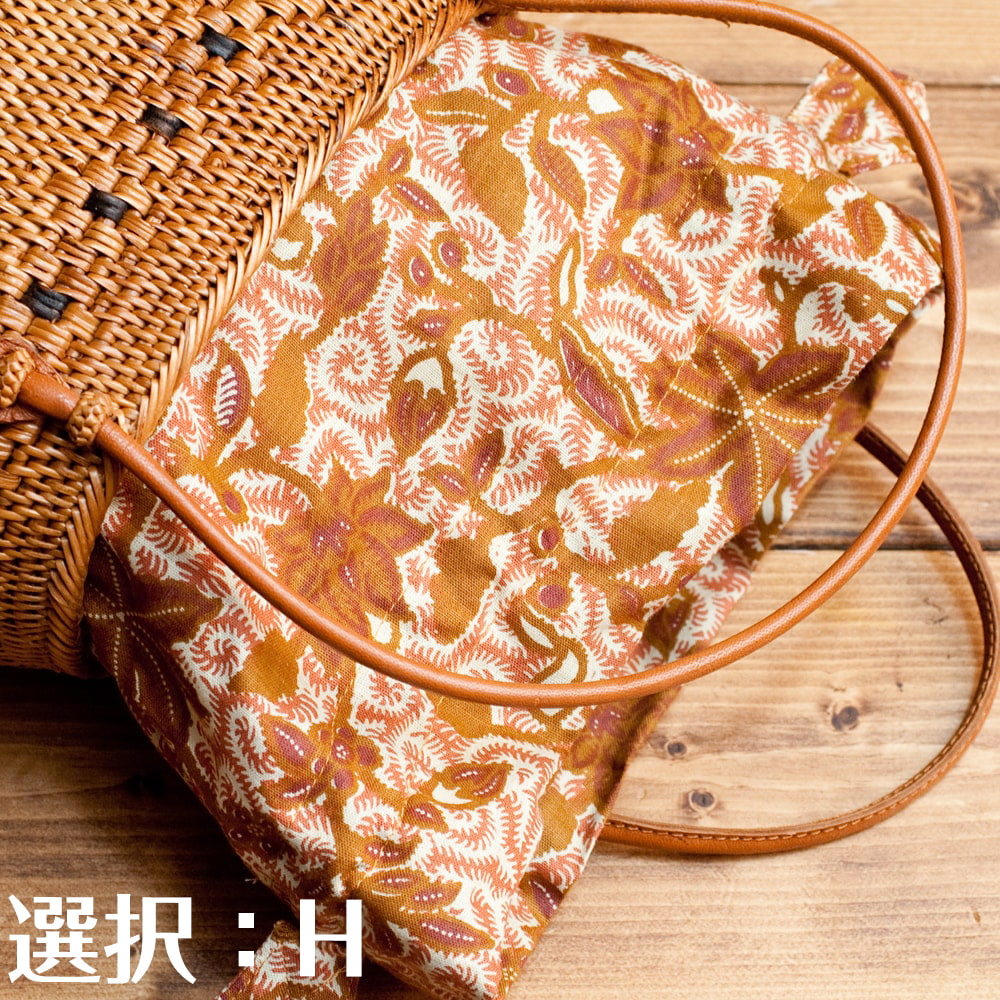 ハンドメイドのぬくもりを感じる、中くらいサイズのアタバッグです。伝統的な、ろうけつ染めをプリントした、南国らしいバティックの布も素敵です。お好みの柄をお選び下さいませ。一つ一つが手で編まれているとは思えない上質さ。防虫効果があり、長持ちするココナッツの燻し加工の香りが素敵です。