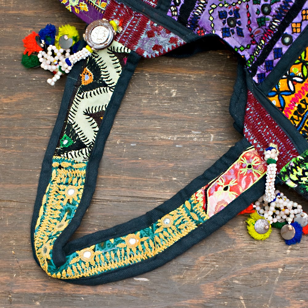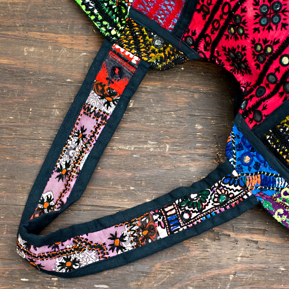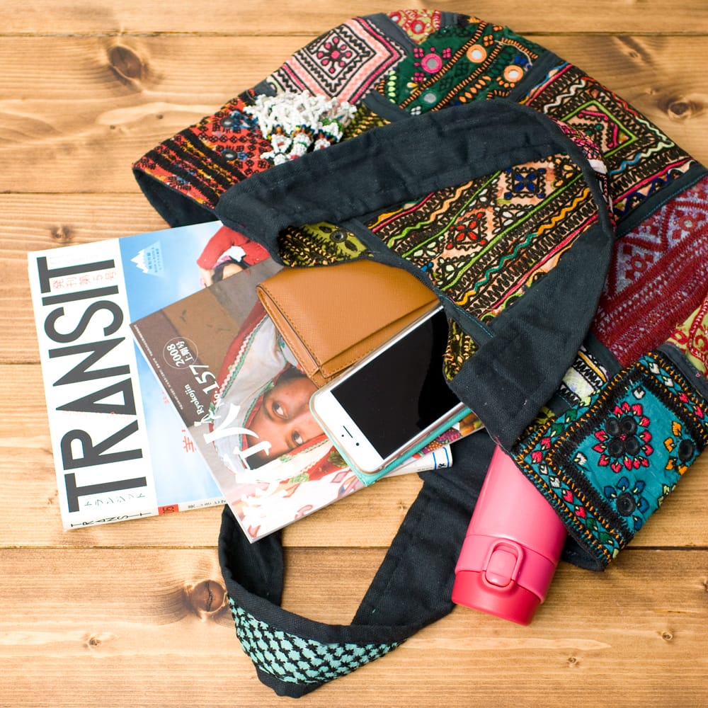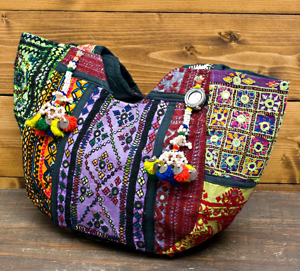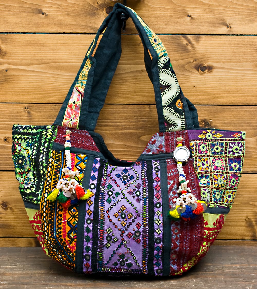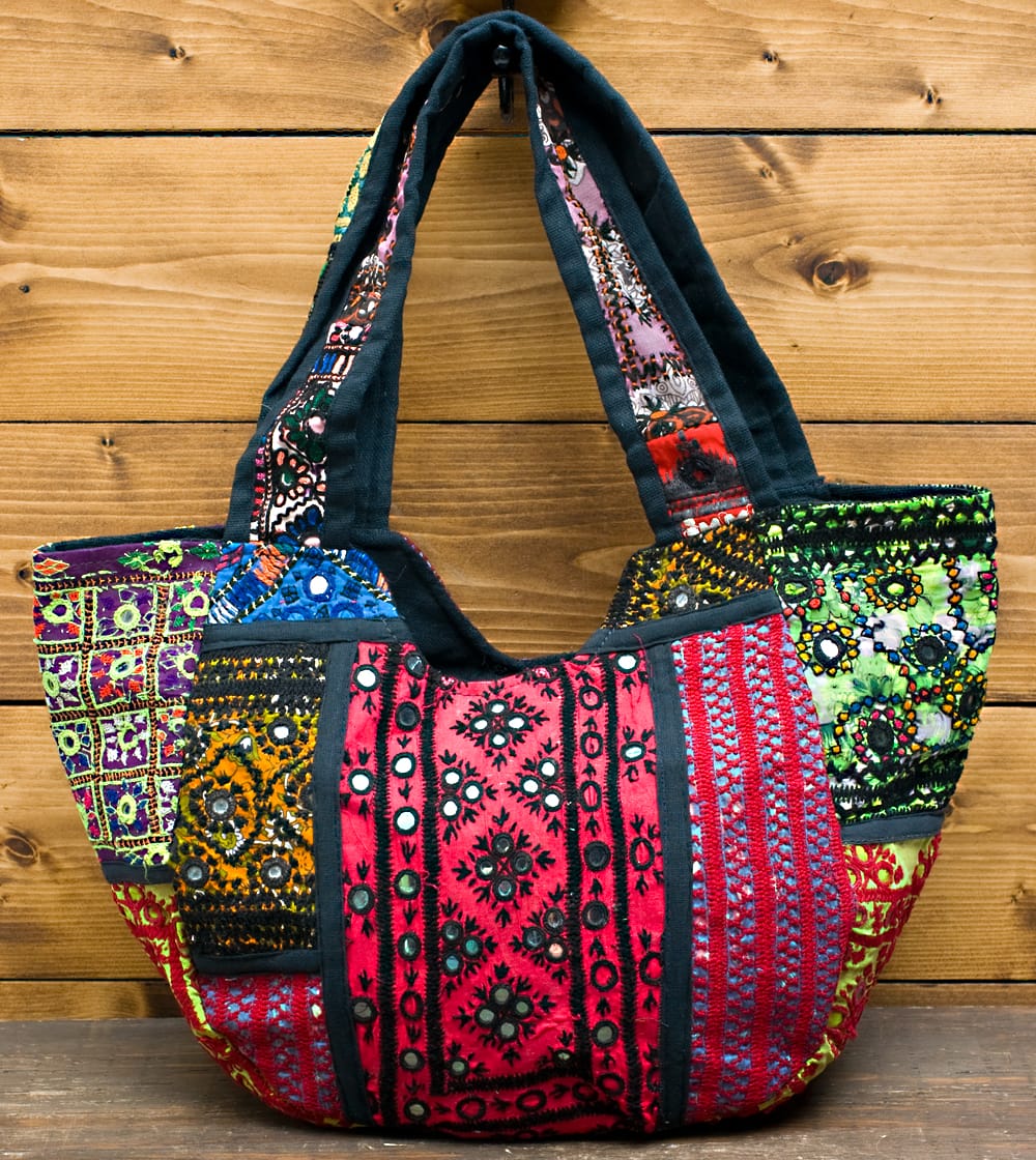 古布を1枚1枚配置し、パッチワークのようにつなぎ合わせたバッグです。色鮮やかなカラフルな布地に、ビーズやミラーワークがほどこされていたりと、存在感たっぷりのバッグです。古布が1枚1枚職人の手によって合わさり、バッグに生まれ変わる・・・その配色は世界にひとつだけ。まさにどのバッグにもオンリーワンの特別感があります。トートバックタイプでちょうどいい大きさなので非常に使いやすく、お出かけがより楽しくなりそうですね