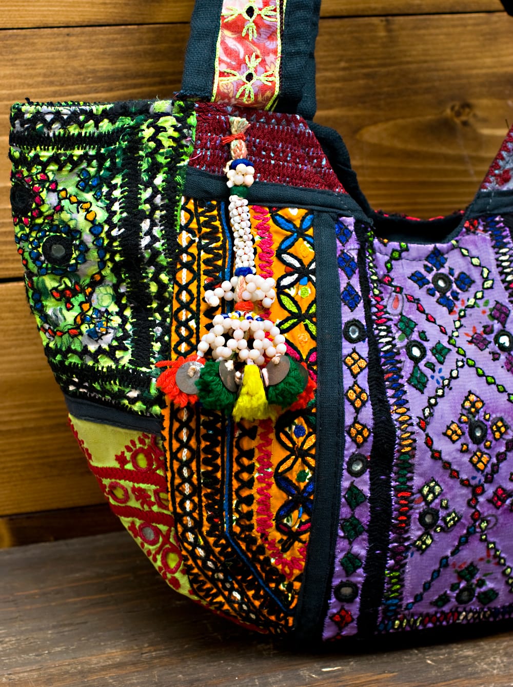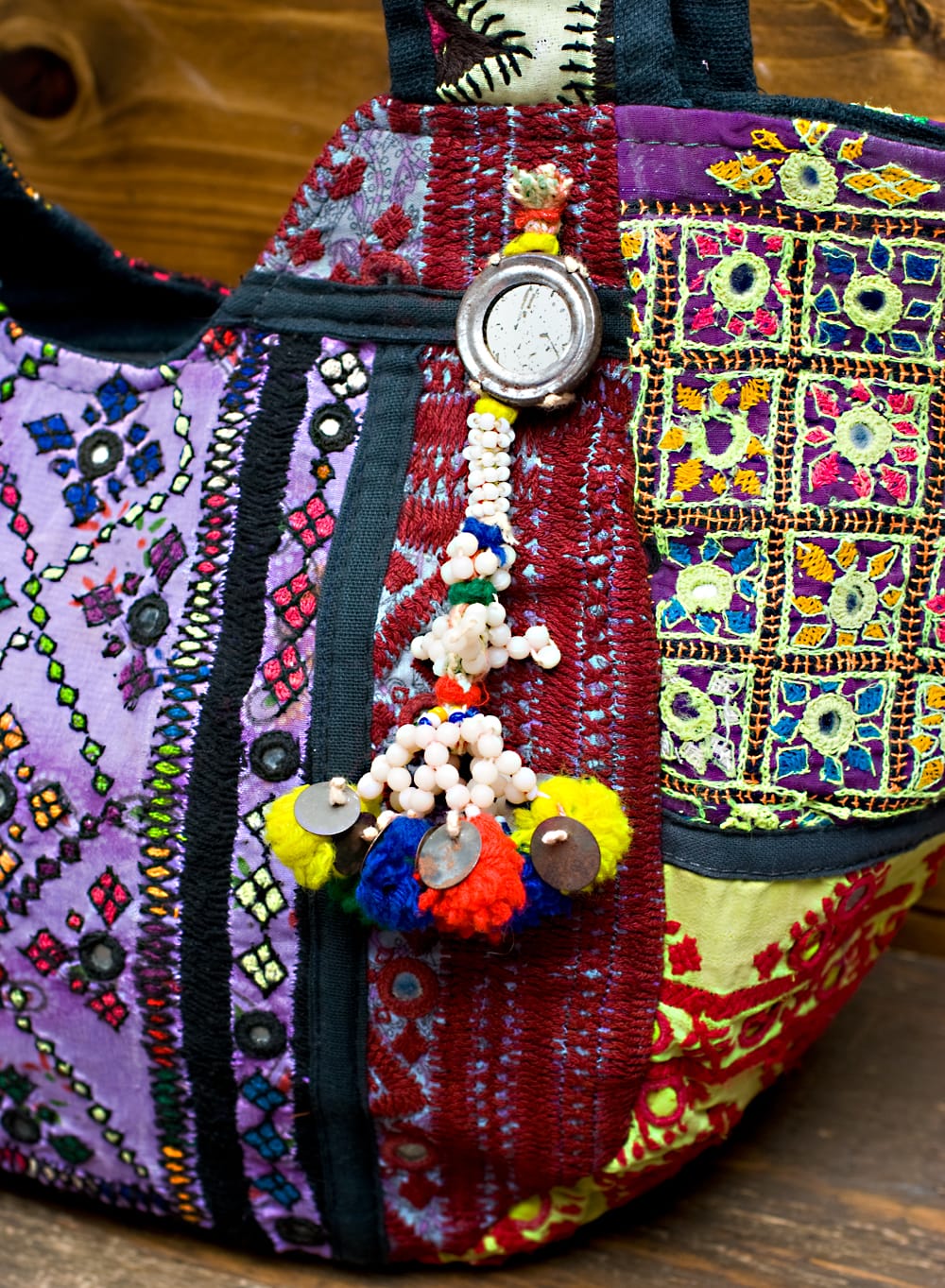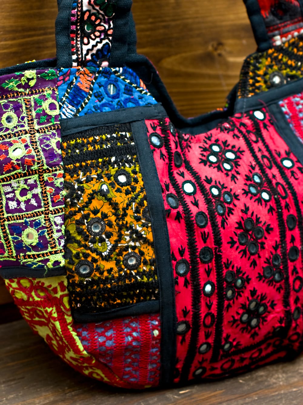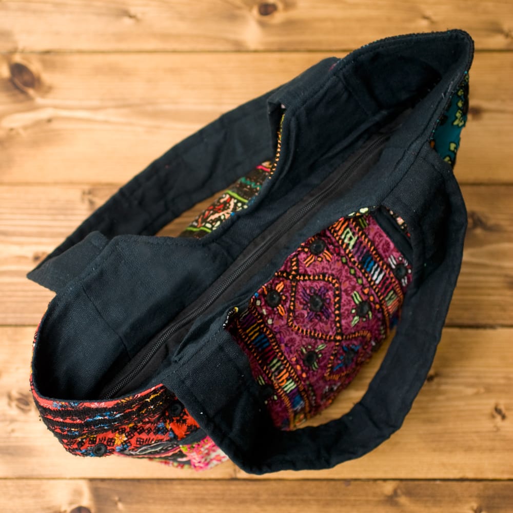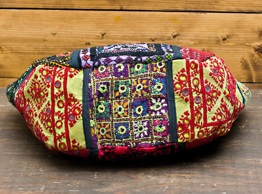 古布を1枚1枚配置し、パッチワークのようにつなぎ合わせたバッグです。色鮮やかなカラフルな布地に、ビーズやミラーワークがほどこされていたりと、存在感たっぷりのバッグです。古布が1枚1枚職人の手によって合わさり、バッグに生まれ変わる・・・その配色は世界にひとつだけ。まさにどのバッグにもオンリーワンの特別感があります。トートバックタイプでちょうどいい大きさなので非常に使いやすく、お出かけがより楽しくなりそうですね