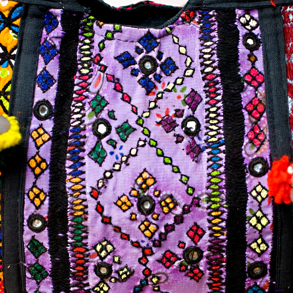 使用している生地は、中央アジアと南アジアの交差点からやって来た古布です。もう着なくなった民族衣装や装飾品の一部を切り取り、予め用意しておいた型紙に合わせて、布を貼りあわせていきます。まったく別々の雰囲気を醸し出していた古布たちがひとつの型紙に貼り合わされると、まるで初めからそうであったかのように、ピッタリと独特の雰囲気で収まるから不思議。各々の個性をだしつつ、しっくりとまとまり、ひとつのバッグとして縫い合わされていきます。「素材は南アジアを巡る – 中央アジアと南アジアの交差点からインドまで!」に詳しい記事がございますので、是非御覧ください。