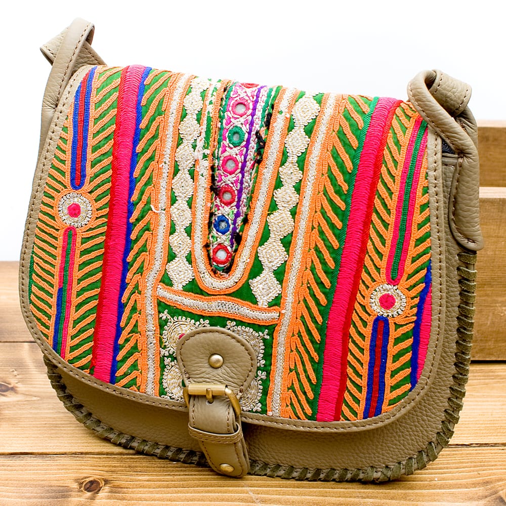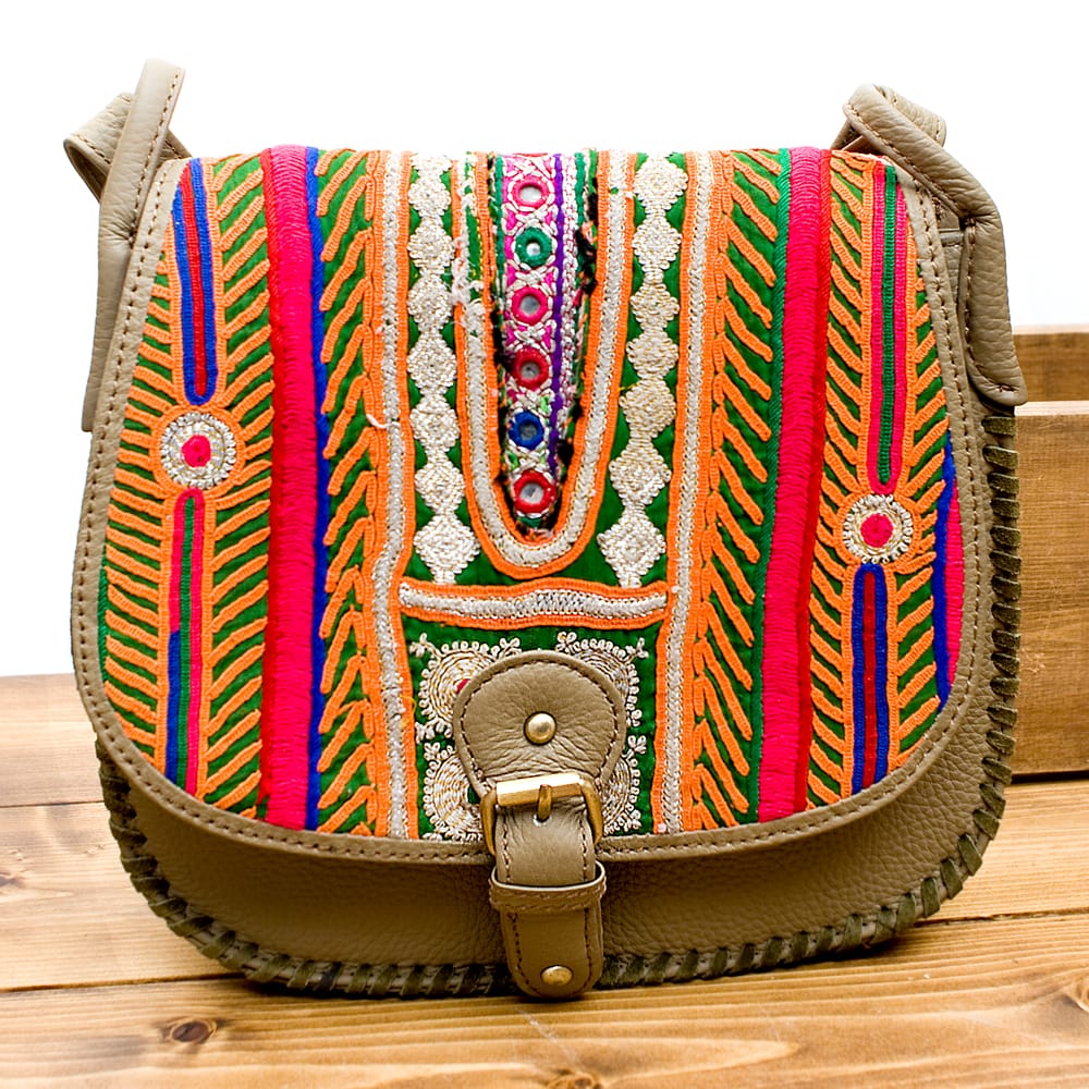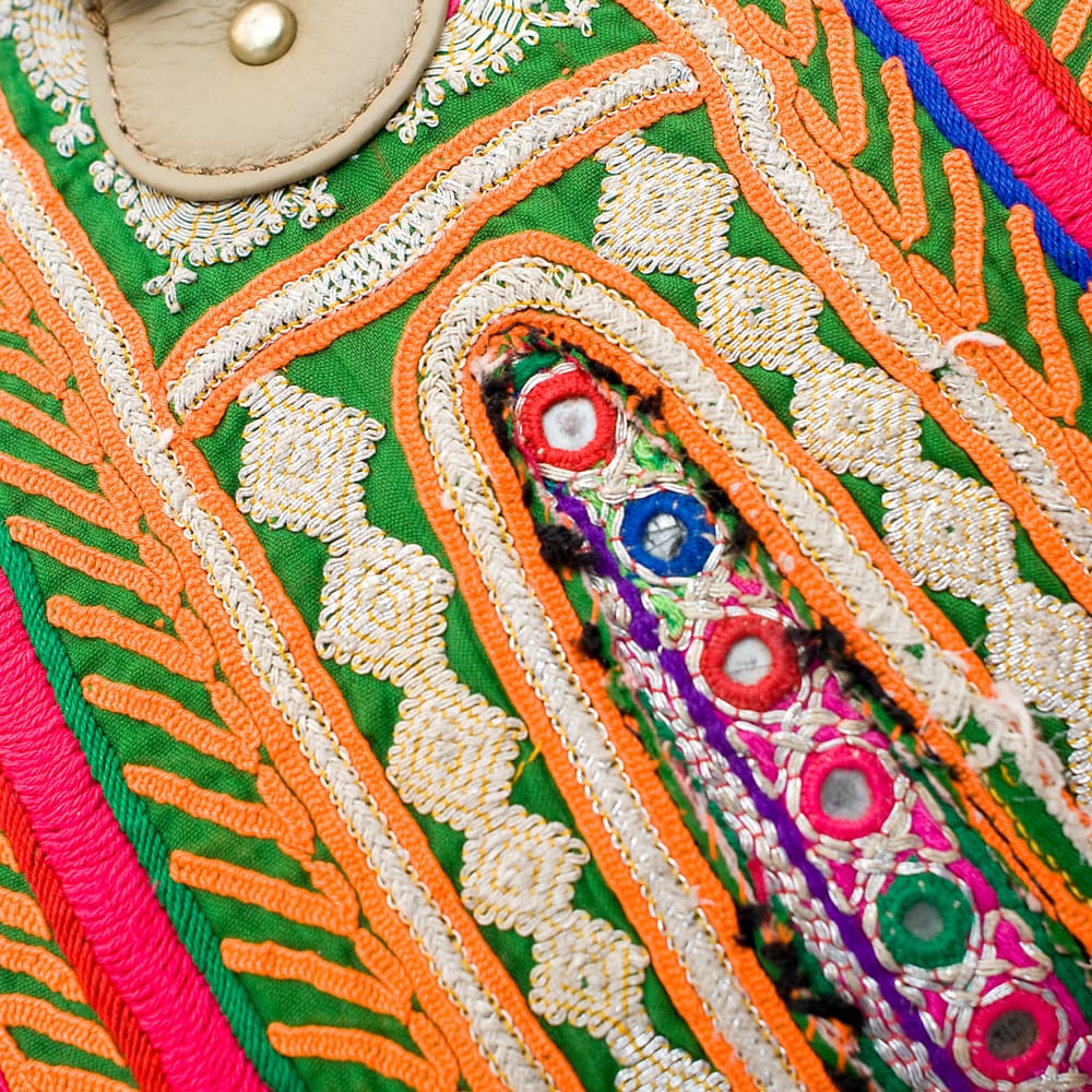 古布を1枚1枚配置し、パッチワークのようにつなぎ合わせたバッグです。色鮮やかなカラフルな布地に、ビーズやミラーワークがほどこされていたりと、存在感たっぷりのバッグです。
