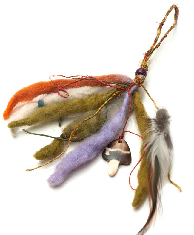 全体はこんな感じです。フェザー、ヘンプ、水牛の骨で作ったマッシュルームのアクセ、フェルトのMixが可愛いです。