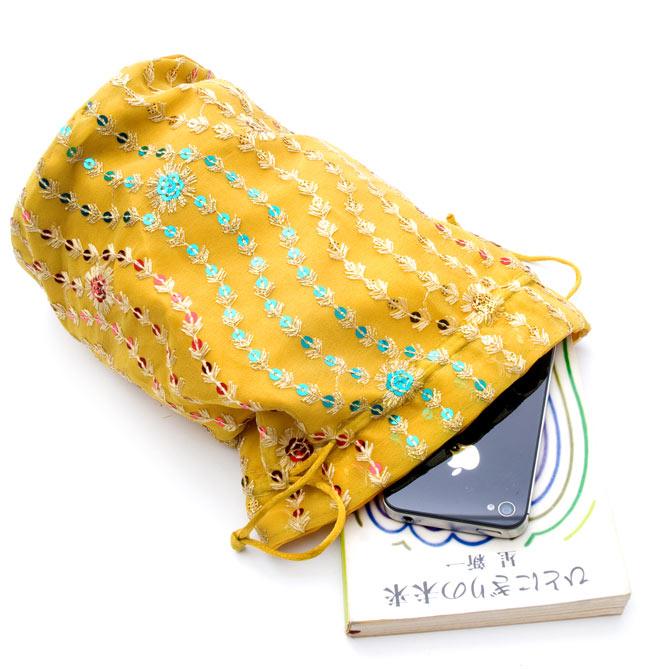 インドのきらきらミニバッグ・サリー等へオススメの巾着 フラワー更紗刺繍系