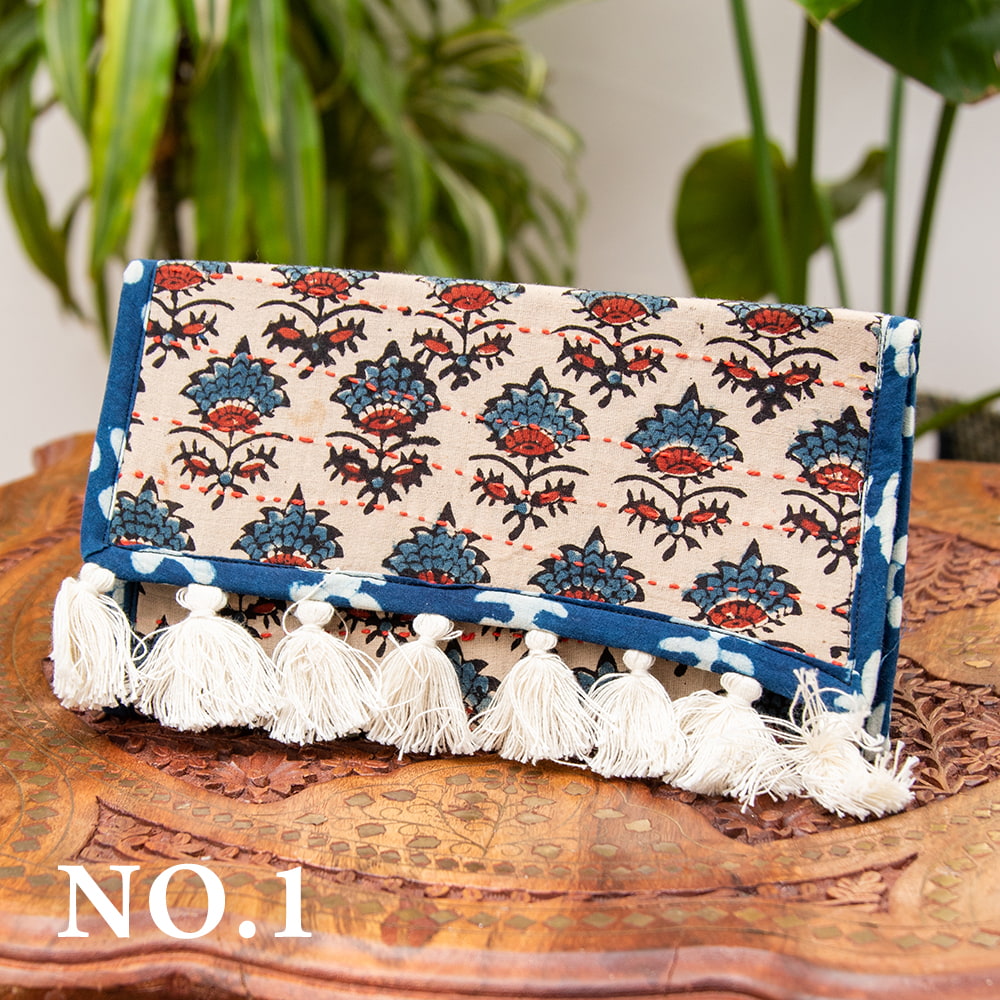 ウッドブロックとカンタ刺繍の伝統染めポーチ 大 ショルダータイプ 留め具訳あり 通販店