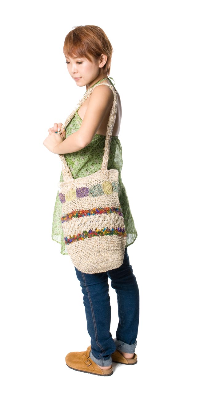 ショルダーバッグとして、斜めがけにしても良し、肩から下げてもOKです!また、丹念に編み上げられているので、丈夫で長持ちしてくれるでしょう。通勤時や通学などのカバンとしても長くご愛用して頂けるかと思います。