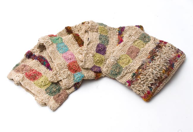 こちらは手編みで作られておりますので、一つ一つお色が異なっております。予めご了承の上、お買い求めくださいませ。色々な色の組み合わせですので、どんな服にも意外とマッチする優れ物です!コーディネートのワンポイントにいかがでしょうか?