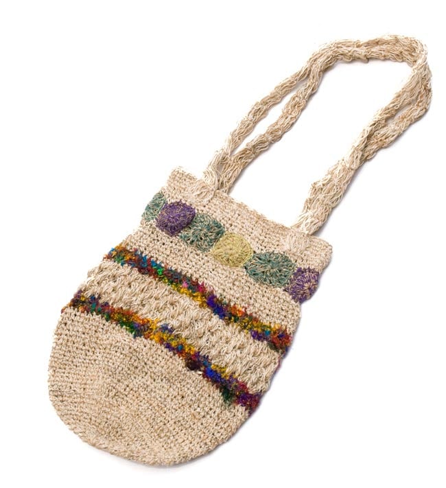 ヘンプとカラフルなコットン毛糸で編まれた可愛い形のハンドバッグです。