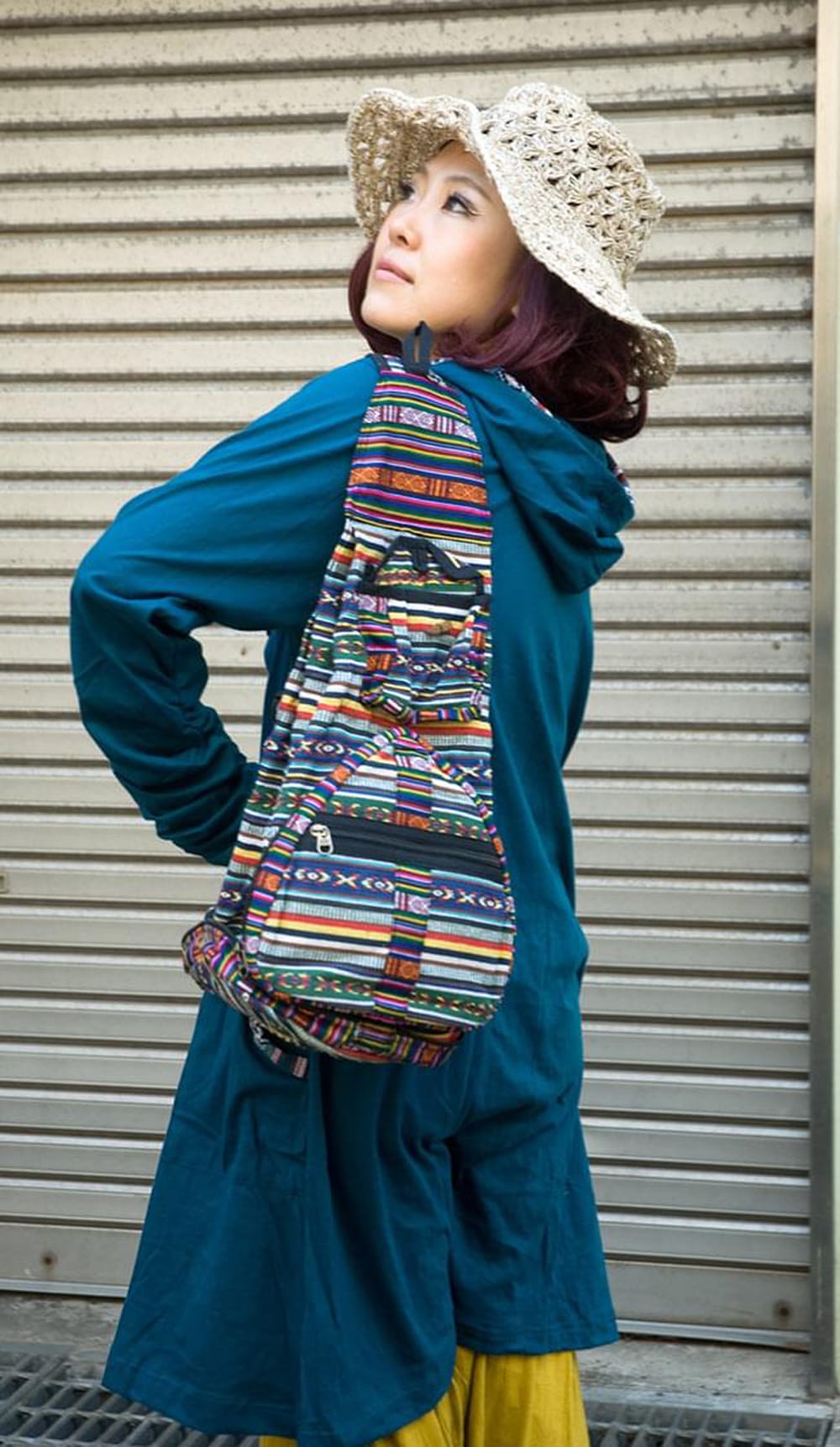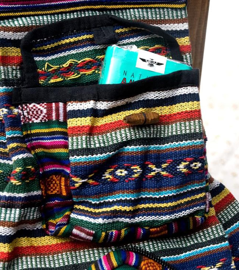 このバッグの布地はゲリと呼ばれる、ネパール独自の生地が使われています。カラフルなこの生地は、ネパールの人たちが自分たちが好きな色合いで作っているもので、太めの糸で織られた温かみのある風合いです。ちょっと粗めの生地ですのでワイルドな雰囲気にもピッタリです。| サイズ | 鞄本体のサイズ縦:全長:約40cm 横:約20cm マチ:約23cm |