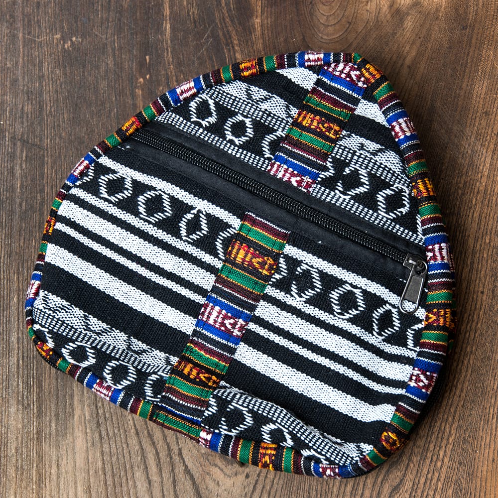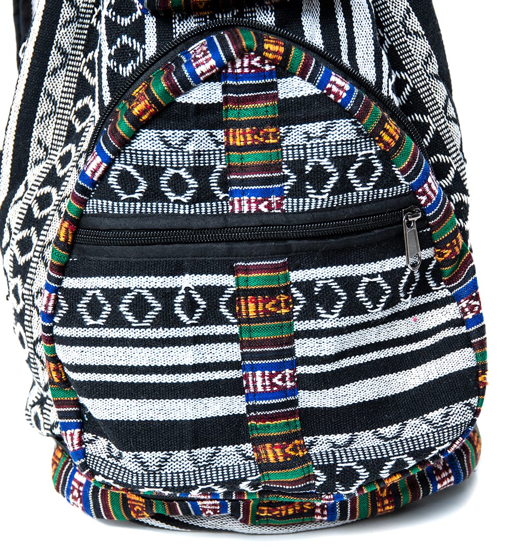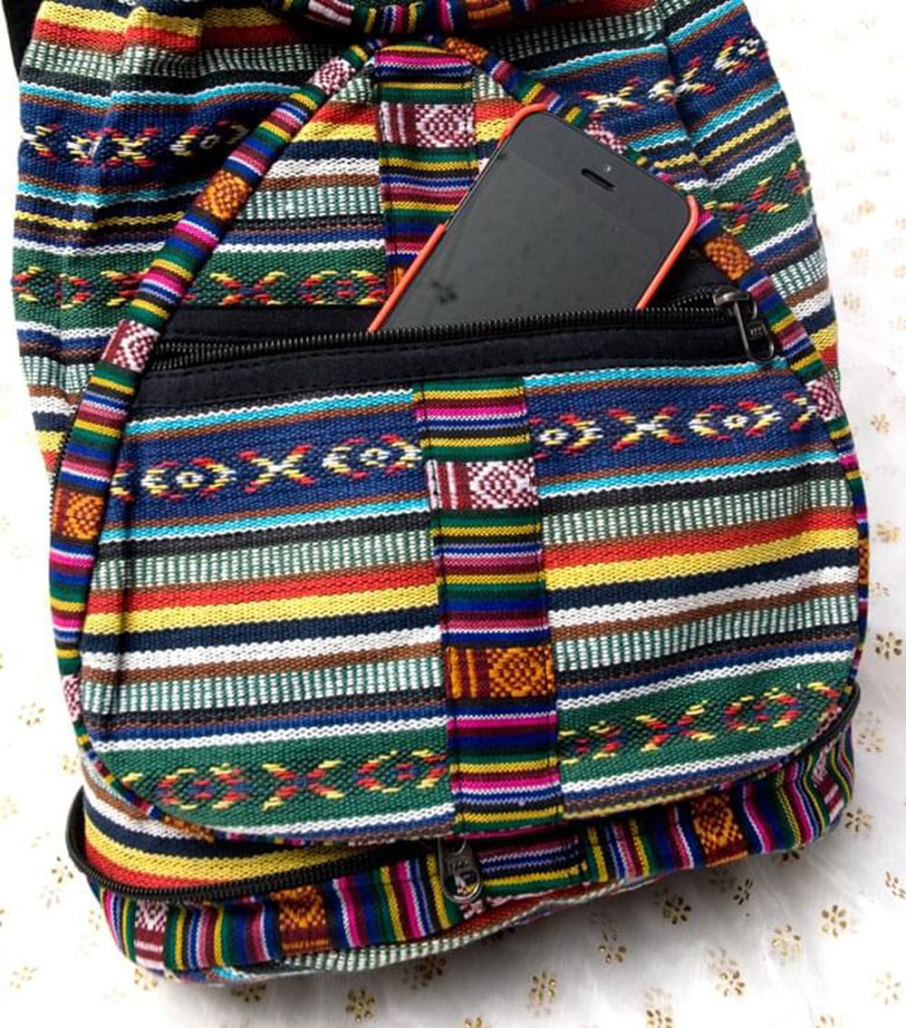 折りたたみ式のバックパックがネパールからやって来ました。折りたたまれた形はまさにおにぎり!三角形が可愛いコンパクトなバックパックです。周りがジップになってますので、ジップを開ければあっという間にバックパックに早変わり。細長い三角形が特徴的です。前面に小さなポケットが2つ、背中面に大きなジップがあります。小さく見えて意外と容量がありますよ。バッグをいくつも持たない旅先のサブバックとしても便利に使えそうです。■ゲリと呼ばれるネパール独自の織物■