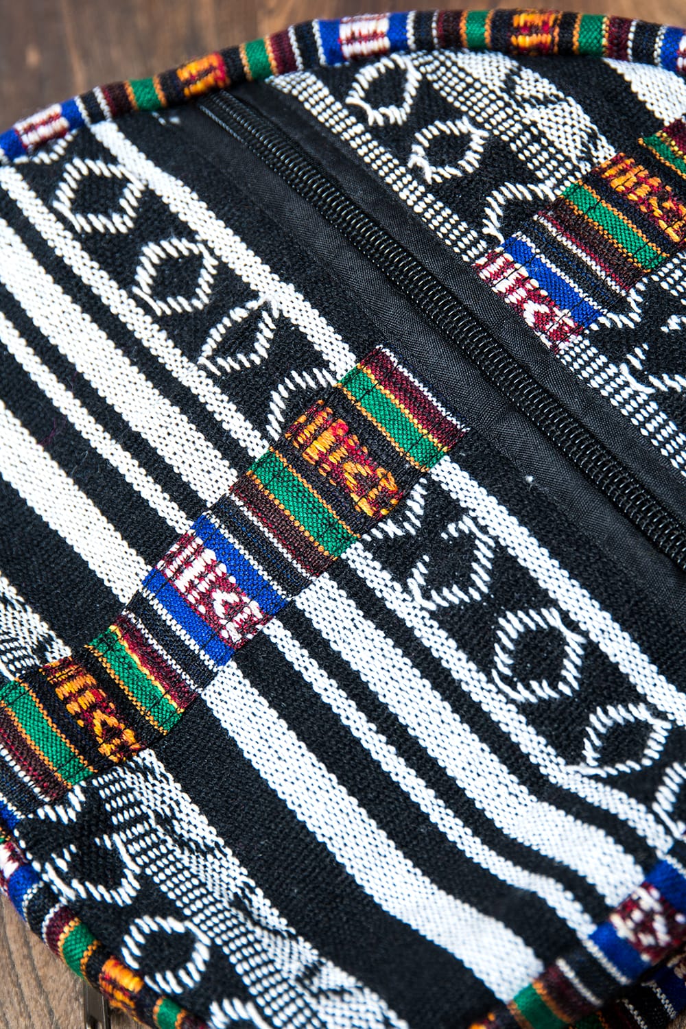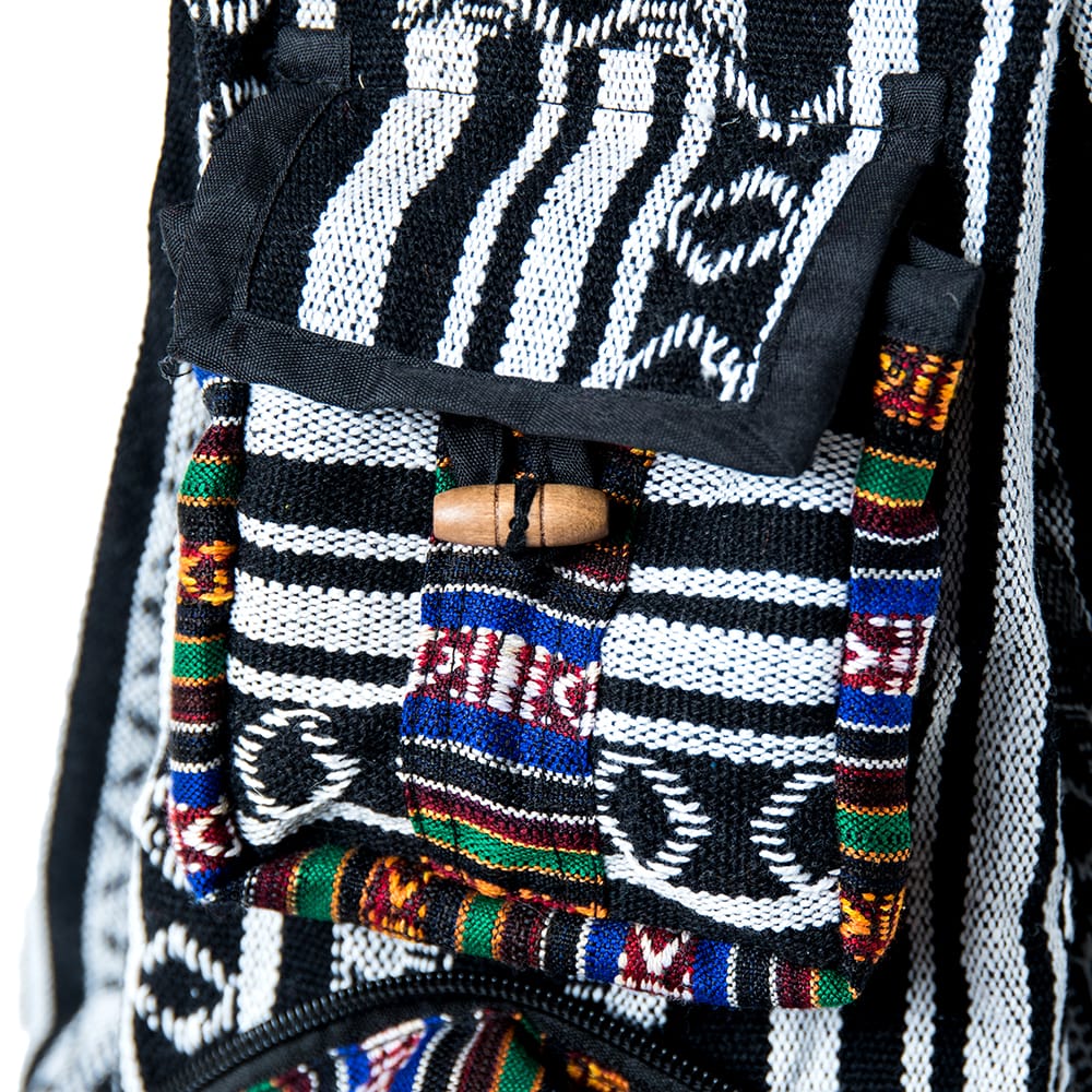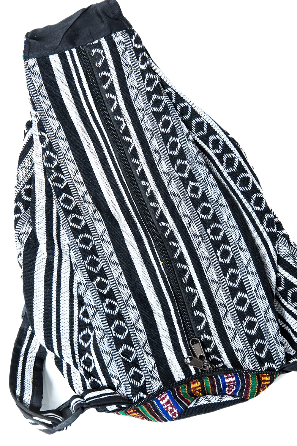 折りたたみ式のバックパックがネパールからやって来ました。折りたたまれた形はまさにおにぎり!三角形が可愛いコンパクトなバックパックです。周りがジップになってますので、ジップを開ければあっという間にバックパックに早変わり。細長い三角形が特徴的です。前面に小さなポケットが2つ、背中面に大きなジップがあります。小さく見えて意外と容量がありますよ。バッグをいくつも持たない旅先のサブバックとしても便利に使えそうです。■ゲリと呼ばれるネパール独自の織物■
