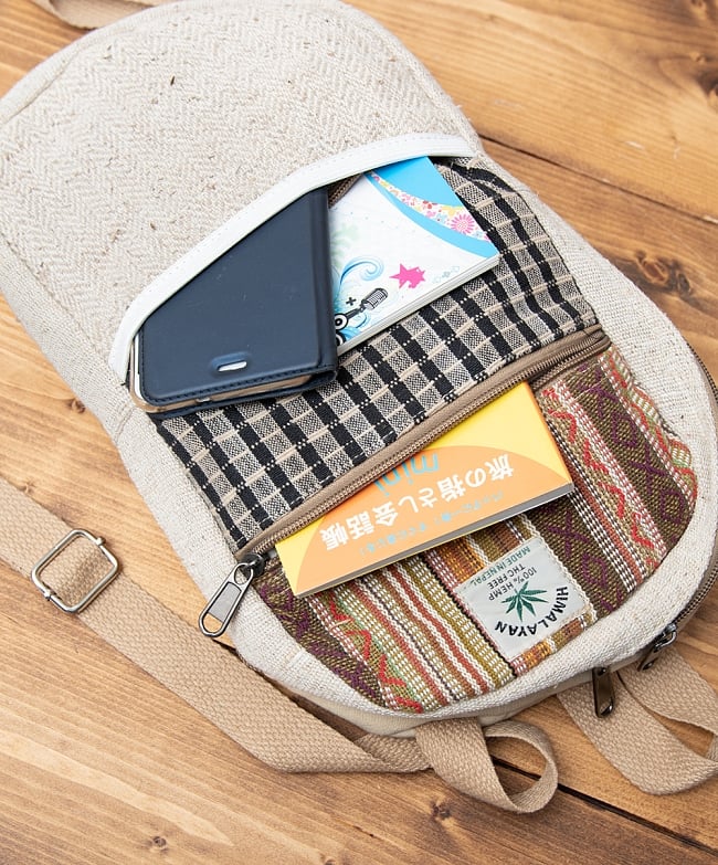ネパール独特のコットン布、ゲリ生地が用いられていてアクセントになっています。HIMALAYAN HEMPとかわいいロゴも付いています。